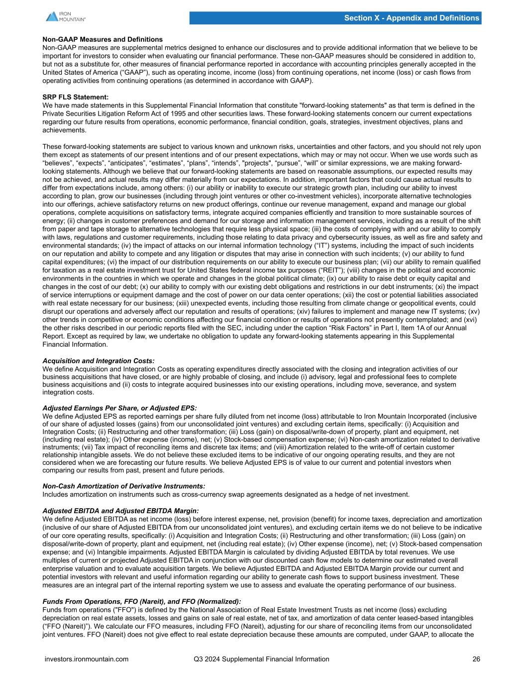Non-GAAP Measures and Definitions Non-GAAP measures are supplemental metrics designed to enhance our disclosures and to provide additional information that we believe to be important for investors to consider when evaluating our financial performance. These non-GAAP measures should be considered in addition to, but not as a substitute for, other measures of financial performance reported in accordance with accounting principles generally accepted in the United States of America (“GAAP”), such as operating income, income (loss) from continuing operations, net income (loss) or cash flows from operating activities from continuing operations (as determined in accordance with GAAP). SRP FLS Statement: We have made statements in this Supplemental Financial Information that constitute "forward-looking statements" as that term is defined in the Private Securities Litigation Reform Act of 1995 and other securities laws. These forward-looking statements concern our current expectations regarding our future results from operations, economic performance, financial condition, goals, strategies, investment objectives, plans and achievements. These forward-looking statements are subject to various known and unknown risks, uncertainties and other factors, and you should not rely upon them except as statements of our present intentions and of our present expectations, which may or may not occur. When we use words such as “believes”, “expects”, “anticipates”, “estimates”, “plans”, “intends”, "projects", “pursue”, “will” or similar expressions, we are making forward- looking statements. Although we believe that our forward-looking statements are based on reasonable assumptions, our expected results may not be achieved, and actual results may differ materially from our expectations. In addition, important factors that could cause actual results to differ from expectations include, among others: (i) our ability or inability to execute our strategic growth plan, including our ability to invest according to plan, grow our businesses (including through joint ventures or other co-investment vehicles), incorporate alternative technologies into our offerings, achieve satisfactory returns on new product offerings, continue our revenue management, expand and manage our global operations, complete acquisitions on satisfactory terms, integrate acquired companies efficiently and transition to more sustainable sources of energy; (ii) changes in customer preferences and demand for our storage and information management services, including as a result of the shift from paper and tape storage to alternative technologies that require less physical space; (iii) the costs of complying with and our ability to comply with laws, regulations and customer requirements, including those relating to data privacy and cybersecurity issues, as well as fire and safety and environmental standards; (iv) the impact of attacks on our internal information technology (“IT”) systems, including the impact of such incidents on our reputation and ability to compete and any litigation or disputes that may arise in connection with such incidents; (v) our ability to fund capital expenditures; (vi) the impact of our distribution requirements on our ability to execute our business plan; (vii) our ability to remain qualified for taxation as a real estate investment trust for United States federal income tax purposes (“REIT”); (viii) changes in the political and economic environments in the countries in which we operate and changes in the global political climate; (ix) our ability to raise debt or equity capital and changes in the cost of our debt; (x) our ability to comply with our existing debt obligations and restrictions in our debt instruments; (xi) the impact of service interruptions or equipment damage and the cost of power on our data center operations; (xii) the cost or potential liabilities associated with real estate necessary for our business; (xiii) unexpected events, including those resulting from climate change or geopolitical events, could disrupt our operations and adversely affect our reputation and results of operations; (xiv) failures to implement and manage new IT systems; (xv) other trends in competitive or economic conditions affecting our financial condition or results of operations not presently contemplated; and (xvi) the other risks described in our periodic reports filed with the SEC, including under the caption “Risk Factors” in Part I, Item 1A of our Annual Report. Except as required by law, we undertake no obligation to update any forward-looking statements appearing in this Supplemental Financial Information. Acquisition and Integration Costs: We define Acquisition and Integration Costs as operating expenditures directly associated with the closing and integration activities of our business acquisitions that have closed, or are highly probable of closing, and include (i) advisory, legal and professional fees to complete business acquisitions and (ii) costs to integrate acquired businesses into our existing operations, including move, severance, and system integration costs. Adjusted Earnings Per Share, or Adjusted EPS: We define Adjusted EPS as reported earnings per share fully diluted from net income (loss) attributable to Iron Mountain Incorporated (inclusive of our share of adjusted losses (gains) from our unconsolidated joint ventures) and excluding certain items, specifically: (i) Acquisition and Integration Costs; (ii) Restructuring and other transformation; (iii) Loss (gain) on disposal/write-down of property, plant and equipment, net (including real estate); (iv) Other expense (income), net; (v) Stock-based compensation expense; (vi) Non-cash amortization related to derivative instruments; (vii) Tax impact of reconciling items and discrete tax items; and (viii) Amortization related to the write-off of certain customer relationship intangible assets. We do not believe 