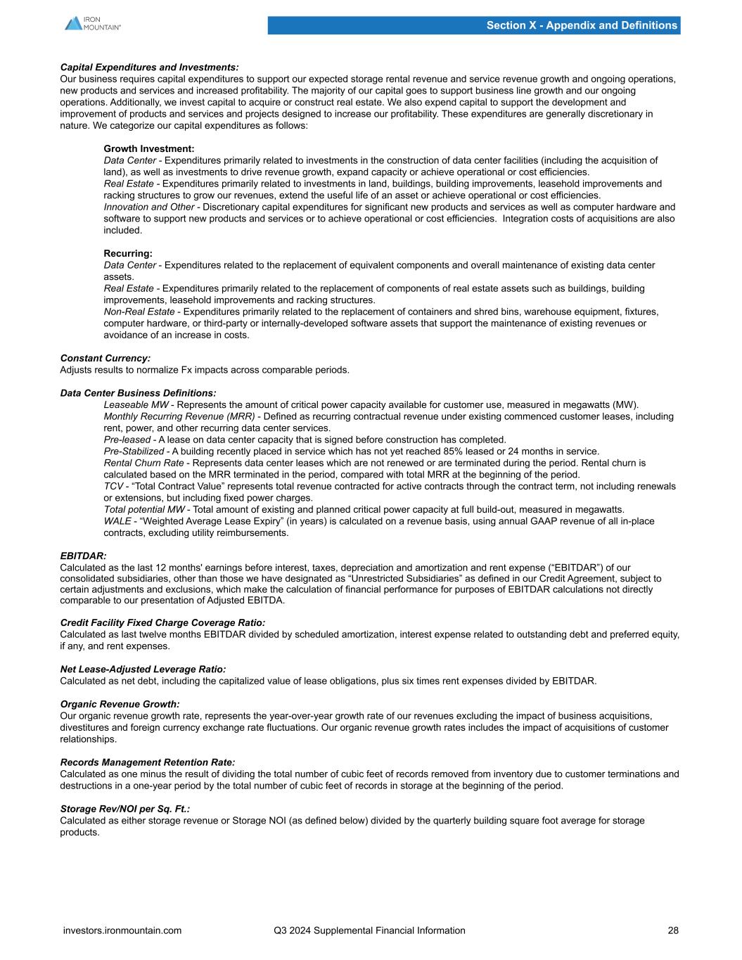 Capital Expenditures and Investments: Our business requires capital expenditures to support our expected storage rental revenue and service revenue growth and ongoing operations, new products and services and increased profitability. The majority of our capital goes to support business line growth and our ongoing operations. Additionally, we invest capital to acquire or construct real estate. We also expend capital to support the development and improvement of products and services and projects designed to increase our profitability. These expenditures are generally discretionary in nature. We categorize our capital expenditures as follows: Growth Investment: Data Center - Expenditures primarily related to investments in the construction of data center facilities (including the acquisition of land), as well as investments to drive revenue growth, expand capacity or achieve operational or cost efficiencies. Real Estate - Expenditures primarily related to investments in land, buildings, building improvements, leasehold improvements and racking structures to grow our revenues, extend the useful life of an asset or achieve operational or cost efficiencies. Innovation and Other - Discretionary capital expenditures for significant new products and services as well as computer hardware and software to support new products and services or to achieve operational or cost efficiencies. Integration costs of acquisitions are also included. Recurring: Data Center - Expenditures related to the replacement of equivalent components and overall maintenance of existing data center assets. Real Estate - Expenditures primarily related to the replacement of components of real estate assets such as buildings, building improvements, leasehold improvements and racking structures. Non-Real Estate - Expenditures primarily related to the replacement of containers and shred bins, warehouse equipment, fixtures, computer hardware, or third-party or internally-developed software assets that support the maintenance of existing revenues or avoidance of an increase in costs. Constant Currency: Adjusts results to normalize Fx impacts across comparable periods. Data Center Business Definitions: Leaseable MW - Represents the amount of critical power capacity available for customer use, measured in megawatts (MW). Monthly Recurring Revenue (MRR) - Defined as recurring contractual revenue under existing commenced customer leases, including rent, power, and other recurring data center services. Pre-leased - A lease on data center capacity that is signed before construction has completed. Pre-Stabilized - A building recently placed in service which has not yet reached 85% leased or 24 months in service. Rental Churn Rate - Represents data center leases which are not renewed or are terminated during the period. Rental churn is calculated based on the MRR terminated in the period, compared with total MRR at the beginning of the period. TCV - “Total Contract Value” represents total revenue contracted for active contracts through the contract term, not including renewals or extensions, but including fixed power charges. Total potential MW - Total amount of existing and planned critical power capacity at full build-out, measured in megawatts. WALE - “Weighted Average Lease Expiry” (in years) is calculated on a revenue basis, using annual GAAP revenue of all in-place contracts, excluding utility reimbursements. EBITDAR: Calculated as the last 12 months' earnings before interest, taxes, depreciation and amortization and rent expense (“EBITDAR”) of our consolidated subsidiaries, other than those we have designated as “Unrestricted Subsidiaries” as defined in our Credit Agreement, subject to certain adjustments and exclusions, which make the calculation of financial performance for purposes of EBITDAR calculations not directly comparable to our presentation of Adjusted EBITDA. Credit Facility Fixed Charge Coverage Ratio: Calculated as last twelve months EBITDAR divided by scheduled amortization, interest expense related to outstanding debt and preferred equity, if any, and rent expenses. Net Lease-Adjusted Leverage Ratio: Calculated as net debt, including the capitalized value of lease obligations, plus six times rent expenses divided by EBITDAR. Organic Revenue Growth: Our organic revenue growth rate, represents the year-over-year growth rate of our revenues excluding the impact of business acquisitions, divestitures and foreign currency exchange rate fluctuations. Our organic revenue growth rates includes the impact of acquisitions of customer relationships. Records Management Retention Rate: Calculated as one minus the result of dividing the total number of cubic feet of records removed from inventory due to customer terminations and destructions in a one-year period by the total number of cubic feet of records in storage at the beginning of the period. Storage Rev/NOI per Sq. Ft.: Calculated as either storage revenue or Storage NOI (as defined below) divided by the quarterly building square foot average for storage products. Section X - Appendix and Definitions investors.ironmountain.com Q3 2024 Supplemental Financial Information 28