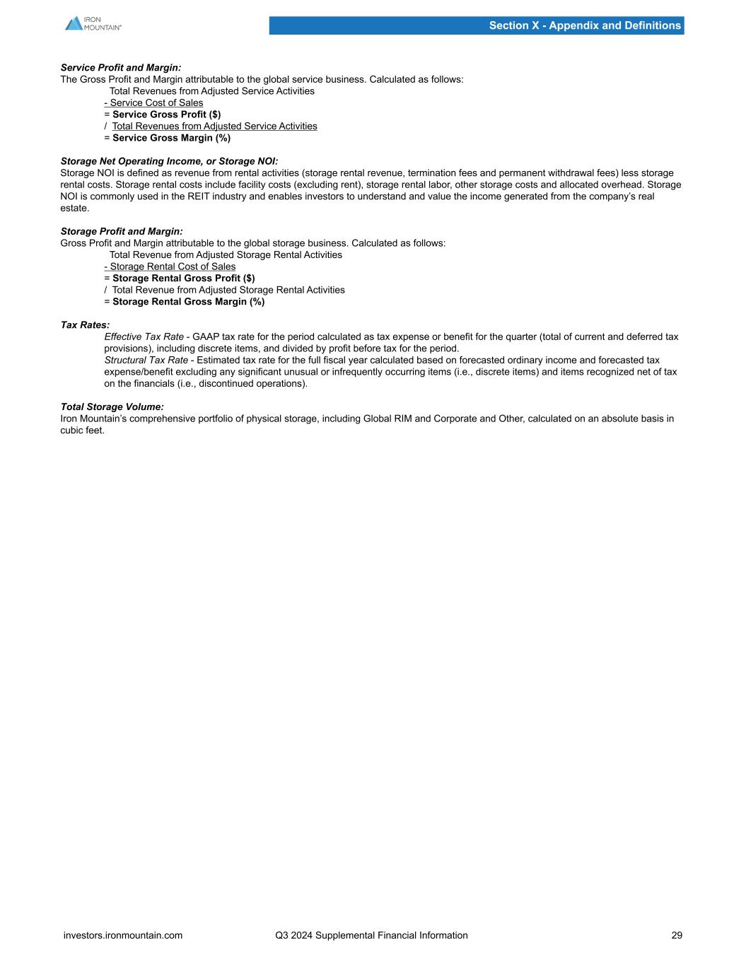 Service Profit and Margin: The Gross Profit and Margin attributable to the global service business. Calculated as follows: Total Revenues from Adjusted Service Activities - Service Cost of Sales = Service Gross Profit ($) / Total Revenues from Adjusted Service Activities = Service Gross Margin (%) Storage Net Operating Income, or Storage NOI: Storage NOI is defined as revenue from rental activities (storage rental revenue, termination fees and permanent withdrawal fees) less storage rental costs. Storage rental costs include facility costs (excluding rent), storage rental labor, other storage costs and allocated overhead. Storage NOI is commonly used in the REIT industry and enables investors to understand and value the income generated from the company’s real estate. Storage Profit and Margin: Gross Profit and Margin attributable to the global storage business. Calculated as follows: Total Revenue from Adjusted Storage Rental Activities - Storage Rental Cost of Sales = Storage Rental Gross Profit ($) / Total Revenue from Adjusted Storage Rental Activities = Storage Rental Gross Margin (%) Tax Rates: Effective Tax Rate - GAAP tax rate for the period calculated as tax expense or benefit for the quarter (total of current and deferred tax provisions), including discrete items, and divided by profit before tax for the period. Structural Tax Rate - Estimated tax rate for the full fiscal year calculated based on forecasted ordinary income and forecasted tax expense/benefit excluding any significant unusual or infrequently occurring items (i.e., discrete items) and items recognized net of tax on the financials (i.e., discontinued operations). Total Storage Volume: Iron Mountain’s comprehensive portfolio of physical storage, including Global RIM and Corporate and Other, calculated on an absolute basis in cubic feet. Section X - Appendix and Definitions investors.ironmountain.com Q3 2024 Supplemental Financial Information 29