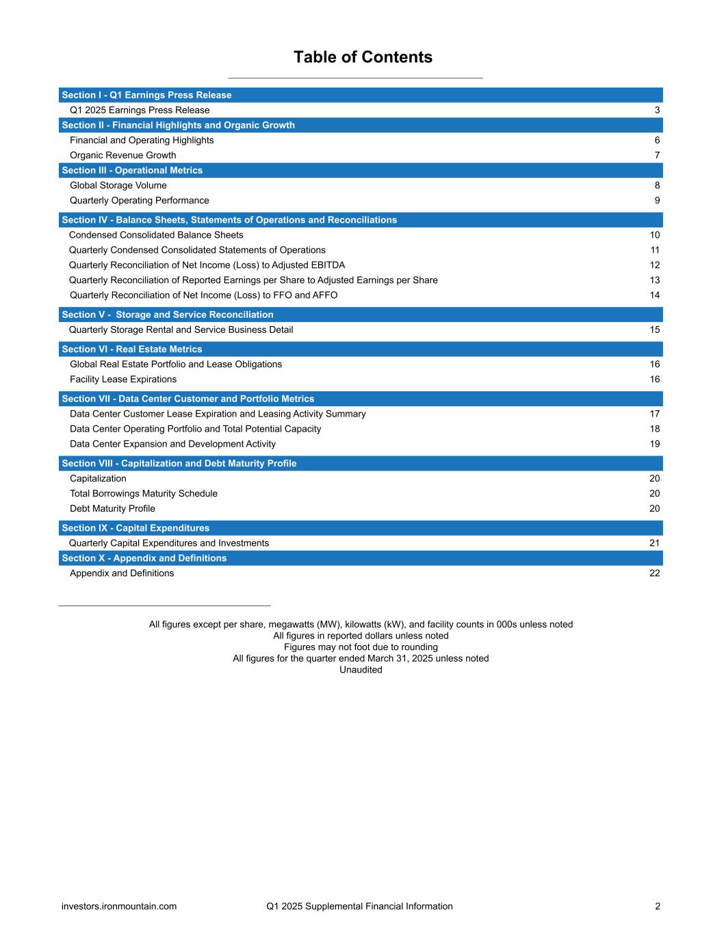 Table of Contents Section I - Q1 Earnings Press Release Q1 2025 Earnings Press Release 3 Section II - Financial Highlights and Organic Growth Financial and Operating Highlights 6 Organic Revenue Growth 7 Section III - Operational Metrics Global Storage Volume 8 Quarterly Operating Performance 9 Section IV - Balance Sheets, Statements of Operations and Reconciliations Condensed Consolidated Balance Sheets 10 Quarterly Condensed Consolidated Statements of Operations 11 Quarterly Reconciliation of Net Income (Loss) to Adjusted EBITDA 12 Quarterly Reconciliation of Reported Earnings per Share to Adjusted Earnings per Share 13 Quarterly Reconciliation of Net Income (Loss) to FFO and AFFO 14 Section V - Storage and Service Reconciliation Quarterly Storage Rental and Service Business Detail 15 Section VI - Real Estate Metrics Global Real Estate Portfolio and Lease Obligations 16 Facility Lease Expirations 16 Section VII - Data Center Customer and Portfolio Metrics Data Center Customer Lease Expiration and Leasing Activity Summary 17 Data Center Operating Portfolio and Total Potential Capacity 18 Data Center Expansion and Development Activity 19 Section VIII - Capitalization and Debt Maturity Profile Capitalization 20 Total Borrowings Maturity Schedule 20 Debt Maturity Profile 20 Section IX - Capital Expenditures Quarterly Capital Expenditures and Investments 21 Section X - Appendix and Definitions Appendix and Definitions 22 All figures except per share, megawatts (MW), kilowatts (kW), and facility counts in 000s unless noted All figures in reported dollars unless noted Figures may not foot due to rounding All figures for the quarter ended March 31, 2025 unless noted Unaudited investors.ironmountain.com Q1 2025 Supplemental Financial Information 2