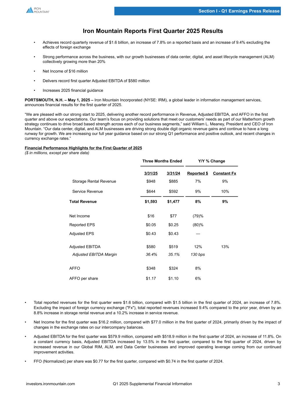 Iron Mountain Reports First Quarter 2025 Results • Achieves record quarterly revenue of $1.6 billion, an increase of 7.8% on a reported basis and an increase of 9.4% excluding the effects of foreign exchange • Strong performance across the business, with our growth businesses of data center, digital, and asset lifecycle management (ALM) collectively growing more than 20% • Net Income of $16 million • Delivers record first quarter Adjusted EBITDA of $580 million • Increases 2025 financial guidance PORTSMOUTH, N.H. – May 1, 2025 – Iron Mountain Incorporated (NYSE: IRM), a global leader in information management services, announces financial results for the first quarter of 2025. “We are pleased with our strong start to 2025, delivering another record performance in Revenue, Adjusted EBITDA, and AFFO in the first quarter and above our expectations. Our team’s focus on providing solutions that meet our customers’ needs as part of our Matterhorn growth strategy continues to drive broad based strength across each of our business segments,” said William L. Meaney, President and CEO of Iron Mountain. “Our data center, digital, and ALM businesses are driving strong double digit organic revenue gains and continue to have a long runway for growth. We are increasing our full year guidance based on our strong Q1 performance and positive outlook, and recent changes in currency exchange rates.” Financial Performance Highlights for the First Quarter of 2025 ($ in millions, except per share data) Three Months Ended Y/Y % Change 3/31/25 3/31/24 Reported $ Constant Fx Storage Rental Revenue $948 $885 7% 9% Service Revenue $644 $592 9% 10% Total Revenue $1,593 $1,477 8% 9% Net Income $16 $77 (79)% Reported EPS $0.05 $0.25 (80)% Adjusted EPS $0.43 $0.43 — Adjusted EBITDA $580 $519 12% 13% Adjusted EBITDA Margin 36.4% 35.1% 130 bps AFFO $348 $324 8% AFFO per share $1.17 $1.10 6% • Total reported revenues for the first quarter were $1.6 billion, compared with $1.5 billion in the first quarter of 2024, an increase of 7.8%. Excluding the impact of foreign currency exchange ("Fx"), total reported revenues increased 9.4% compared to the prior year, driven by an 8.8% increase in storage rental revenue and a 10.2% increase in service revenue. • Net Income for the first quarter was $16.2 million, compared with $77.0 million in the first quarter of 2024, primarily driven by the impact of changes in the exchange rates on our intercompany balances. • Adjusted EBITDA for the first quarter was $579.9 million, compared with $518.9 million in the first quarter of 2024, an increase of 11.8%. On a constant currency basis, Adjusted EBITDA increased by 13.5% in the first quarter, compared to the first quarter of 2024, driven by increased revenue in our Global RIM, ALM, and Data Center businesses and improved operating leverage coming from our continued improvement activities. • FFO (Normalized) per share was $0.77 for the first quarter, compared with $0.74 in the first quarter of 2024. Section I - Q1 Earnings Press Release investors.ironmountain.com Q1 2025 Supplemental Financial Information 3