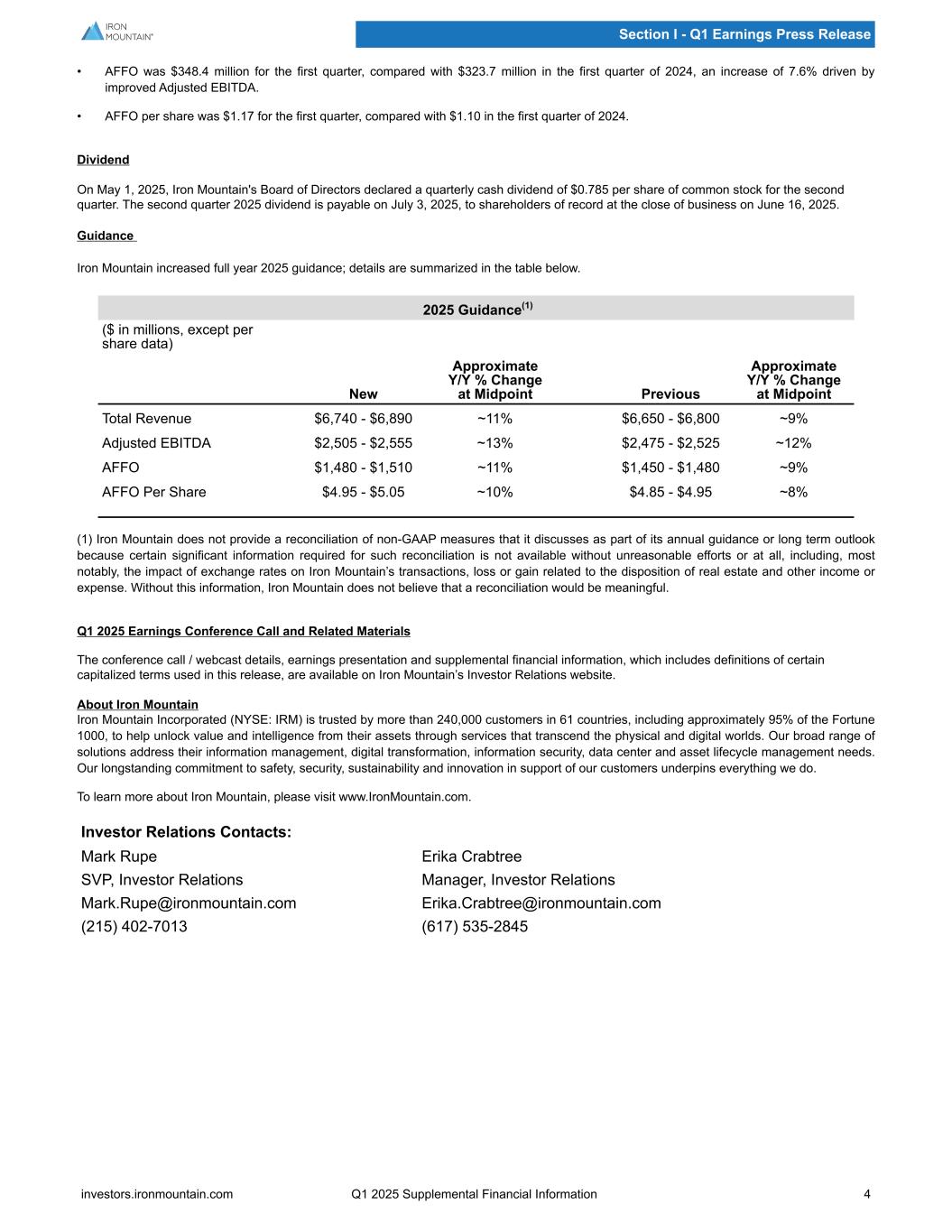 • AFFO was $348.4 million for the first quarter, compared with $323.7 million in the first quarter of 2024, an increase of 7.6% driven by improved Adjusted EBITDA. • AFFO per share was $1.17 for the first quarter, compared with $1.10 in the first quarter of 2024. Dividend On May 1, 2025, Iron Mountain's Board of Directors declared a quarterly cash dividend of $0.785 per share of common stock for the second quarter. The second quarter 2025 dividend is payable on July 3, 2025, to shareholders of record at the close of business on June 16, 2025. Guidance Iron Mountain increased full year 2025 guidance; details are summarized in the table below. 2025 Guidance(1) ($ in millions, except per share data) New Approximate Y/Y % Change at Midpoint Previous Approximate Y/Y % Change at Midpoint Total Revenue $6,740 - $6,890 ~11% $6,650 - $6,800 ~9% Adjusted EBITDA $2,505 - $2,555 ~13% $2,475 - $2,525 ~12% AFFO $1,480 - $1,510 ~11% $1,450 - $1,480 ~9% AFFO Per Share $4.95 - $5.05 ~10% $4.85 - $4.95 ~8% (1) Iron Mountain does not provide a reconciliation of non-GAAP measures that it discusses as part of its annual guidance or long term outlook because certain significant information required for such reconciliation is not available without unreasonable efforts or at all, including, most notably, the impact of exchange rates on Iron Mountain’s transactions, loss or gain related to the disposition of real estate and other income or expense. Without this information, Iron Mountain does not believe that a reconciliation would be meaningful. Q1 2025 Earnings Conference Call and Related Materials The conference call / webcast details, earnings presentation and supplemental financial information, which includes definitions of certain capitalized terms used in this release, are available on Iron Mountain’s Investor Relations website. About Iron Mountain Iron Mountain Incorporated (NYSE: IRM) is trusted by more than 240,000 customers in 61 countries, including approximately 95% of the Fortune 1000, to help unlock value and intelligence from their assets through services that transcend the physical and digital worlds. Our broad range of solutions address their information management, digital transformation, information security, data center and asset lifecycle management needs. Our longstanding commitment to safety, security, sustainability and innovation in support of our customers underpins everything we do. To learn more about Iron Mountain, please visit www.IronMountain.com. Investor Relations Contacts: Mark Rupe Erika Crabtree SVP, Investor Relations Manager, Investor Relations Mark.Rupe@ironmountain.com Erika.Crabtree@ironmountain.com (215) 402-7013 (617) 535-2845 Section I - Q1 Earnings Press Release investors.ironmountain.com Q1 2025 Supplemental Financial Information 4