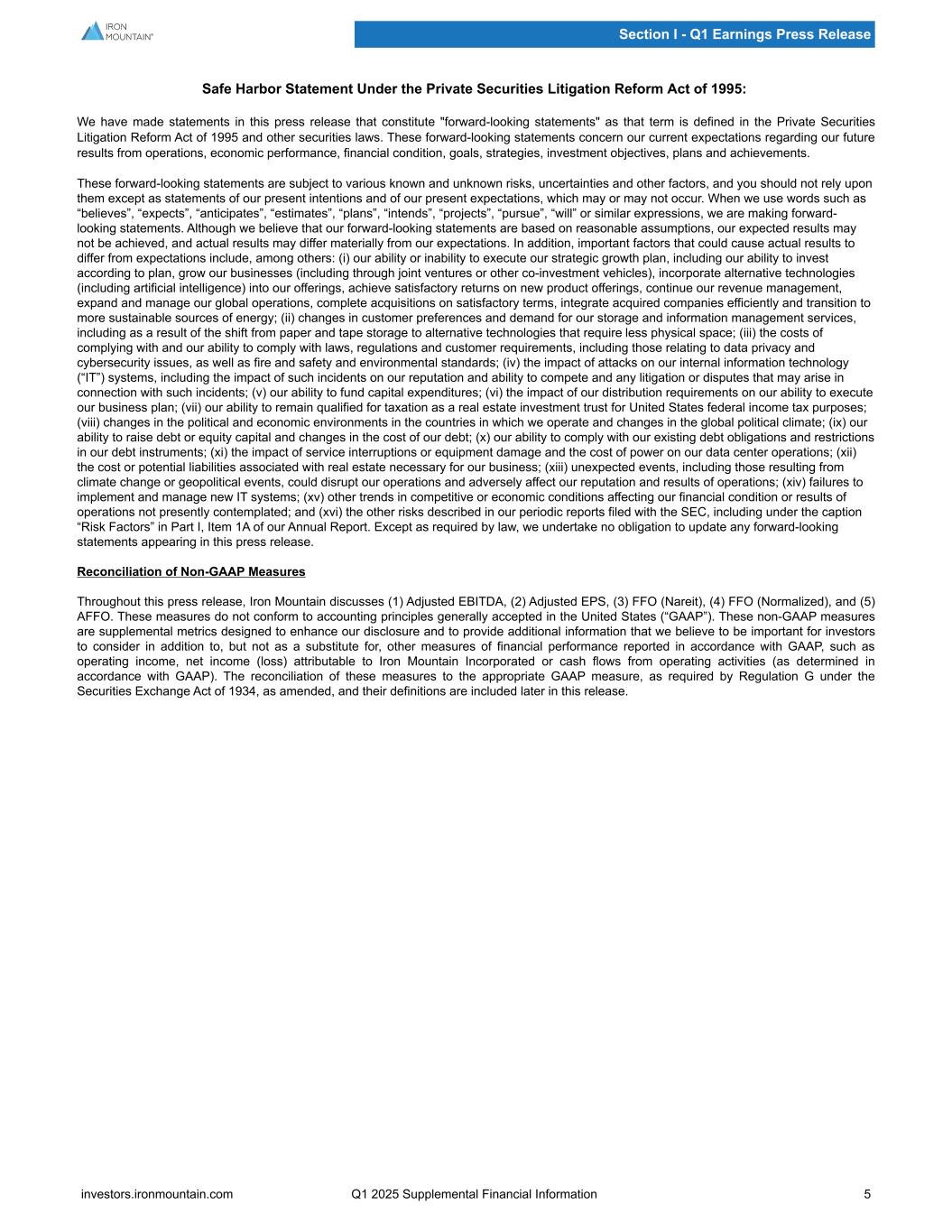 Safe Harbor Statement Under the Private Securities Litigation Reform Act of 1995: We have made statements in this press release that constitute "forward-looking statements" as that term is defined in the Private Securities Litigation Reform Act of 1995 and other securities laws. These forward-looking statements concern our current expectations regarding our future results from operations, economic performance, financial condition, goals, strategies, investment objectives, plans and achievements. These forward-looking statements are subject to various known and unknown risks, uncertainties and other factors, and you should not rely upon them except as statements of our present intentions and of our present expectations, which may or may not occur. When we use words such as “believes”, “expects”, “anticipates”, “estimates”, “plans”, “intends”, “projects”, “pursue”, “will” or similar expressions, we are making forward- looking statements. Although we believe that our forward-looking statements are based on reasonable assumptions, our expected results may not be achieved, and actual results may differ materially from our expectations. In addition, important factors that could cause actual results to differ from expectations include, among others: (i) our ability or inability to execute our strategic growth plan, including our ability to invest according to plan, grow our businesses (including through joint ventures or other co-investment vehicles), incorporate alternative technologies (including artificial intelligence) into our offerings, achieve satisfactory returns on new product offerings, continue our revenue management, expand and manage our global operations, complete acquisitions on satisfactory terms, integrate acquired companies efficiently and transition to more sustainable sources of energy; (ii) changes in customer preferences and demand for our storage and information management services, including as a result of the shift from paper and tape storage to alternative technologies that require less physical space; (iii) the costs of complying with and our ability to comply with laws, regulations and customer requirements, including those relating to data privacy and cybersecurity issues, as well as fire and safety and environmental standards; (iv) the impact of attacks on our internal information technology (“IT”) systems, including the impact of such incidents on our reputation and ability to compete and any litigation or disputes that may arise in connection with such incidents; (v) our ability to fund capital expenditures; (vi) the impact of our distribution requirements on our ability to execute our business plan; (vii) our ability to remain qualified for taxation as a real estate investment trust for United States federal income tax purposes; (viii) changes in the political and economic environments in the countries in which we operate and changes in the global political climate; (ix) our ability to raise debt or equity capital and changes in the cost of our debt; (x) our ability to comply with our existing debt obligations and restrictions in our debt instruments; (xi) the impact of service interruptions or equipment damage and the cost of power on our data center operations; (xii) the cost or potential liabilities associated with real estate necessary for our business; (xiii) unexpected events, including those resulting from climate change or geopolitical events, could disrupt our operations and adversely affect our reputation and results of operations; (xiv) failures to implement and manage new IT systems; (xv) other trends in competitive or economic conditions affecting our financial condition or results of operations not presently contemplated; and (xvi) the other risks described in our periodic reports filed with the SEC, including under the caption “Risk Factors” in Part I, Item 1A of our Annual Report. Except as required by law, we undertake no obligation to update any forward-looking statements appearing in this press release. Reconciliation of Non-GAAP Measures Throughout this press release, Iron Mountain discusses (1) Adjusted EBITDA, (2) Adjusted EPS, (3) FFO (Nareit), (4) FFO (Normalized), and (5) AFFO. These measures do not conform to accounting principles generally accepted in the United States (“GAAP”). These non-GAAP measures are supplemental metrics designed to enhance our disclosure and to provide additional information that we believe to be important for investors to consider in addition to, but not as a substitute for, other measures of financial performance reported in accordance with GAAP, such as operating income, net income (loss) attributable to Iron Mountain Incorporated or cash flows from operating activities (as determined in accordance with GAAP). The reconciliation of these measures to the appropriate GAAP measure, as required by Regulation G under the Securities Exchange Act of 1934, as amended, and their definitions are included later in this release. Section I - Q1 Earnings Press Release investors.ironmountain.com Q1 2025 Supplemental Financial Information 5