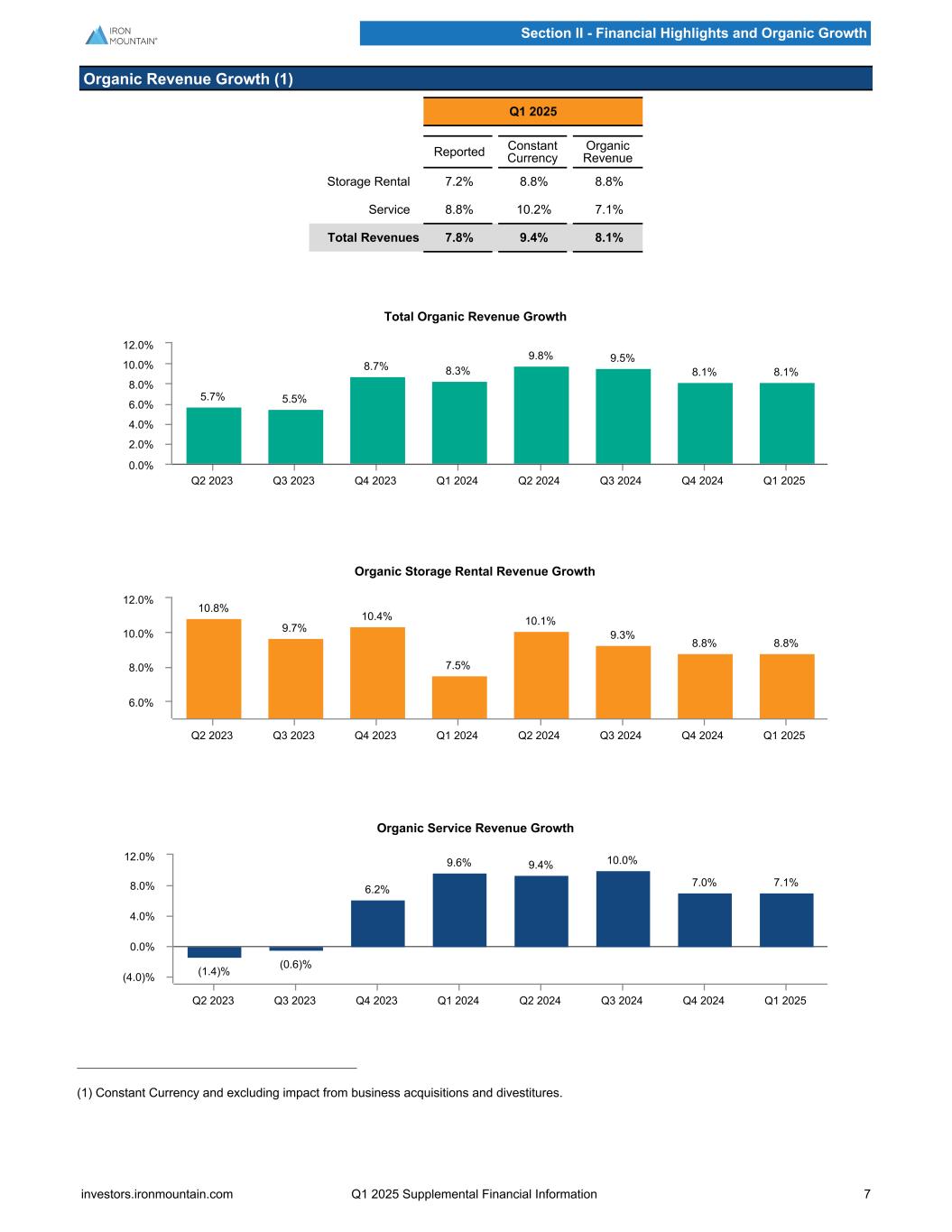 Financial Highlights Q1 2025 Q4 2024 Q3 2024 Q2 2024 Q1 2024 Storage Rental Revenue $948,376 $941,970 $935,701 $919,746 $884,842 Service Revenue $644,153 $639,309 $621,657 $614,663 $592,021 Total Revenues $1,592,529 $1,581,279 $1,557,358 $1,534,409 $1,476,863 Adjusted EBITDA $579,906 $605,051 $568,113 $544,361 $518,855 Adjusted EBITDA Margin 36.4 % 38.3 % 36.5 % 35.5 % 35.1 % Net Income (Loss) Attributable to Iron Mountain Incorporated $15,952 $103,932 $(33,620) $35,783 $74,061 Reported EPS - Fully Diluted $0.05 $0.35 ($0.11) $0.12 $0.25 Adjusted EPS $0.43 $0.50 $0.44 $0.42 $0.43 FFO (Normalized) $229,070 $252,468 $233,269 $231,021 $219,777 FFO (Normalized) per Share $0.77 $0.85 $0.79 $0.78 $0.74 AFFO $348,400 $367,986 $332,000 $320,901 $323,653 AFFO per Share $1.17 $1.24 $1.13 $1.08 $1.10 TTM AFFO Payout Ratio 62.0 % 60.0 % 60.3 % 60.3 % 61.0 % Dividend per Share $0.79 $0.72 $0.72 $0.65 $0.65 Weighted Average Common Shares Outstanding - Diluted 297,260 297,201 293,603 295,838 295,221 Net Lease-Adjusted Leverage Ratio 5.0x 5.0x 5.0x 5.0x 5.1x Operating Highlights Q1 2025 Q4 2024 Q3 2024 Q2 2024 Q1 2024 Organic Storage Rental Revenue Growth 8.8 % 8.8 % 9.3 % 10.1 % 7.5 % Organic Service Revenue Growth 7.1 % 7.0 % 10.0 % 9.4 % 9.6 % Total Volume - Storage 734,166 733,571 732,997 732,607 732,031 Storage Facility Capacity Utilization 79.9 % 79.6 % 79.4 % 79.2 % 79.2 % Records Management Retention Rate 92.9 % 92.6 % 92.7 % 92.8 % 92.9 % Storage Revenue / Sq. Ft. $10.14 $10.07 $9.92 $9.74 $9.38 Storage NOI / Sq. Ft. $8.10 $8.14 $7.95 $7.75 $7.46 Data Center: Leasable Megawatts 424.2 416.2 364.7 265.7 261.4 Leased % - Stabilized 98.0 % 97.4 % 98.7 % 96.0 % 95.7 % Leased % - Total 96.1 % 95.5 % 96.8 % 93.5 % 94.0 % Kilowatts Leased - New/Expansion 3,700 9,664 9,205 66,493 30,449 Churn 0.3 % 4.4 % 0.5 % 1.2 % 0.9 % Number of Facilities 29 29 28 26 26 Number of Markets 21 21 21 21 21 Section II - Financial Highlights and Organic Growth investors.ironmountain.com Q1 2025 Supplemental Financial Information 6