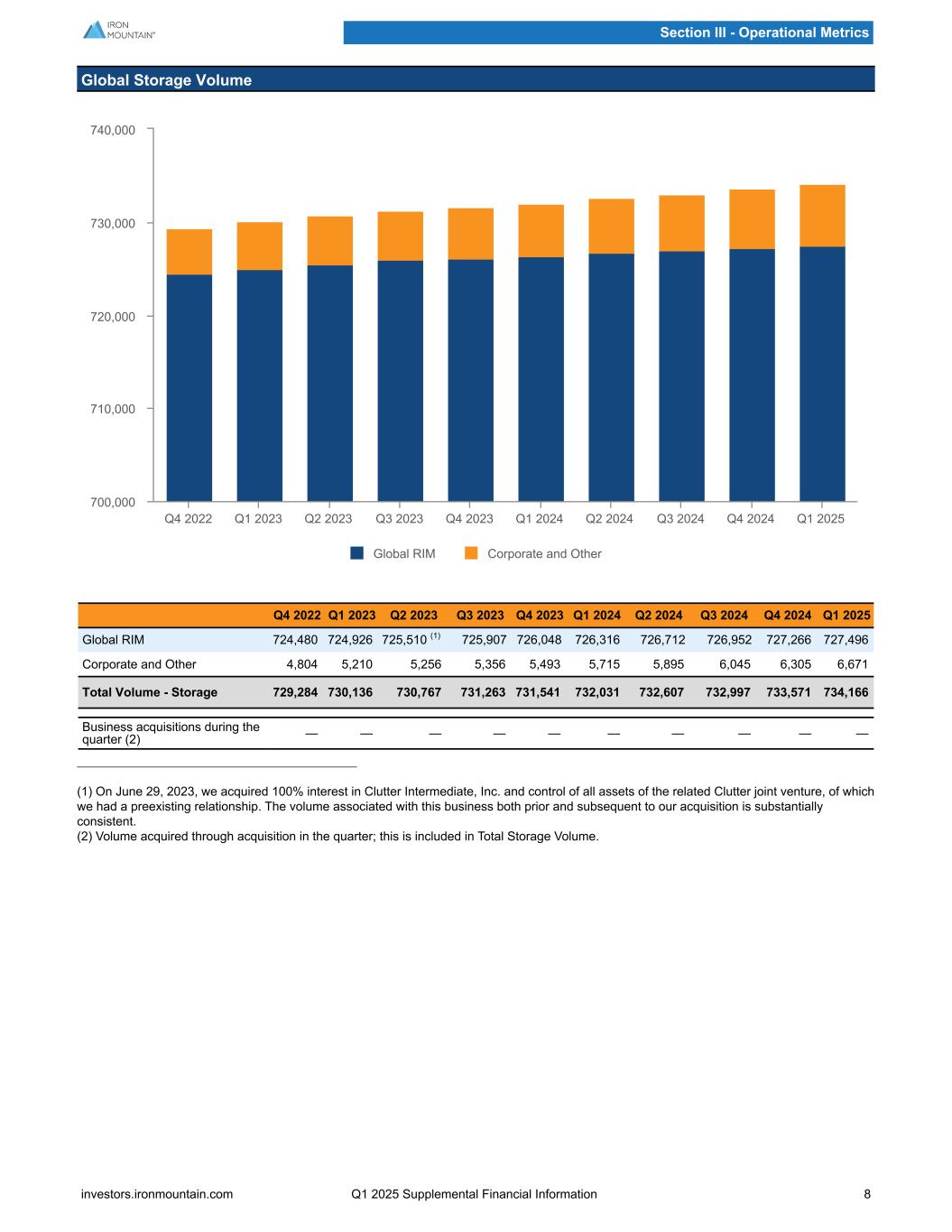 Global Storage Volume Global RIM Corporate and Other Q4 2022 Q1 2023 Q2 2023 Q3 2023 Q4 2023 Q1 2024 Q2 2024 Q3 2024 Q4 2024 Q1 2025 700,000 710,000 720,000 730,000 740,000 Q4 2022 Q1 2023 Q2 2023 Q3 2023 Q4 2023 Q1 2024 Q2 2024 Q3 2024 Q4 2024 Q1 2025 Global RIM 724,480 724,926 725,510 (1) 725,907 726,048 726,316 726,712 726,952 727,266 727,496 Corporate and Other 4,804 5,210 5,256 5,356 5,493 5,715 5,895 6,045 6,305 6,671 Total Volume - Storage 729,284 730,136 730,767 731,263 731,541 732,031 732,607 732,997 733,571 734,166 Business acquisitions during the quarter (2) — — — — — — — — — — (1) On June 29, 2023, we acquired 100% interest in Clutter Intermediate, Inc. and control of all assets of the related Clutter joint venture, of which we had a preexisting relationship. The volume associated with this business both prior and subsequent to our acquisition is substantially consistent. (2) Volume acquired through acquisition in the quarter; this is included in Total Storage Volume. Section III - Operational Metrics investors.ironmountain.com Q1 2025 Supplemental Financial Information 8