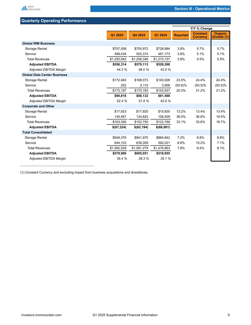 Quarterly Operating Performance Y/Y % Change Q1 2025 Q4 2024 Q1 2024 Reported Constant Currency Organic Growth (1) Global RIM Business Storage Rental $757,508 $755,972 $728,984 3.9% 5.7% 5.7% Service 498,434 502,374 481,173 3.6% 5.1% 5.1% Total Revenues $1,255,942 $1,258,346 $1,210,157 3.8% 5.5% 5.5% Adjusted EBITDA $556,314 $579,113 $526,268 Adjusted EBITDA Margin 44.3 % 46.0 % 43.5 % Global Data Center Business Storage Rental $172,945 $168,073 $140,028 23.5% 24.4% 24.4% Service 252 2,110 3,909 (93.6)% (93.5)% (93.5)% Total Revenues $173,197 $170,183 $143,937 20.3% 21.2% 21.2% Adjusted EBITDA $90,816 $88,132 $61,568 Adjusted EBITDA Margin 52.4 % 51.8 % 42.8 % Corporate and Other Storage Rental $17,923 $17,925 $15,830 13.2% 13.4% 13.4% Service 145,467 134,825 106,939 36.0% 36.6% 19.5% Total Revenues $163,390 $152,750 $122,769 33.1% 33.6% 18.7% Adjusted EBITDA $(67,224) $(62,194) $(68,981) Total Consolidated Storage Rental $948,376 $941,970 $884,842 7.2% 8.8% 8.8% Service 644,153 639,309 592,021 8.8% 10.2% 7.1% Total Revenues $1,592,529 $1,581,279 $1,476,863 7.8% 9.4% 8.1% Adjusted EBITDA $579,906 $605,051 $518,855 Adjusted EBITDA Margin 36.4 % 38.3 % 35.1 % (1) Constant Currency and excluding impact from business acquisitions and divestitures. Section III - Operational Metrics investors.ironmountain.com Q1 2025 Supplemental Financial Information 9