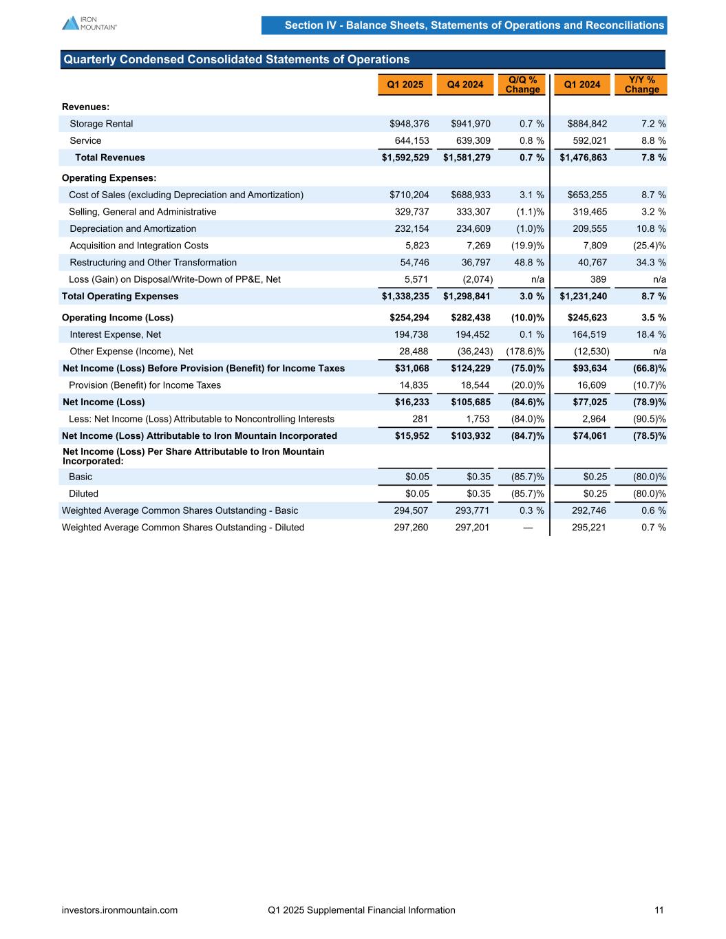 Quarterly Condensed Consolidated Statements of Operations Q1 2025 Q4 2024 Q/Q % Change Q1 2024 Y/Y % Change Revenues: Storage Rental $948,376 $941,970 0.7 % $884,842 7.2 % Service 644,153 639,309 0.8 % 592,021 8.8 % Total Revenues $1,592,529 $1,581,279 0.7 % $1,476,863 7.8 % Operating Expenses: Cost of Sales (excluding Depreciation and Amortization) $710,204 $688,933 3.1 % $653,255 8.7 % Selling, General and Administrative 329,737 333,307 (1.1) % 319,465 3.2 % Depreciation and Amortization 232,154 234,609 (1.0) % 209,555 10.8 % Acquisition and Integration Costs 5,823 7,269 (19.9) % 7,809 (25.4) % Restructuring and Other Transformation 54,746 36,797 48.8 % 40,767 34.3 % Loss (Gain) on Disposal/Write-Down of PP&E, Net 5,571 (2,074) n/a 389 n/a Total Operating Expenses $1,338,235 $1,298,841 3.0 % $1,231,240 8.7 % Operating Income (Loss) $254,294 $282,438 (10.0) % $245,623 3.5 % Interest Expense, Net 194,738 194,452 0.1 % 164,519 18.4 % Other Expense (Income), Net 28,488 (36,243) (178.6) % (12,530) n/a Net Income (Loss) Before Provision (Benefit) for Income Taxes $31,068 $124,229 (75.0) % $93,634 (66.8) % Provision (Benefit) for Income Taxes 14,835 18,544 (20.0) % 16,609 (10.7) % Net Income (Loss) $16,233 $105,685 (84.6) % $77,025 (78.9) % Less: Net Income (Loss) Attributable to Noncontrolling Interests 281 1,753 (84.0) % 2,964 (90.5) % Net Income (Loss) Attributable to Iron Mountain Incorporated $15,952 $103,932 (84.7) % $74,061 (78.5) % Net Income (Loss) Per Share Attributable to Iron Mountain Incorporated: Basic $0.05 $0.35 (85.7) % $0.25 (80.0) % Diluted $0.05 $0.35 (85.7) % $0.25 (80.0) % Weighted Average Common Shares Outstanding - Basic 294,507 293,771 0.3 % 292,746 0.6 % Weighted Average Common Shares Outstanding - Diluted 297,260 297,201 — 295,221 0.7 % Section IV - Balance Sheets, Statements of Operations and Reconciliations investors.ironmountain.com Q1 2025 Supplemental Financial Information 11