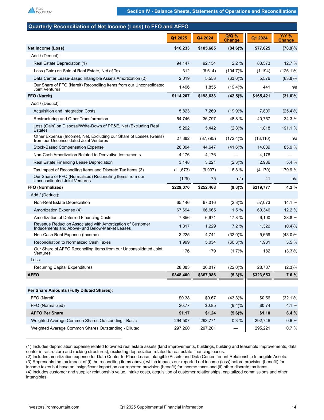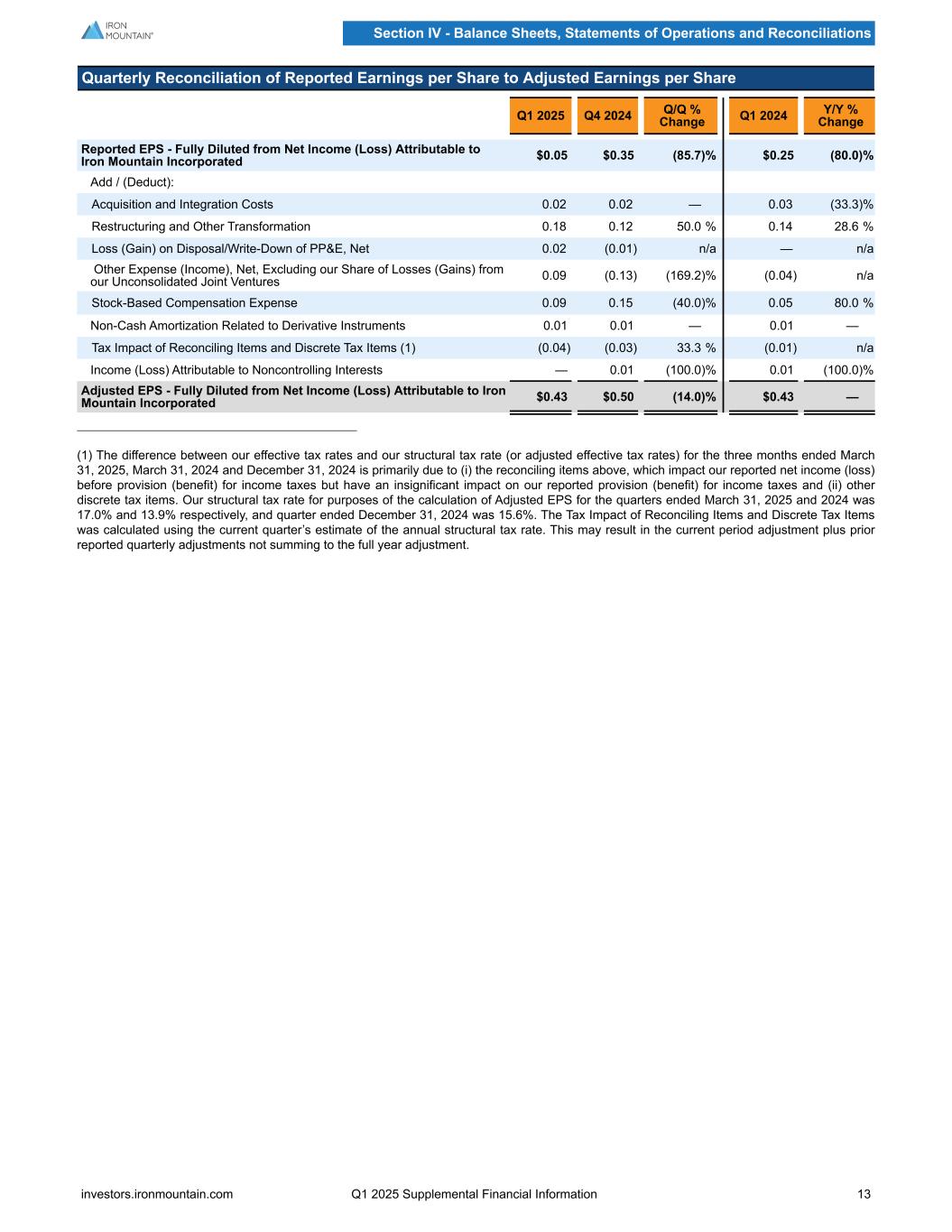 Quarterly Reconciliation of Reported Earnings per Share to Adjusted Earnings per Share Q1 2025 Q4 2024 Q/Q % Change Q1 2024 Y/Y % Change Reported EPS - Fully Diluted from Net Income (Loss) Attributable to Iron Mountain Incorporated $0.05 $0.35 (85.7) % $0.25 (80.0) % Add / (Deduct): Acquisition and Integration Costs 0.02 0.02 — 0.03 (33.3) % Restructuring and Other Transformation 0.18 0.12 50.0 % 0.14 28.6 % Loss (Gain) on Disposal/Write-Down of PP&E, Net 0.02 (0.01) n/a — n/a Other Expense (Income), Net, Excluding our Share of Losses (Gains) from our Unconsolidated Joint Ventures 0.09 (0.13) (169.2) % (0.04) n/a Stock-Based Compensation Expense 0.09 0.15 (40.0) % 0.05 80.0 % Non-Cash Amortization Related to Derivative Instruments 0.01 0.01 — 0.01 — Tax Impact of Reconciling Items and Discrete Tax Items (1) (0.04) (0.03) 33.3 % (0.01) n/a Income (Loss) Attributable to Noncontrolling Interests — 0.01 (100.0) % 0.01 (100.0) % Adjusted EPS - Fully Diluted from Net Income (Loss) Attributable to Iron Mountain Incorporated $0.43 $0.50 (14.0) % $0.43 — (1) The difference between our effective tax rates and our structural tax rate (or adjusted effective tax rates) for the three months ended March 31, 2025, March 31, 2024 and December 31, 2024 is primarily due to (i) the reconciling items above, which impact our reported net income (loss) before provision (benefit) for income taxes but have an insignificant impact on our reported provision (benefit) for income taxes and (ii) other discrete tax items. Our structural tax rate for purposes of the calculation of Adjusted EPS for the quarters ended March 31, 2025 and 2024 was 17.0% and 13.9% respectively, and quarter ended December 31, 2024 was 15.6%. The Tax Impact of Reconciling Items and Discrete Tax Items was calculated using the current quarter’s estimate of the annual structural tax rate. This may result in the current period adjustment plus prior reported quarterly adjustments not summing to the full year adjustment. Section IV - Balance Sheets, Statements of Operations and Reconciliations investors.ironmountain.com Q1 2025 Supplemental Financial Information 13