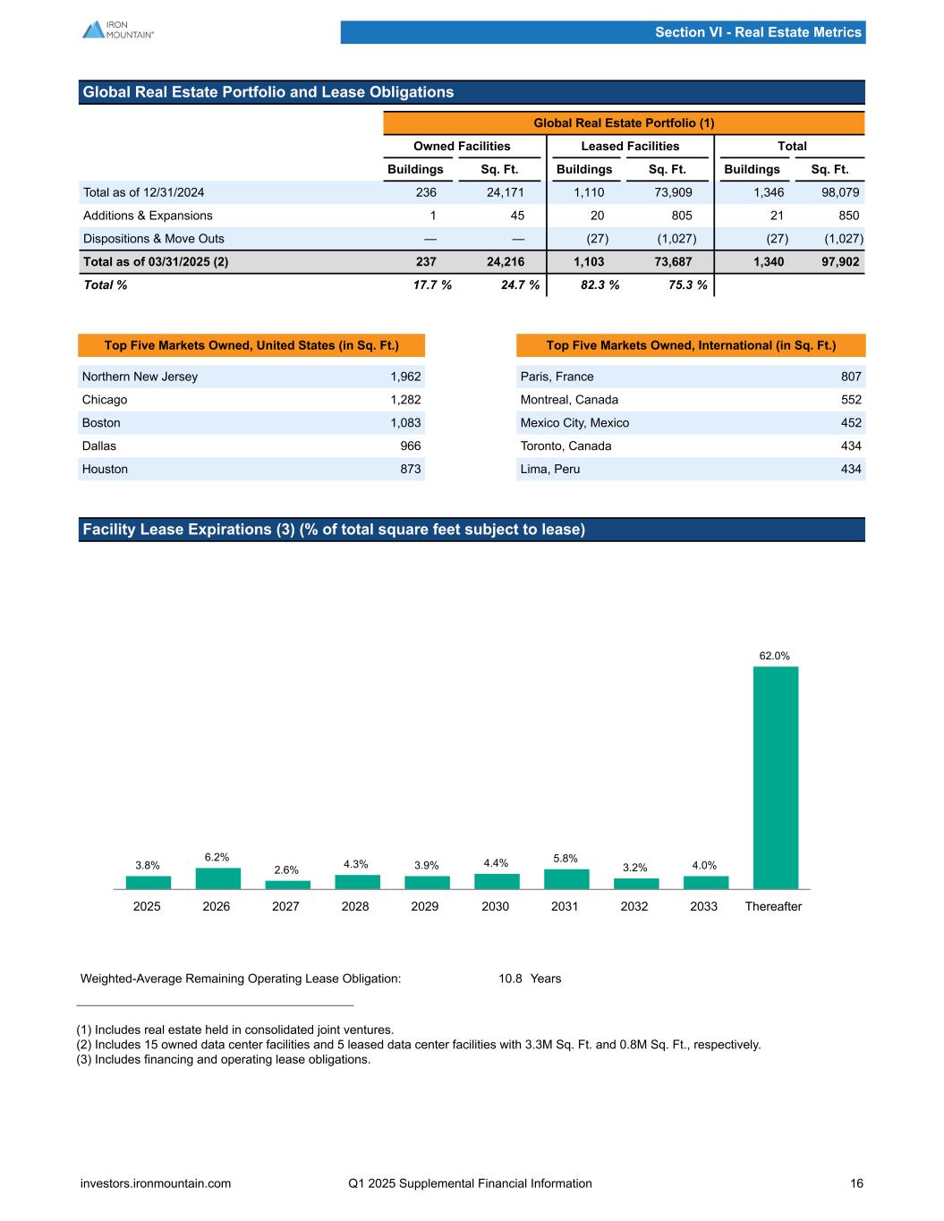 Global Real Estate Portfolio and Lease Obligations Global Real Estate Portfolio (1) Owned Facilities Leased Facilities Total Buildings Sq. Ft. Buildings Sq. Ft. Buildings Sq. Ft. Total as of 12/31/2024 236 24,171 1,110 73,909 1,346 98,079 Additions & Expansions 1 45 20 805 21 850 Dispositions & Move Outs — — (27) (1,027) (27) (1,027) Total as of 03/31/2025 (2) 237 24,216 1,103 73,687 1,340 97,902 Total % 17.7 % 24.7 % 82.3 % 75.3 % Top Five Markets Owned, United States (in Sq. Ft.) Top Five Markets Owned, International (in Sq. Ft.) Northern New Jersey 1,962 Paris, France 807 Chicago 1,282 Montreal, Canada 552 Boston 1,083 Mexico City, Mexico 452 Dallas 966 Toronto, Canada 434 Houston 873 Lima, Peru 434 Facility Lease Expirations (3) (% of total square feet subject to lease) 3.8% 6.2% 2.6% 4.3% 3.9% 4.4% 5.8% 3.2% 4.0% 62.0% 2025 2026 2027 2028 2029 2030 2031 2032 2033 Thereafter Weighted-Average Remaining Operating Lease Obligation: 10.8 Years (1) Includes real estate held in consolidated joint ventures. (2) Includes 15 owned data center facilities and 5 leased data center facilities with 3.3M Sq. Ft. and 0.8M Sq. Ft., respectively. (3) Includes financing and operating lease obligations. Section VI - Real Estate Metrics investors.ironmountain.com Q1 2025 Supplemental Financial Information 16