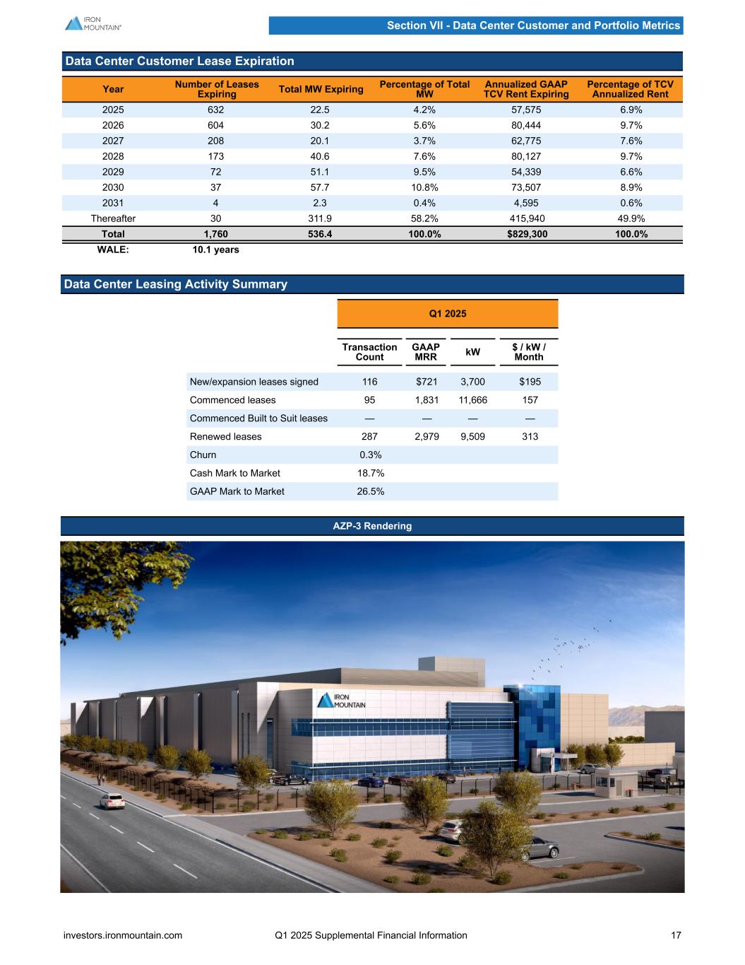 Data Center Customer Lease Expiration Year Number of Leases Expiring Total MW Expiring Percentage of Total MW Annualized GAAP TCV Rent Expiring Percentage of TCV Annualized Rent 2025 632 22.5 4.2% 57,575 6.9% 2026 604 30.2 5.6% 80,444 9.7% 2027 208 20.1 3.7% 62,775 7.6% 2028 173 40.6 7.6% 80,127 9.7% 2029 72 51.1 9.5% 54,339 6.6% 2030 37 57.7 10.8% 73,507 8.9% 2031 4 2.3 0.4% 4,595 0.6% Thereafter 30 311.9 58.2% 415,940 49.9% Total 1,760 536.4 100.0% $829,300 100.0% WALE: 10.1 years Data Center Leasing Activity Summary Q1 2025 Transaction Count GAAP MRR kW $ / kW / Month New/expansion leases signed 116 $721 3,700 $195 Commenced leases 95 1,831 11,666 157 Commenced Built to Suit leases — — — — Renewed leases 287 2,979 9,509 313 Churn 0.3% Cash Mark to Market 18.7% GAAP Mark to Market 26.5% AZP-3 Rendering Section VII - Data Center Customer and Portfolio Metrics investors.ironmountain.com Q1 2025 Supplemental Financial Information 17