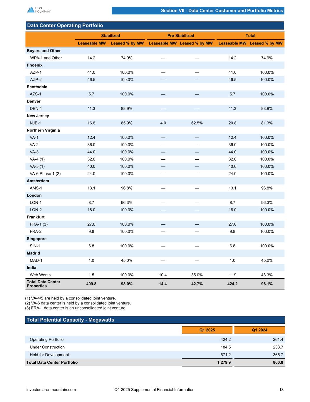 Data Center Operating Portfolio Stabilized Pre-Stabilized Total Leaseable MW Leased % by MW Leaseable MW Leased % by MW Leaseable MW Leased % by MW Boyers and Other WPA-1 and Other 14.2 74.9% — — 14.2 74.9% Phoenix AZP-1 41.0 100.0% — — 41.0 100.0% AZP-2 46.5 100.0% — — 46.5 100.0% Scottsdale AZS-1 5.7 100.0% — — 5.7 100.0% Denver DEN-1 11.3 88.9% — — 11.3 88.9% New Jersey NJE-1 16.8 85.9% 4.0 62.5% 20.8 81.3% Northern Virginia VA-1 12.4 100.0% — — 12.4 100.0% VA-2 36.0 100.0% — — 36.0 100.0% VA-3 44.0 100.0% — — 44.0 100.0% VA-4 (1) 32.0 100.0% — — 32.0 100.0% VA-5 (1) 40.0 100.0% — — 40.0 100.0% VA-6 Phase 1 (2) 24.0 100.0% — — 24.0 100.0% Amsterdam AMS-1 13.1 96.8% — — 13.1 96.8% London LON-1 8.7 96.3% — — 8.7 96.3% LON-2 18.0 100.0% — — 18.0 100.0% Frankfurt FRA-1 (3) 27.0 100.0% — — 27.0 100.0% FRA-2 9.8 100.0% — — 9.8 100.0% Singapore SIN-1 6.8 100.0% — — 6.8 100.0% Madrid MAD-1 1.0 45.0% — — 1.0 45.0% India Web Werks 1.5 100.0% 10.4 35.0% 11.9 43.3% Total Data Center Properties 409.8 98.0% 14.4 42.7% 424.2 96.1% (1) VA-4/5 are held by a consolidated joint venture. (2) VA-6 data center is held by a consolidated joint venture. (3) FRA-1 data center is an unconsolidated joint venture. Total Potential Capacity - Megawatts Q1 2025 Q1 2024 Operating Portfolio 424.2 261.4 Under Construction 184.5 233.7 Held for Development 671.2 365.7 Total Data Center Portfolio 1,279.9 860.8 Section VII - Data Center Customer and Portfolio Metrics investors.ironmountain.com Q1 2025 Supplemental Financial Information 18