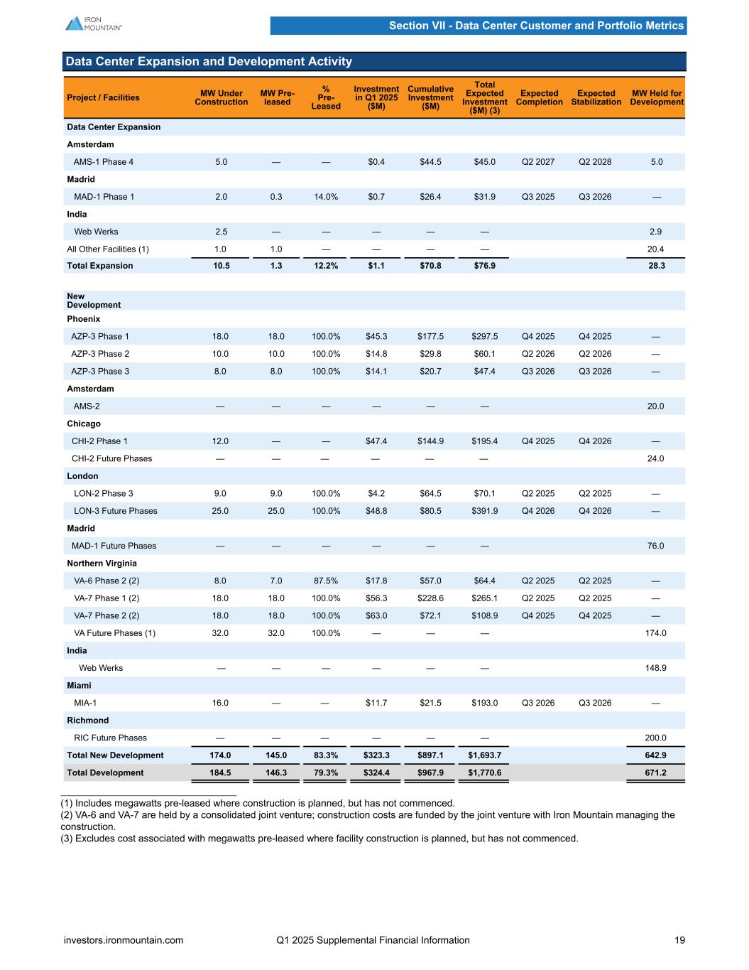 Data Center Expansion and Development Activity Project / Facilities MW Under Construction MW Pre- leased % Pre- Leased Investment in Q1 2025 ($M) Cumulative Investment ($M) Total Expected Investment ($M) (3) Expected Completion Expected Stabilization MW Held for Development Data Center Expansion Amsterdam AMS-1 Phase 4 5.0 — — $0.4 $44.5 $45.0 Q2 2027 Q2 2028 5.0 Madrid MAD-1 Phase 1 2.0 0.3 14.0% $0.7 $26.4 $31.9 Q3 2025 Q3 2026 — India Web Werks 2.5 — — — — — 2.9 All Other Facilities (1) 1.0 1.0 — — — — 20.4 Total Expansion 10.5 1.3 12.2% $1.1 $70.8 $76.9 28.3 New Development Phoenix AZP-3 Phase 1 18.0 18.0 100.0% $45.3 $177.5 $297.5 Q4 2025 Q4 2025 — AZP-3 Phase 2 10.0 10.0 100.0% $14.8 $29.8 $60.1 Q2 2026 Q2 2026 — AZP-3 Phase 3 8.0 8.0 100.0% $14.1 $20.7 $47.4 Q3 2026 Q3 2026 — Amsterdam AMS-2 — — — — — — 20.0 Chicago CHI-2 Phase 1 12.0 — — $47.4 $144.9 $195.4 Q4 2025 Q4 2026 — CHI-2 Future Phases — — — — — — 24.0 London LON-2 Phase 3 9.0 9.0 100.0% $4.2 $64.5 $70.1 Q2 2025 Q2 2025 — LON-3 Future Phases 25.0 25.0 100.0% $48.8 $80.5 $391.9 Q4 2026 Q4 2026 — Madrid MAD-1 Future Phases — — — — — — 76.0 Northern Virginia VA-6 Phase 2 (2) 8.0 7.0 87.5% $17.8 $57.0 $64.4 Q2 2025 Q2 2025 — VA-7 Phase 1 (2) 18.0 18.0 100.0% $56.3 $228.6 $265.1 Q2 2025 Q2 2025 — VA-7 Phase 2 (2) 18.0 18.0 100.0% $63.0 $72.1 $108.9 Q4 2025 Q4 2025 — VA Future Phases (1) 32.0 32.0 100.0% — — — 174.0 India Web Werks — — — — — — 148.9 Miami MIA-1 16.0 — — $11.7 $21.5 $193.0 Q3 2026 Q3 2026 — Richmond RIC Future Phases — — — — — — 200.0 Total New Development 174.0 145.0 83.3% $323.3 $897.1 $1,693.7 642.9 Total Development 184.5 146.3 79.3% $324.4 $967.9 $1,770.6 671.2 (1) Includes megawatts pre-leased where construction is planned, but has not commenced. (2) VA-6 and VA-7 are held by a consolidated joint venture; construction costs are funded by the joint venture with Iron Mountain managing the construction. (3) Excludes cost associated with megawatts pre-leased where facility construction is planned, but has not commenced. Section VII - Data Center Customer and Portfolio Metrics investors.ironmountain.com Q1 2025 Supplemental Financial Information 19