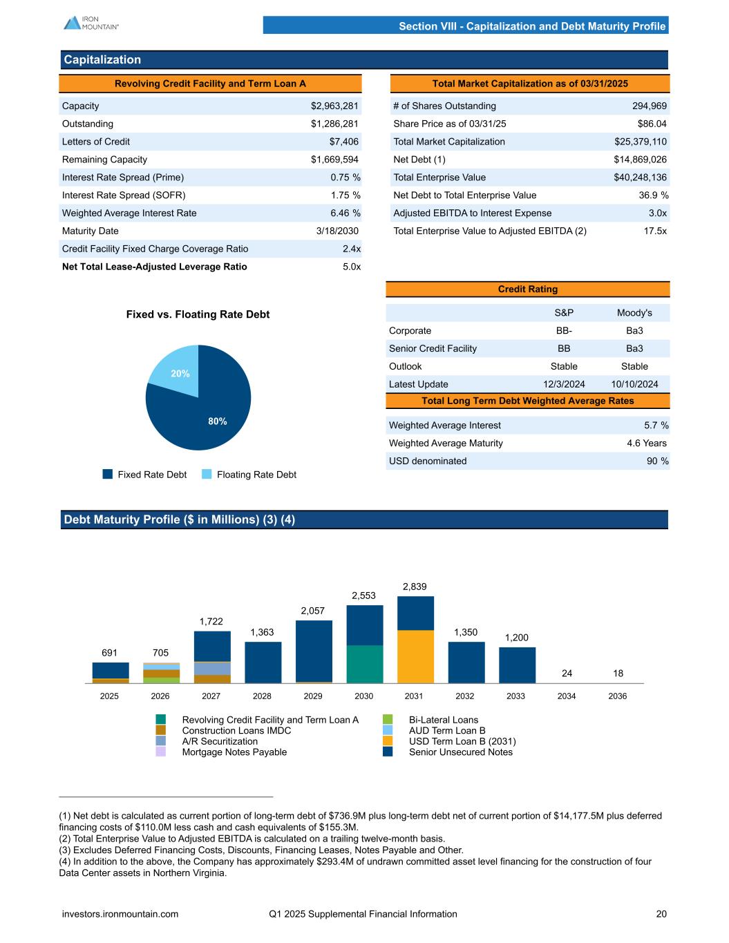 Capitalization Revolving Credit Facility and Term Loan A Total Market Capitalization as of 03/31/2025 Capacity $2,963,281 # of Shares Outstanding 294,969 Outstanding $1,286,281 Share Price as of 03/31/25 $86.04 Letters of Credit $7,406 Total Market Capitalization $25,379,110 Remaining Capacity $1,669,594 Net Debt (1) $14,869,026 Interest Rate Spread (Prime) 0.75 % Total Enterprise Value $40,248,136 Interest Rate Spread (SOFR) 1.75 % Net Debt to Total Enterprise Value 36.9 % Weighted Average Interest Rate 6.46 % Adjusted EBITDA to Interest Expense 3.0x Maturity Date 3/18/2030 Total Enterprise Value to Adjusted EBITDA (2) 17.5x Credit Facility Fixed Charge Coverage Ratio 2.4x Net Total Lease-Adjusted Leverage Ratio 5.0x Fixed vs. Floating Rate Debt 80% 20% Fixed Rate Debt Floating Rate Debt Credit Rating S&P Moody's Corporate BB- Ba3 Senior Credit Facility BB Ba3 Outlook Stable Stable Latest Update 12/3/2024 10/10/2024 Total Long Term Debt Weighted Average Rates Weighted Average Interest 5.7 % Weighted Average Maturity 4.6 Years USD denominated 90 % Debt Maturity Profile ($ in Millions) (3) (4) 691 705 1,722 1,363 2,057 2,553 2,839 1,350 1,200 24 18 Revolving Credit Facility and Term Loan A Bi-Lateral Loans Construction Loans IMDC AUD Term Loan B A/R Securitization USD Term Loan B (2031) Mortgage Notes Payable Senior Unsecured Notes 2025 2026 2027 2028 2029 2030 2031 2032 2033 2034 2036 (1) Net debt is calculated as current portion of long-term debt of $736.9M plus long-term debt net of current portion of $14,177.5M plus deferred financing costs of $110.0M less cash and cash equivalents of $155.3M. (2) Total Enterprise Value to Adjusted EBITDA is calculated on a trailing twelve-month basis. (3) Excludes Deferred Financing Costs, Discounts, Financing Leases, Notes Payable and Other. (4) In addition to the above, the Company has approximately $293.4M of undrawn committed asset level financing for the construction of four Data Center assets in Northern Virginia. Section VIII - Capitalization and Debt Maturity Profile investors.ironmountain.com Q1 2025 Supplemental Financial Information 20