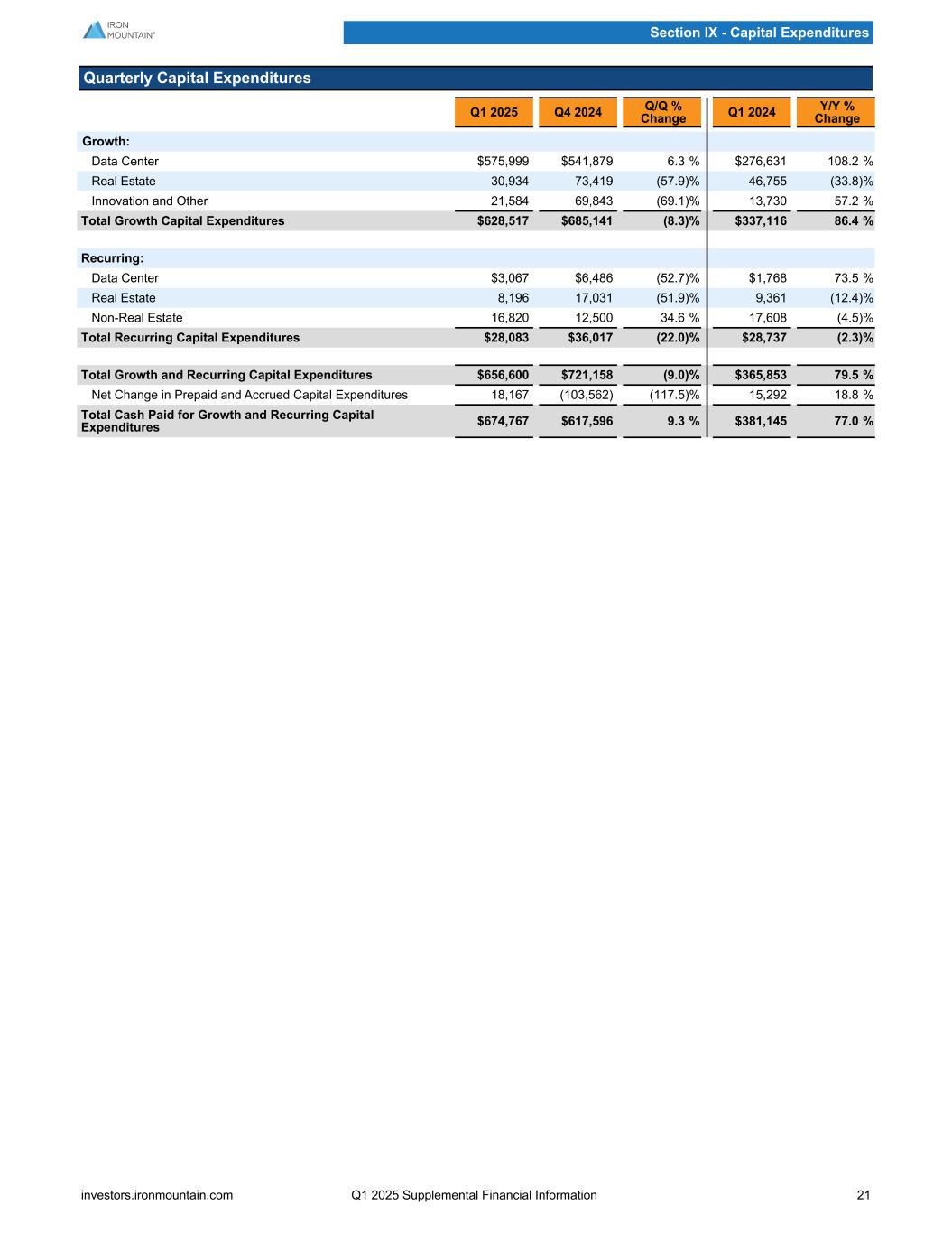 Quarterly Capital Expenditures Q1 2025 Q4 2024 Q/Q % Change Q1 2024 Y/Y % Change Growth: Data Center $575,999 $541,879 6.3 % $276,631 108.2 % Real Estate 30,934 73,419 (57.9) % 46,755 (33.8) % Innovation and Other 21,584 69,843 (69.1) % 13,730 57.2 % Total Growth Capital Expenditures $628,517 $685,141 (8.3) % $337,116 86.4 % Recurring: Data Center $3,067 $6,486 (52.7) % $1,768 73.5 % Real Estate 8,196 17,031 (51.9) % 9,361 (12.4) % Non-Real Estate 16,820 12,500 34.6 % 17,608 (4.5) % Total Recurring Capital Expenditures $28,083 $36,017 (22.0) % $28,737 (2.3) % Total Growth and Recurring Capital Expenditures $656,600 $721,158 (9.0) % $365,853 79.5 % Net Change in Prepaid and Accrued Capital Expenditures 18,167 (103,562) (117.5) % 15,292 18.8 % Total Cash Paid for Growth and Recurring Capital Expenditures $674,767 $617,596 9.3 % $381,145 77.0 % Section IX - Capital Expenditures investors.ironmountain.com Q1 2025 Supplemental Financial Information 21