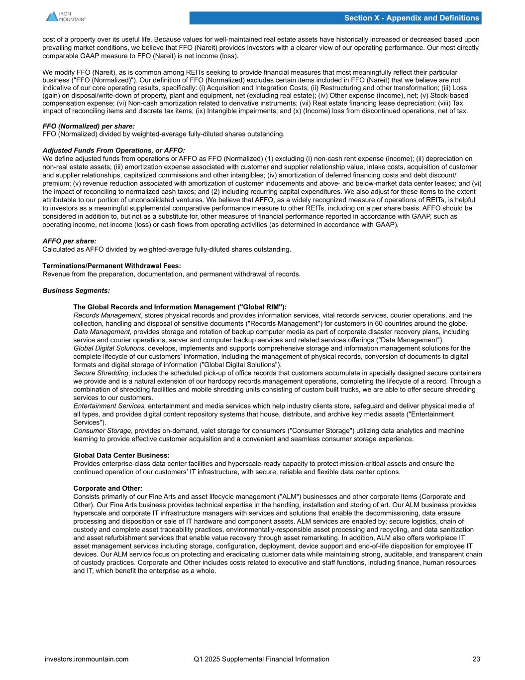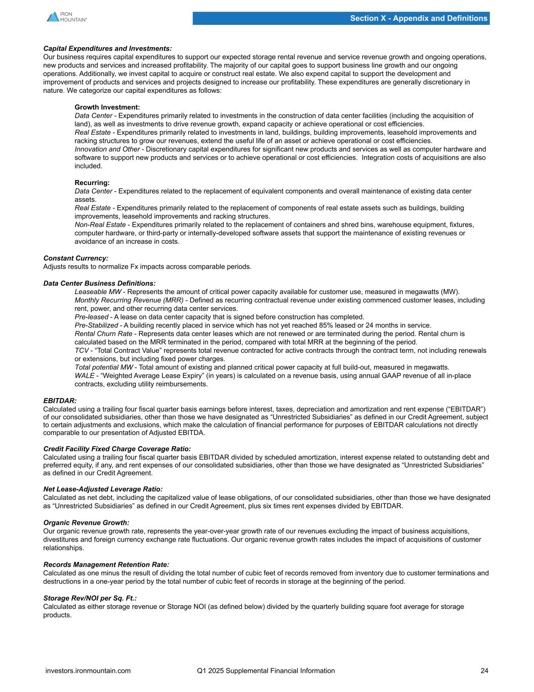 Capital Expenditures and Investments: Our business requires capital expenditures to support our expected storage rental revenue and service revenue growth and ongoing operations, new products and services and increased profitability. The majority of our capital goes to support business line growth and our ongoing operations. Additionally, we invest capital to acquire or construct real estate. We also expend capital to support the development and improvement of products and services and projects designed to increase our profitability. These expenditures are generally discretionary in nature. We categorize our capital expenditures as follows: Growth Investment: Data Center - Expenditures primarily related to investments in the construction of data center facilities (including the acquisition of land), as well as investments to drive revenue growth, expand capacity or achieve operational or cost efficiencies. Real Estate - Expenditures primarily related to investments in land, buildings, building improvements, leasehold improvements and racking structures to grow our revenues, extend the useful life of an asset or achieve operational or cost efficiencies. Innovation and Other - Discretionary capital expenditures for significant new products and services as well as computer hardware and software to support new products and services or to achieve operational or cost efficiencies. Integration costs of acquisitions are also included. Recurring: Data Center - Expenditures related to the replacement of equivalent components and overall maintenance of existing data center assets. Real Estate - Expenditures primarily related to the replacement of components of real estate assets such as buildings, building improvements, leasehold improvements and racking structures. Non-Real Estate - Expenditures primarily related to the replacement of containers and shred bins, warehouse equipment, fixtures, computer hardware, or third-party or internally-developed software assets that support the maintenance of existing revenues or avoidance of an increase in costs. Constant Currency: Adjusts results to normalize Fx impacts across comparable periods. Data Center Business Definitions: Leaseable MW - Represents the amount of critical power capacity available for customer use, measured in megawatts (MW). Monthly Recurring Revenue (MRR) - Defined as recurring contractual revenue under existing commenced customer leases, including rent, power, and other recurring data center services. Pre-leased - A lease on data center capacity that is signed before construction has completed. Pre-Stabilized - A building recently placed in service which has not yet reached 85% leased or 24 months in service. Rental Churn Rate - Represents data center leases which are not renewed or are terminated during the period. Rental churn is calculated based on the MRR terminated in the period, compared with total MRR at the beginning of the period. TCV - “Total Contract Value” represents total revenue contracted for active contracts through the contract term, not including renewals or extensions, but including fixed power charges. Total potential MW - Total amount of existing and planned critical power capacity at full build-out, measured in megawatts. WALE - “Weighted Average Lease Expiry” (in years) is calculated on a revenue basis, using annual GAAP revenue of all in-place contracts, excluding utility reimbursements. EBITDAR: Calculated using a trailing four fiscal quarter basis earnings before interest, taxes, depreciation and amortization and rent expense (“EBITDAR”) of our consolidated subsidiaries, other than those we have designated as “Unrestricted Subsidiaries” as defined in our Credit Agreement, subject to certain adjustments and exclusions, which make the calculation of financial performance for purposes of EBITDAR calculations not directly comparable to our presentation of Adjusted EBITDA. Credit Facility Fixed Charge Coverage Ratio: Calculated using a trailing four fiscal quarter basis EBITDAR divided by scheduled amortization, interest expense related to outstanding debt and preferred equity, if any, and rent expenses of our consolidated subsidiaries, other than those we have designated as “Unrestricted Subsidiaries” as defined in our Credit Agreement. Net Lease-Adjusted Leverage Ratio: Calculated as net debt, including the capitalized value of lease obligations, of our consolidated subsidiaries, other than those we have designated as “Unrestricted Subsidiaries” as defined in our Credit Agreement, plus six times rent expenses divided by EBITDAR. Organic Revenue Growth: Our organic revenue growth rate, represents the year-over-year growth rate of our revenues excluding the impact of business acquisitions, divestitures and foreign currency exchange rate fluctuations. Our organic revenue growth rates includes the impact of acquisitions of customer relationships. Records Management Retention Rate: Calculated as one minus the result of dividing the total number of cubic feet of records removed from inventory due to customer terminations and destructions in a one-year period by the total number of cubic feet of records in storage at the beginning of the period. Storage Rev/NOI per Sq. Ft.: Calculated as either storage revenue or Storage NOI (as defined below) divided by the quarterly building square foot average for storage products. Section X - Appendix and Definitions investors.ironmountain.com Q1 2025 Supplemental Financial Information 24