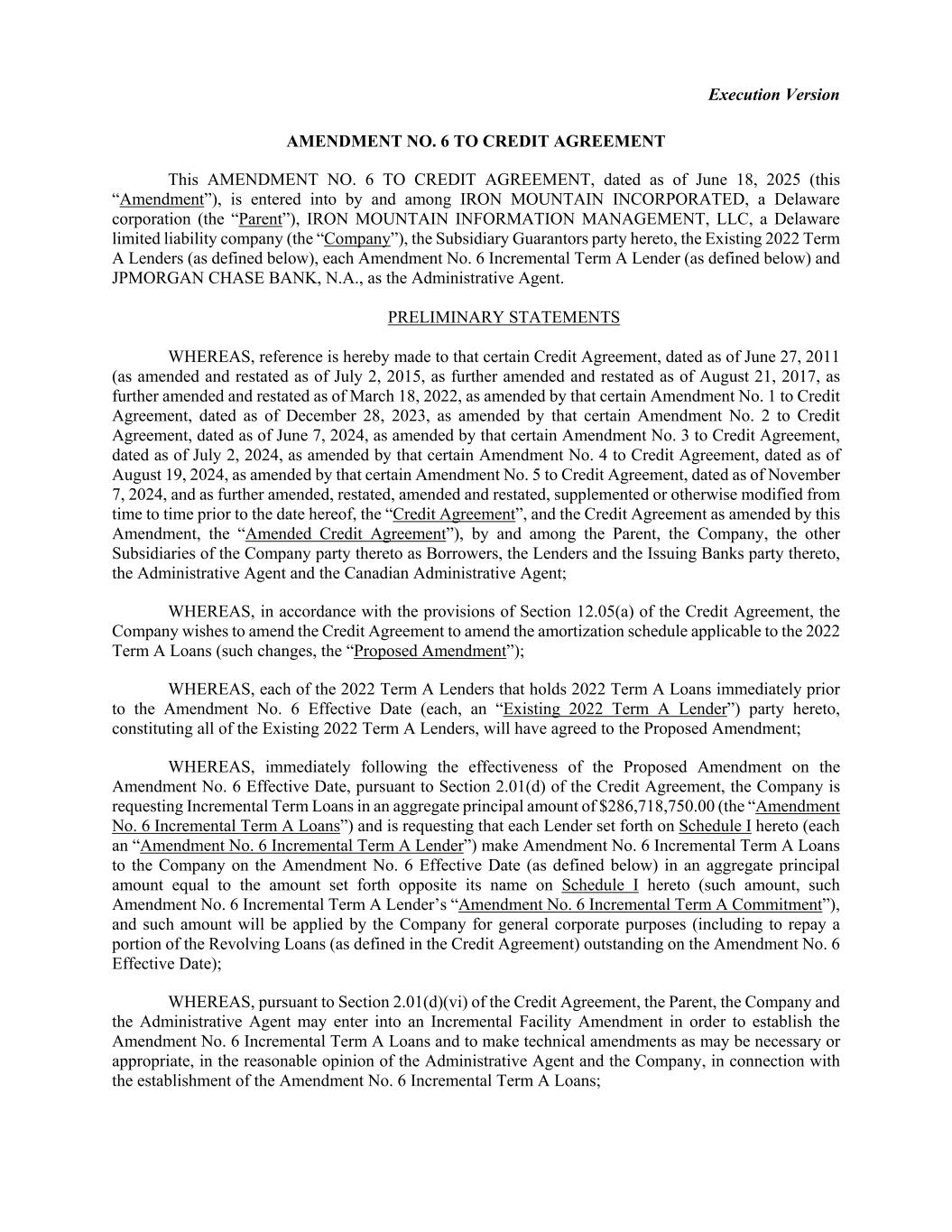 Execution Version AMENDMENT NO. 6 TO CREDIT AGREEMENT This AMENDMENT NO. 6 TO CREDIT AGREEMENT, dated as of June 18, 2025 (this “Amendment”), is entered into by and among IRON MOUNTAIN INCORPORATED, a Delaware corporation (the “Parent”), IRON MOUNTAIN INFORMATION MANAGEMENT, LLC, a Delaware limited liability company (the “Company”), the Subsidiary Guarantors party hereto, the Existing 2022 Term A Lenders (as defined below), each Amendment No. 6 Incremental Term A Lender (as defined below) and JPMORGAN CHASE BANK, N.A., as the Administrative Agent. PRELIMINARY STATEMENTS WHEREAS, reference is hereby made to that certain Credit Agreement, dated as of June 27, 2011 (as amended and restated as of July 2, 2015, as further amended and restated as of August 21, 2017, as further amended and restated as of March 18, 2022, as amended by that certain Amendment No. 1 to Credit Agreement, dated as of December 28, 2023, as amended by that certain Amendment No. 2 to Credit Agreement, dated as of June 7, 2024, as amended by that certain Amendment No. 3 to Credit Agreement, dated as of July 2, 2024, as amended by that certain Amendment No. 4 to Credit Agreement, dated as of August 19, 2024, as amended by that certain Amendment No. 5 to Credit Agreement, dated as of November 7, 2024, and as further amended, restated, amended and restated, supplemented or otherwise modified from time to time prior to the date hereof, the “Credit Agreement”, and the Credit Agreement as amended by this Amendment, the “Amended Credit Agreement”), by and among the Parent, the Company, the other Subsidiaries of the Company party thereto as Borrowers, the Lenders and the Issuing Banks party thereto, the Administrative Agent and the Canadian Administrative Agent; WHEREAS, in accordance with the provisions of Section 12.05(a) of the Credit Agreement, the Company wishes to amend the Credit Agreement to amend the amortization schedule applicable to the 2022 Term A Loans (such changes, the “Proposed Amendment”); WHEREAS, each of the 2022 Term A Lenders that holds 2022 Term A Loans immediately prior to the Amendment No. 6 Effective Date (each, an “Existing 2022 Term A Lender”) party hereto, constituting all of the Existing 2022 Term A Lenders, will have agreed to the Proposed Amendment; WHEREAS, immediately following the effectiveness of the Proposed Amendment on the Amendment No. 6 Effective Date, pursuant to Section 2.01(d) of the Credit Agreement, the Company is requesting Incremental Term Loans in an aggregate principal amount of $286,718,750.00 (the “Amendment No. 6 Incremental Term A Loans”) and is requesting that each Lender set forth on Schedule I hereto (each an “Amendment No. 6 Incremental Term A Lender”) make Amendment No. 6 Incremental Term A Loans to the Company on the Amendment No. 6 Effective Date (as defined below) in an aggregate principal amount equal to the amount set forth opposite its name on Schedule I hereto (such amount, such Amendment No. 6 Incremental Term A Lender’s “Amendment No. 6 Incremental Term A Commitment”), and such amount will be applied by the Company for general corporate purposes (including to repay a portion of the Revolving Loans (as defined in the Credit Agreement) outstanding on the Amendment No. 6 Effective Date); WHEREAS, pursuant to Section 2.01(d)(vi) of the Credit Agreement, the Parent, the Company and the Administrative Agent may enter into an Incremental Facility Amendment in order to establish the Amendment No. 6 Incremental Term A Loans and to make technical amendments as may be necessary or appropriate, in the reasonable opinion of the Administrative Agent and the Company, in connection with the establishment of the Amendment No. 6 Incremental Term A Loans;
