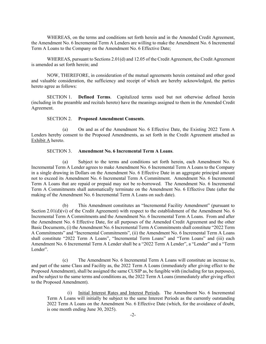 -2- WHEREAS, on the terms and conditions set forth herein and in the Amended Credit Agreement, the Amendment No. 6 Incremental Term A Lenders are willing to make the Amendment No. 6 Incremental Term A Loans to the Company on the Amendment No. 6 Effective Date; WHEREAS, pursuant to Sections 2.01(d) and 12.05 of the Credit Agreement, the Credit Agreement is amended as set forth herein; and NOW, THEREFORE, in consideration of the mutual agreements herein contained and other good and valuable consideration, the sufficiency and receipt of which are hereby acknowledged, the parties hereto agree as follows: SECTION 1. Defined Terms. Capitalized terms used but not otherwise defined herein (including in the preamble and recitals hereto) have the meanings assigned to them in the Amended Credit Agreement. SECTION 2. Proposed Amendment Consents. (a) On and as of the Amendment No. 6 Effective Date, the Existing 2022 Term A Lenders hereby consent to the Proposed Amendments, as set forth in the Credit Agreement attached as Exhibit A hereto. SECTION 3. Amendment No. 6 Incremental Term A Loans. (a) Subject to the terms and conditions set forth herein, each Amendment No. 6 Incremental Term A Lender agrees to make Amendment No. 6 Incremental Term A Loans to the Company in a single drawing in Dollars on the Amendment No. 6 Effective Date in an aggregate principal amount not to exceed its Amendment No. 6 Incremental Term A Commitment. Amendment No. 6 Incremental Term A Loans that are repaid or prepaid may not be re-borrowed. The Amendment No. 6 Incremental Term A Commitments shall automatically terminate on the Amendment No. 6 Effective Date (after the making of the Amendment No. 6 Incremental Term A Loans on such date). (b) This Amendment constitutes an “Incremental Facility Amendment” (pursuant to Section 2.01(d)(vi) of the Credit Agreement) with respect to the establishment of the Amendment No. 6 Incremental Term A Commitments and the Amendment No. 6 Incremental Term A Loans. From and after the Amendment No. 6 Effective Date, for all purposes of the Amended Credit Agreement and the other Basic Documents, (i) the Amendment No. 6 Incremental Term A Commitments shall constitute “2022 Term A Commitments” and “Incremental Commitments”, (ii) the Amendment No. 6 Incremental Term A Loans shall constitute “2022 Term A Loans”, “Incremental Term Loans” and “Term Loans” and (iii) each Amendment No. 6 Incremental Term A Lender shall be a “2022 Term A Lender”, a “Lender” and a “Term Lender”. (c) The Amendment No. 6 Incremental Term A Loans will constitute an increase to, and part of the same Class and Facility as, the 2022 Term A Loans (immediately after giving effect to the Proposed Amendment), shall be assigned the same CUSIP as, be fungible with (including for tax purposes), and be subject to the same terms and conditions as, the 2022 Term A Loans (immediately after giving effect to the Proposed Amendment). (i) Initial Interest Rates and Interest Periods. The Amendment No. 6 Incremental Term A Loans will initially be subject to the same Interest Periods as the currently outstanding 2022 Term A Loans on the Amendment No. 6 Effective Date (which, for the avoidance of doubt, is one month ending June 30, 2025).