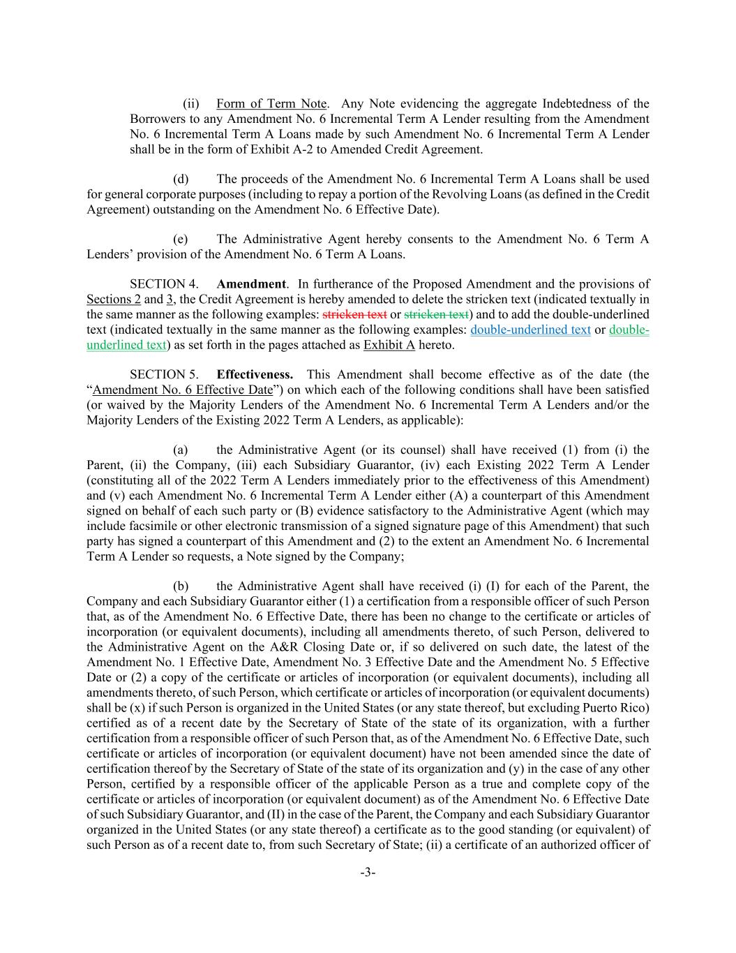-3- (ii) Form of Term Note. Any Note evidencing the aggregate Indebtedness of the Borrowers to any Amendment No. 6 Incremental Term A Lender resulting from the Amendment No. 6 Incremental Term A Loans made by such Amendment No. 6 Incremental Term A Lender shall be in the form of Exhibit A-2 to Amended Credit Agreement. (d) The proceeds of the Amendment No. 6 Incremental Term A Loans shall be used for general corporate purposes (including to repay a portion of the Revolving Loans (as defined in the Credit Agreement) outstanding on the Amendment No. 6 Effective Date). (e) The Administrative Agent hereby consents to the Amendment No. 6 Term A Lenders’ provision of the Amendment No. 6 Term A Loans. SECTION 4. Amendment. In furtherance of the Proposed Amendment and the provisions of Sections 2 and 3, the Credit Agreement is hereby amended to delete the stricken text (indicated textually in the same manner as the following examples: stricken text or stricken text) and to add the double-underlined text (indicated textually in the same manner as the following examples: double-underlined text or double- underlined text) as set forth in the pages attached as Exhibit A hereto. SECTION 5. Effectiveness. This Amendment shall become effective as of the date (the “Amendment No. 6 Effective Date”) on which each of the following conditions shall have been satisfied (or waived by the Majority Lenders of the Amendment No. 6 Incremental Term A Lenders and/or the Majority Lenders of the Existing 2022 Term A Lenders, as applicable): (a) the Administrative Agent (or its counsel) shall have received (1) from (i) the Parent, (ii) the Company, (iii) each Subsidiary Guarantor, (iv) each Existing 2022 Term A Lender (constituting all of the 2022 Term A Lenders immediately prior to the effectiveness of this Amendment) and (v) each Amendment No. 6 Incremental Term A Lender either (A) a counterpart of this Amendment signed on behalf of each such party or (B) evidence satisfactory to the Administrative Agent (which may include facsimile or other electronic transmission of a signed signature page of this Amendment) that such party has signed a counterpart of this Amendment and (2) to the extent an Amendment No. 6 Incremental Term A Lender so requests, a Note signed by the Company; (b) the Administrative Agent shall have received (i) (I) for each of the Parent, the Company and each Subsidiary Guarantor either (1) a certification from a responsible officer of such Person that, as of the Amendment No. 6 Effective Date, there has been no change to the certificate or articles of incorporation (or equivalent documents), including all amendments thereto, of such Person, delivered to the Administrative Agent on the A&R Closing Date or, if so delivered on such date, the latest of the Amendment No. 1 Effective Date, Amendment No. 3 Effective Date and the Amendment No. 5 Effective Date or (2) a copy of the certificate or articles of incorporation (or equivalent documents), including all amendments thereto, of such Person, which certificate or articles of incorporation (or equivalent documents) shall be (x) if such Person is organized in the United States (or any state thereof, but excluding Puerto Rico) certified as of a recent date by the Secretary of State of the state of its organization, with a further certification from a responsible officer of such Person that, as of the Amendment No. 6 Effective Date, such certificate or articles of incorporation (or equivalent document) have not been amended since the date of certification thereof by the Secretary of State of the state of its organization and (y) in the case of any other Person, certified by a responsible officer of the applicable Person as a true and complete copy of the certificate or articles of incorporation (or equivalent document) as of the Amendment No. 6 Effective Date of such Subsidiary Guarantor, and (II) in the case of the Parent, the Company and each Subsidiary Guarantor organized in the United States (or any state thereof) a certificate as to the good standing (or equivalent) of such Person as of a recent date to, from such Secretary of State; (ii) a certificate of an authorized officer of