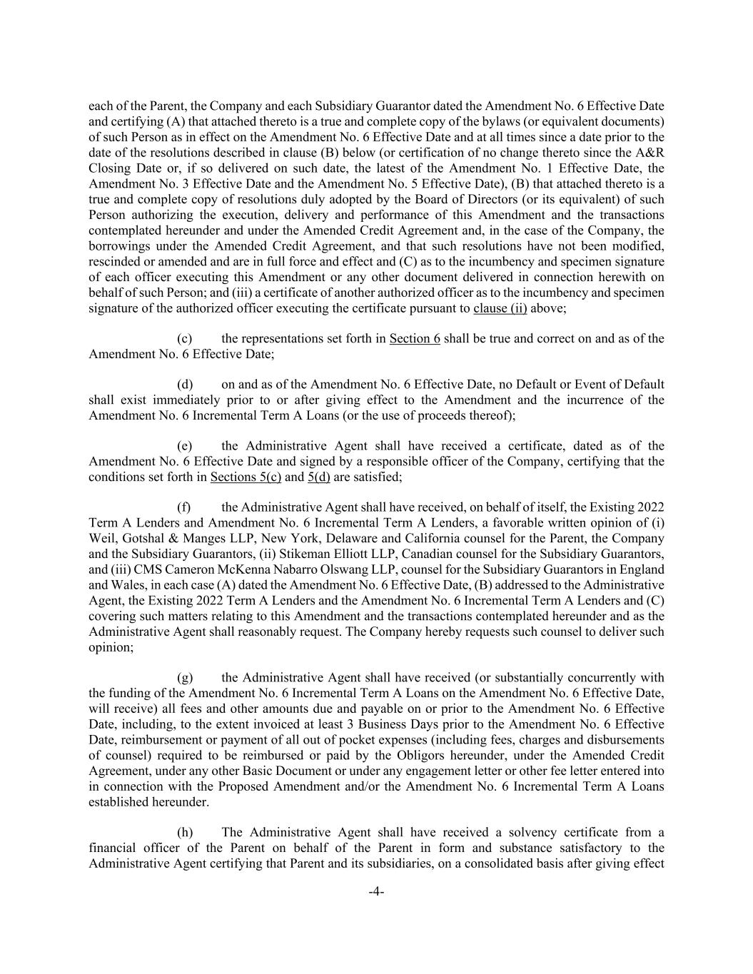 -4- each of the Parent, the Company and each Subsidiary Guarantor dated the Amendment No. 6 Effective Date and certifying (A) that attached thereto is a true and complete copy of the bylaws (or equivalent documents) of such Person as in effect on the Amendment No. 6 Effective Date and at all times since a date prior to the date of the resolutions described in clause (B) below (or certification of no change thereto since the A&R Closing Date or, if so delivered on such date, the latest of the Amendment No. 1 Effective Date, the Amendment No. 3 Effective Date and the Amendment No. 5 Effective Date), (B) that attached thereto is a true and complete copy of resolutions duly adopted by the Board of Directors (or its equivalent) of such Person authorizing the execution, delivery and performance of this Amendment and the transactions contemplated hereunder and under the Amended Credit Agreement and, in the case of the Company, the borrowings under the Amended Credit Agreement, and that such resolutions have not been modified, rescinded or amended and are in full force and effect and (C) as to the incumbency and specimen signature of each officer executing this Amendment or any other document delivered in connection herewith on behalf of such Person; and (iii) a certificate of another authorized officer as to the incumbency and specimen signature of the authorized officer executing the certificate pursuant to clause (ii) above; (c) the representations set forth in Section 6 shall be true and correct on and as of the Amendment No. 6 Effective Date; (d) on and as of the Amendment No. 6 Effective Date, no Default or Event of Default shall exist immediately prior to or after giving effect to the Amendment and the incurrence of the Amendment No. 6 Incremental Term A Loans (or the use of proceeds thereof); (e) the Administrative Agent shall have received a certificate, dated as of the Amendment No. 6 Effective Date and signed by a responsible officer of the Company, certifying that the conditions set forth in Sections 5(c) and 5(d) are satisfied; (f) the Administrative Agent shall have received, on behalf of itself, the Existing 2022 Term A Lenders and Amendment No. 6 Incremental Term A Lenders, a favorable written opinion of (i) Weil, Gotshal & Manges LLP, New York, Delaware and California counsel for the Parent, the Company and the Subsidiary Guarantors, (ii) Stikeman Elliott LLP, Canadian counsel for the Subsidiary Guarantors, and (iii) CMS Cameron McKenna Nabarro Olswang LLP, counsel for the Subsidiary Guarantors in England and Wales, in each case (A) dated the Amendment No. 6 Effective Date, (B) addressed to the Administrative Agent, the Existing 2022 Term A Lenders and the Amendment No. 6 Incremental Term A Lenders and (C) covering such matters relating to this Amendment and the transactions contemplated hereunder and as the Administrative Agent shall reasonably request. The Company hereby requests such counsel to deliver such opinion; (g) the Administrative Agent shall have received (or substantially concurrently with the funding of the Amendment No. 6 Incremental Term A Loans on the Amendment No. 6 Effective Date, will receive) all fees and other amounts due and payable on or prior to the Amendment No. 6 Effective Date, including, to the extent invoiced at least 3 Business Days prior to the Amendment No. 6 Effective Date, reimbursement or payment of all out of pocket expenses (including fees, charges and disbursements of counsel) required to be reimbursed or paid by the Obligors hereunder, under the Amended Credit Agreement, under any other Basic Document or under any engagement letter or other fee letter entered into in connection with the Proposed Amendment and/or the Amendment No. 6 Incremental Term A Loans established hereunder. (h) The Administrative Agent shall have received a solvency certificate from a financial officer of the Parent on behalf of the Parent in form and substance satisfactory to the Administrative Agent certifying that Parent and its subsidiaries, on a consolidated basis after giving effect