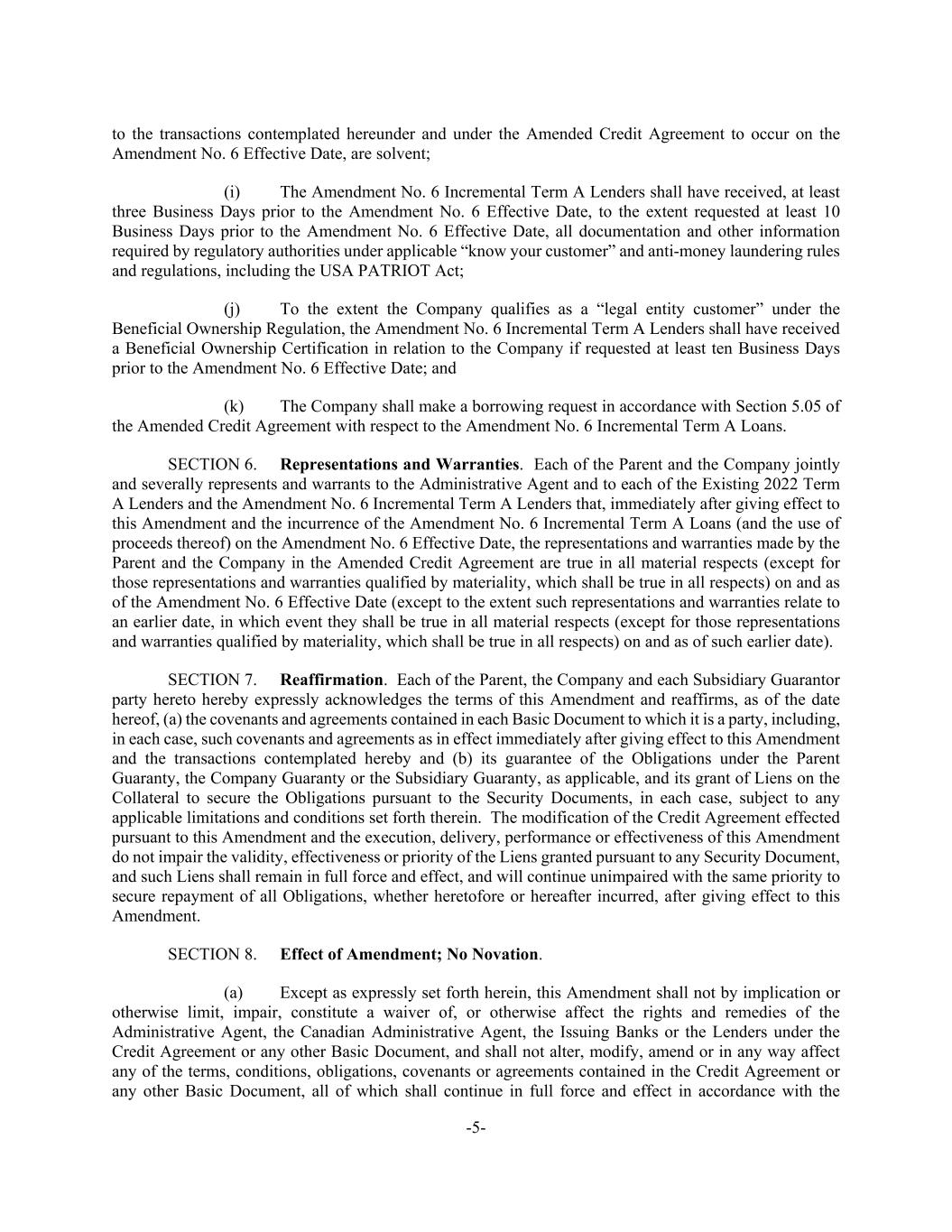 -5- to the transactions contemplated hereunder and under the Amended Credit Agreement to occur on the Amendment No. 6 Effective Date, are solvent; (i) The Amendment No. 6 Incremental Term A Lenders shall have received, at least three Business Days prior to the Amendment No. 6 Effective Date, to the extent requested at least 10 Business Days prior to the Amendment No. 6 Effective Date, all documentation and other information required by regulatory authorities under applicable “know your customer” and anti-money laundering rules and regulations, including the USA PATRIOT Act; (j) To the extent the Company qualifies as a “legal entity customer” under the Beneficial Ownership Regulation, the Amendment No. 6 Incremental Term A Lenders shall have received a Beneficial Ownership Certification in relation to the Company if requested at least ten Business Days prior to the Amendment No. 6 Effective Date; and (k) The Company shall make a borrowing request in accordance with Section 5.05 of the Amended Credit Agreement with respect to the Amendment No. 6 Incremental Term A Loans. SECTION 6. Representations and Warranties. Each of the Parent and the Company jointly and severally represents and warrants to the Administrative Agent and to each of the Existing 2022 Term A Lenders and the Amendment No. 6 Incremental Term A Lenders that, immediately after giving effect to this Amendment and the incurrence of the Amendment No. 6 Incremental Term A Loans (and the use of proceeds thereof) on the Amendment No. 6 Effective Date, the representations and warranties made by the Parent and the Company in the Amended Credit Agreement are true in all material respects (except for those representations and warranties qualified by materiality, which shall be true in all respects) on and as of the Amendment No. 6 Effective Date (except to the extent such representations and warranties relate to an earlier date, in which event they shall be true in all material respects (except for those representations and warranties qualified by materiality, which shall be true in all respects) on and as of such earlier date). SECTION 7. Reaffirmation. Each of the Parent, the Company and each Subsidiary Guarantor party hereto hereby expressly acknowledges the terms of this Amendment and reaffirms, as of the date hereof, (a) the covenants and agreements contained in each Basic Document to which it is a party, including, in each case, such covenants and agreements as in effect immediately after giving effect to this Amendment and the transactions contemplated hereby and (b) its guarantee of the Obligations under the Parent Guaranty, the Company Guaranty or the Subsidiary Guaranty, as applicable, and its grant of Liens on the Collateral to secure the Obligations pursuant to the Security Documents, in each case, subject to any applicable limitations and conditions set forth therein. The modification of the Credit Agreement effected pursuant to this Amendment and the execution, delivery, performance or effectiveness of this Amendment do not impair the validity, effectiveness or priority of the Liens granted pursuant to any Security Document, and such Liens shall remain in full force and effect, and will continue unimpaired with the same priority to secure repayment of all Obligations, whether heretofore or hereafter incurred, after giving effect to this Amendment. SECTION 8. Effect of Amendment; No Novation. (a) Except as expressly set forth herein, this Amendment shall not by implication or otherwise limit, impair, constitute a waiver of, or otherwise affect the rights and remedies of the Administrative Agent, the Canadian Administrative Agent, the Issuing Banks or the Lenders under the Credit Agreement or any other Basic Document, and shall not alter, modify, amend or in any way affect any of the terms, conditions, obligations, covenants or agreements contained in the Credit Agreement or any other Basic Document, all of which shall continue in full force and effect in accordance with the