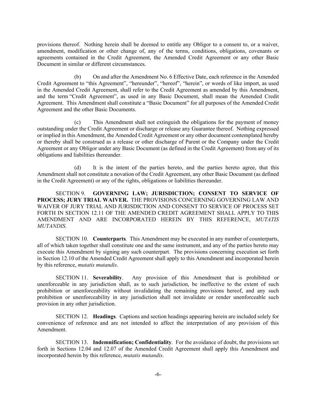 -6- provisions thereof. Nothing herein shall be deemed to entitle any Obligor to a consent to, or a waiver, amendment, modification or other change of, any of the terms, conditions, obligations, covenants or agreements contained in the Credit Agreement, the Amended Credit Agreement or any other Basic Document in similar or different circumstances. (b) On and after the Amendment No. 6 Effective Date, each reference in the Amended Credit Agreement to “this Agreement”, “hereunder”, “hereof”, “herein”, or words of like import, as used in the Amended Credit Agreement, shall refer to the Credit Agreement as amended by this Amendment, and the term “Credit Agreement”, as used in any Basic Document, shall mean the Amended Credit Agreement. This Amendment shall constitute a “Basic Document” for all purposes of the Amended Credit Agreement and the other Basic Documents. (c) This Amendment shall not extinguish the obligations for the payment of money outstanding under the Credit Agreement or discharge or release any Guarantee thereof. Nothing expressed or implied in this Amendment, the Amended Credit Agreement or any other document contemplated hereby or thereby shall be construed as a release or other discharge of Parent or the Company under the Credit Agreement or any Obligor under any Basic Document (as defined in the Credit Agreement) from any of its obligations and liabilities thereunder. (d) It is the intent of the parties hereto, and the parties hereto agree, that this Amendment shall not constitute a novation of the Credit Agreement, any other Basic Document (as defined in the Credit Agreement) or any of the rights, obligations or liabilities thereunder. SECTION 9. GOVERNING LAW; JURISDICTION; CONSENT TO SERVICE OF PROCESS; JURY TRIAL WAIVER. THE PROVISIONS CONCERNING GOVERNING LAW AND WAIVER OF JURY TRIAL AND JURISDICTION AND CONSENT TO SERVICE OF PROCESS SET FORTH IN SECTION 12.11 OF THE AMENDED CREDIT AGREEMENT SHALL APPLY TO THIS AMENDMENT AND ARE INCORPORATED HEREIN BY THIS REFERENCE, MUTATIS MUTANDIS. SECTION 10. Counterparts. This Amendment may be executed in any number of counterparts, all of which taken together shall constitute one and the same instrument, and any of the parties hereto may execute this Amendment by signing any such counterpart. The provisions concerning execution set forth in Section 12.10 of the Amended Credit Agreement shall apply to this Amendment and incorporated herein by this reference, mutatis mutandis. SECTION 11. Severability. Any provision of this Amendment that is prohibited or unenforceable in any jurisdiction shall, as to such jurisdiction, be ineffective to the extent of such prohibition or unenforceability without invalidating the remaining provisions hereof, and any such prohibition or unenforceability in any jurisdiction shall not invalidate or render unenforceable such provision in any other jurisdiction. SECTION 12. Headings. Captions and section headings appearing herein are included solely for convenience of reference and are not intended to affect the interpretation of any provision of this Amendment. SECTION 13. Indemnification; Confidentiality. For the avoidance of doubt, the provisions set forth in Sections 12.04 and 12.07 of the Amended Credit Agreement shall apply this Amendment and incorporated herein by this reference, mutatis mutandis.