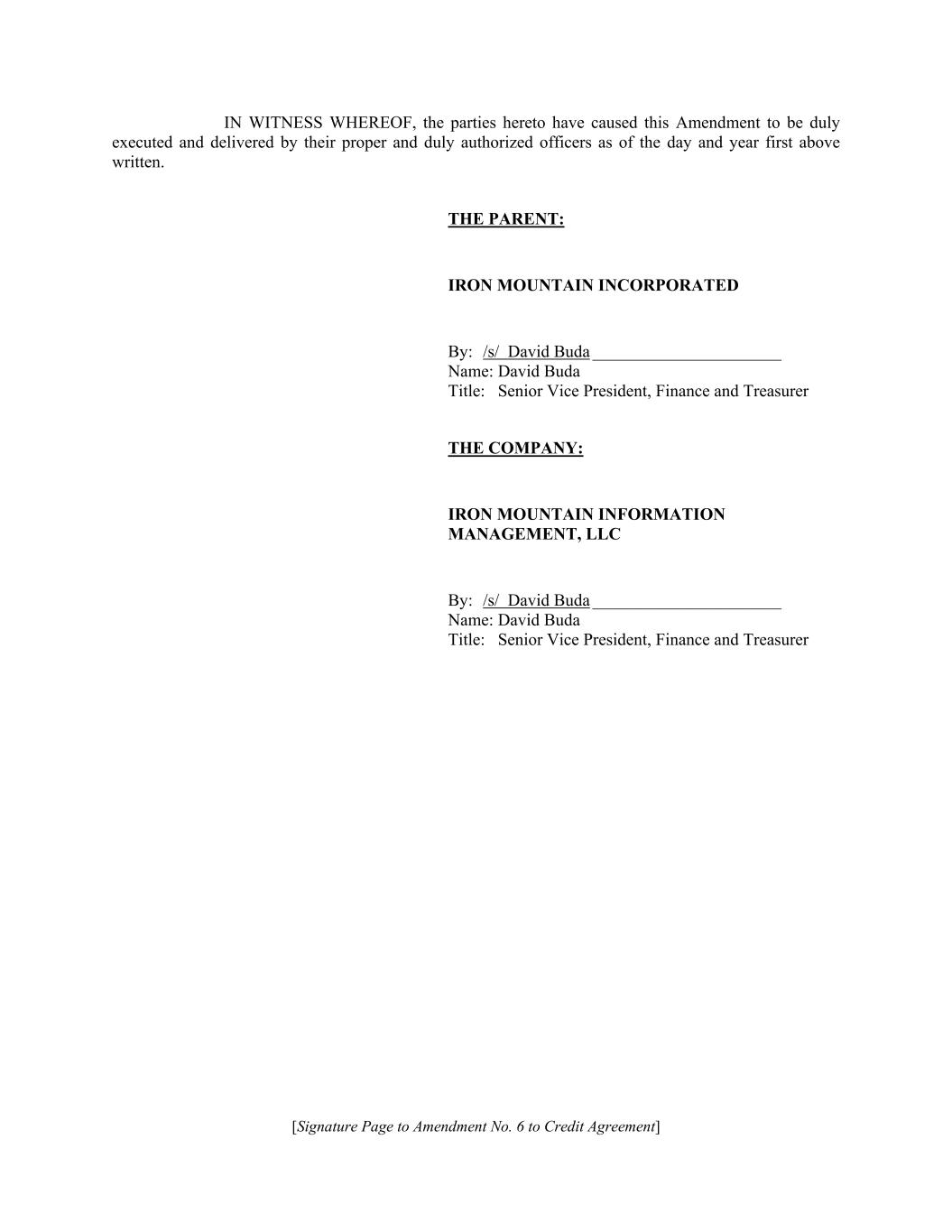 [Signature Page to Amendment No. 6 to Credit Agreement] IN WITNESS WHEREOF, the parties hereto have caused this Amendment to be duly executed and delivered by their proper and duly authorized officers as of the day and year first above written. THE PARENT: IRON MOUNTAIN INCORPORATED By: /s/ David Buda ______________________ Name: David Buda Title: Senior Vice President, Finance and Treasurer THE COMPANY: IRON MOUNTAIN INFORMATION MANAGEMENT, LLC By: /s/ David Buda ______________________ Name: David Buda Title: Senior Vice President, Finance and Treasurer