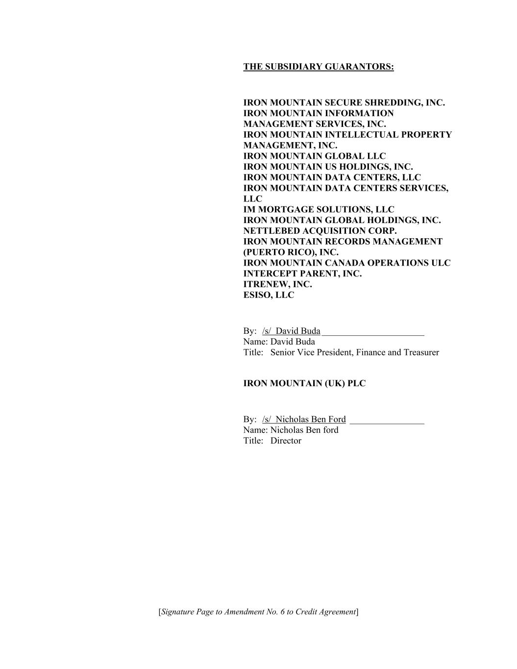 [Signature Page to Amendment No. 6 to Credit Agreement] THE SUBSIDIARY GUARANTORS: IRON MOUNTAIN SECURE SHREDDING, INC. IRON MOUNTAIN INFORMATION MANAGEMENT SERVICES, INC. IRON MOUNTAIN INTELLECTUAL PROPERTY MANAGEMENT, INC. IRON MOUNTAIN GLOBAL LLC IRON MOUNTAIN US HOLDINGS, INC. IRON MOUNTAIN DATA CENTERS, LLC IRON MOUNTAIN DATA CENTERS SERVICES, LLC IM MORTGAGE SOLUTIONS, LLC IRON MOUNTAIN GLOBAL HOLDINGS, INC. NETTLEBED ACQUISITION CORP. IRON MOUNTAIN RECORDS MANAGEMENT (PUERTO RICO), INC. IRON MOUNTAIN CANADA OPERATIONS ULC INTERCEPT PARENT, INC. ITRENEW, INC. ESISO, LLC By: /s/ David Buda ______________________ Name: David Buda Title: Senior Vice President, Finance and Treasurer IRON MOUNTAIN (UK) PLC By: /s/ Nicholas Ben Ford ________________ Name: Nicholas Ben ford Title: Director