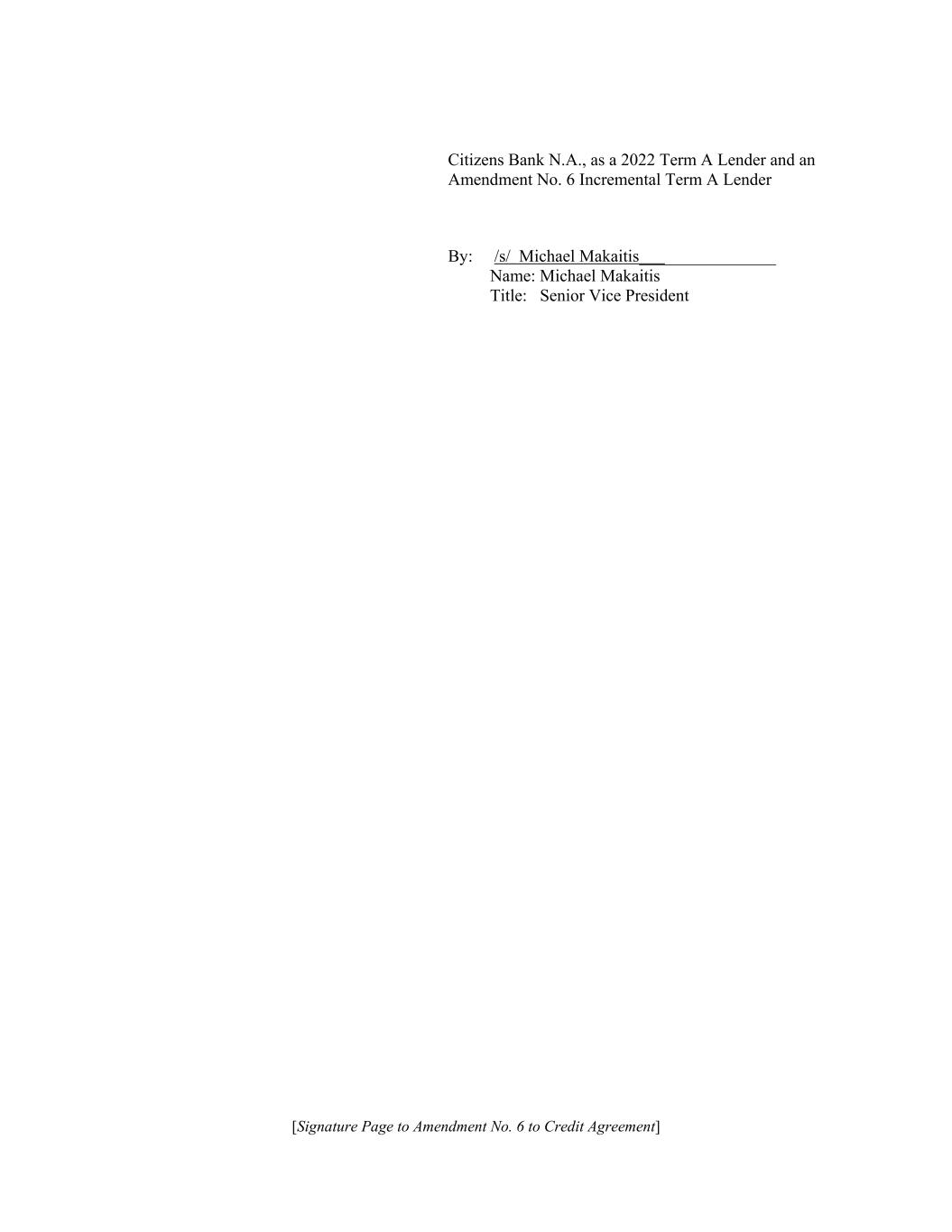 [Signature Page to Amendment No. 6 to Credit Agreement] Citizens Bank N.A., as a 2022 Term A Lender and an Amendment No. 6 Incremental Term A Lender By: /s/ Michael Makaitis________________ Name: Michael Makaitis Title: Senior Vice President