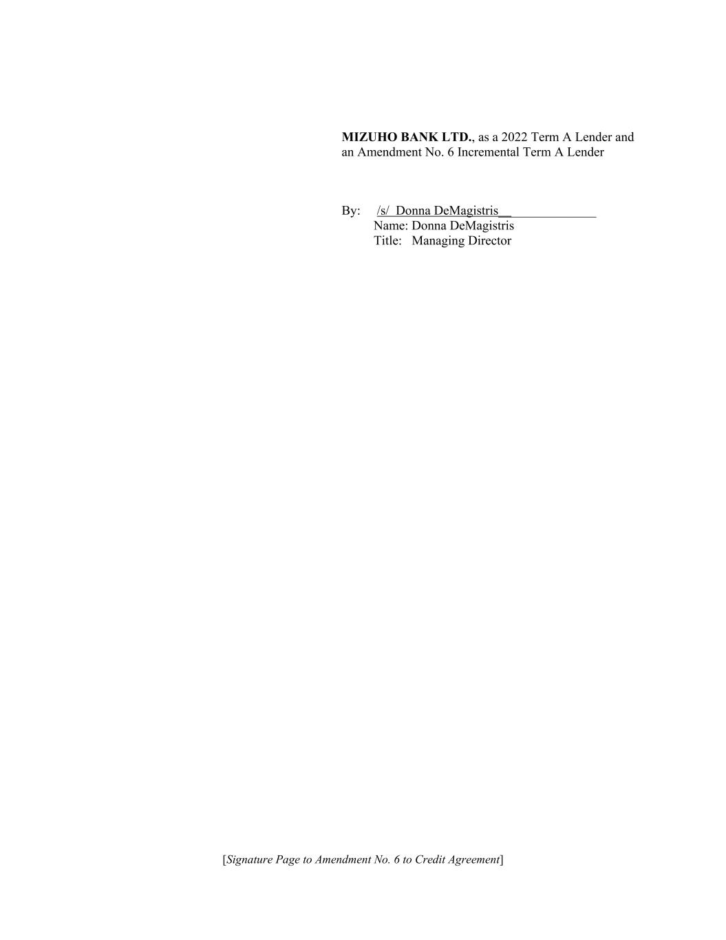 [Signature Page to Amendment No. 6 to Credit Agreement] MIZUHO BANK LTD., as a 2022 Term A Lender and an Amendment No. 6 Incremental Term A Lender By: /s/ Donna DeMagistris_______________ Name: Donna DeMagistris Title: Managing Director