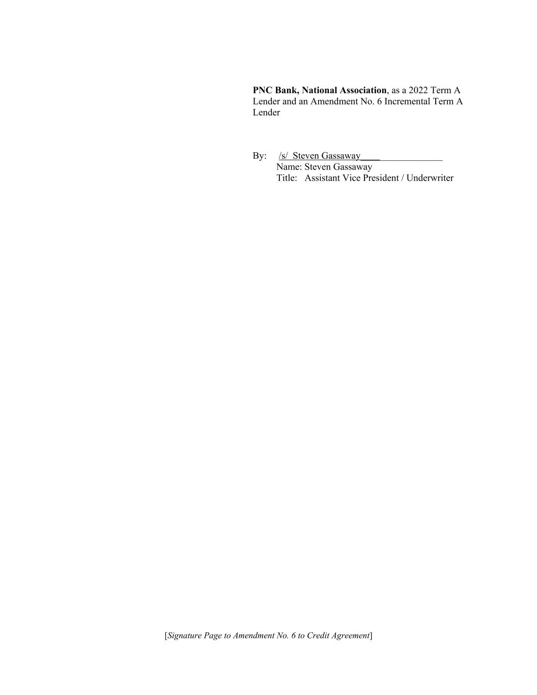 [Signature Page to Amendment No. 6 to Credit Agreement] PNC Bank, National Association, as a 2022 Term A Lender and an Amendment No. 6 Incremental Term A Lender By: /s/ Steven Gassaway_________________ Name: Steven Gassaway Title: Assistant Vice President / Underwriter