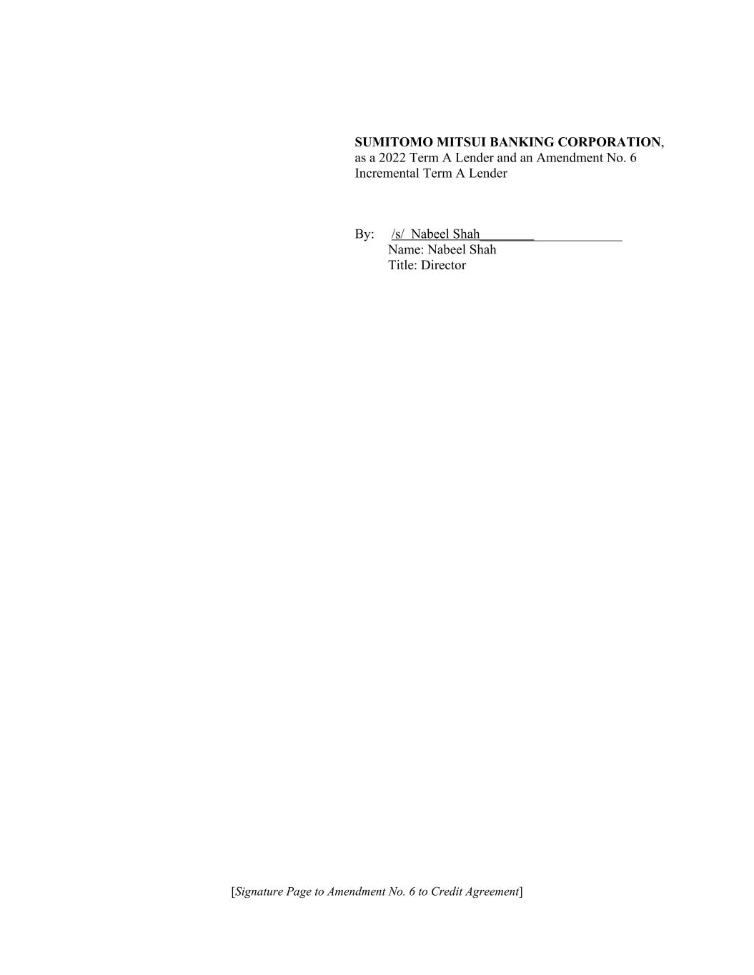 [Signature Page to Amendment No. 6 to Credit Agreement] SUMITOMO MITSUI BANKING CORPORATION, as a 2022 Term A Lender and an Amendment No. 6 Incremental Term A Lender By: /s/ Nabeel Shah_____________________ Name: Nabeel Shah Title: Director