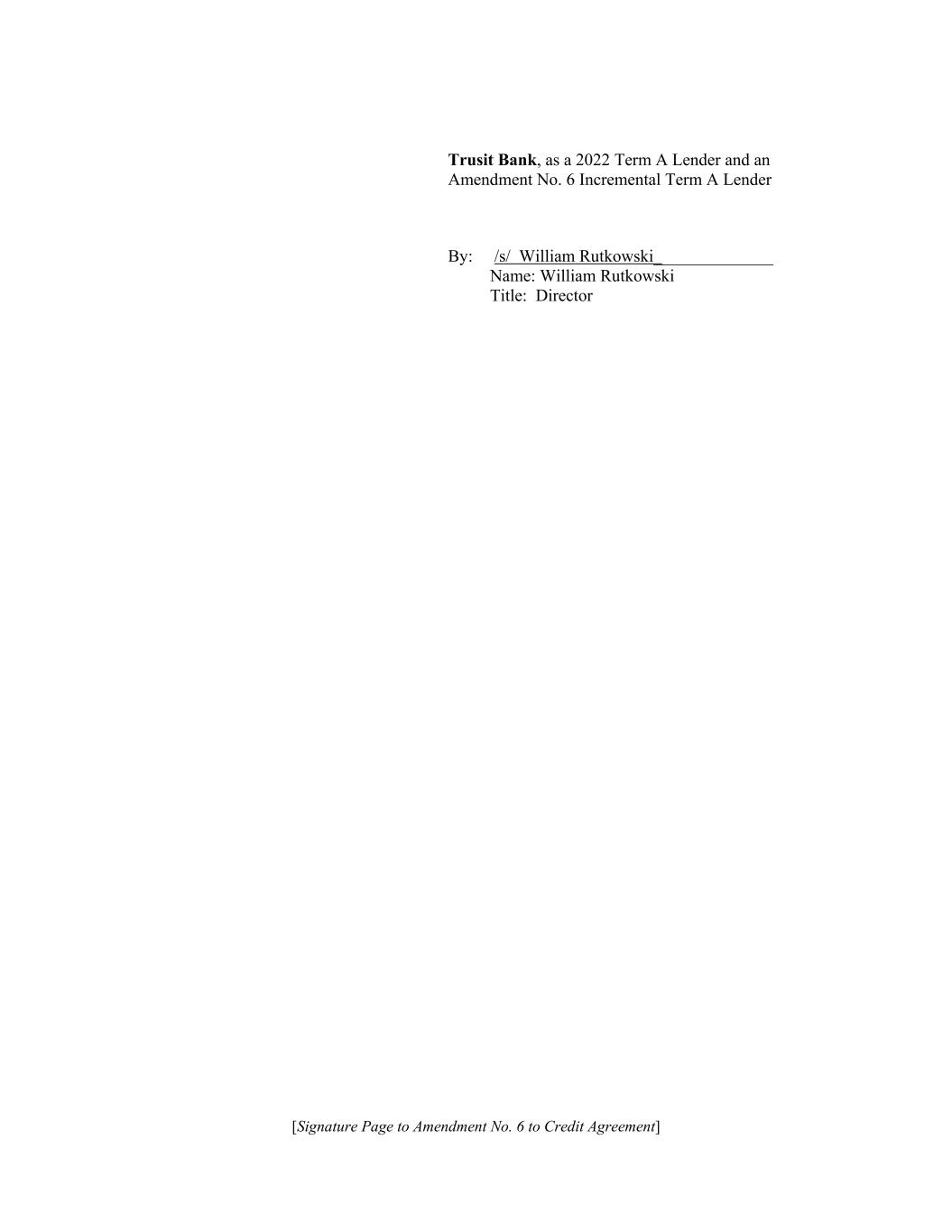 [Signature Page to Amendment No. 6 to Credit Agreement] Trusit Bank, as a 2022 Term A Lender and an Amendment No. 6 Incremental Term A Lender By: /s/ William Rutkowski______________ Name: William Rutkowski Title: Director