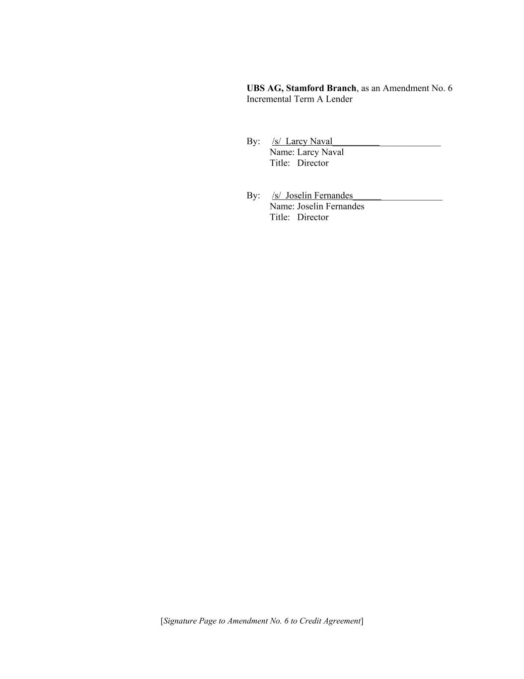 [Signature Page to Amendment No. 6 to Credit Agreement] UBS AG, Stamford Branch, as an Amendment No. 6 Incremental Term A Lender By: /s/ Larcy Naval_______________________ Name: Larcy Naval Title: Director By: /s/ Joselin Fernandes___________________ Name: Joselin Fernandes Title: Director