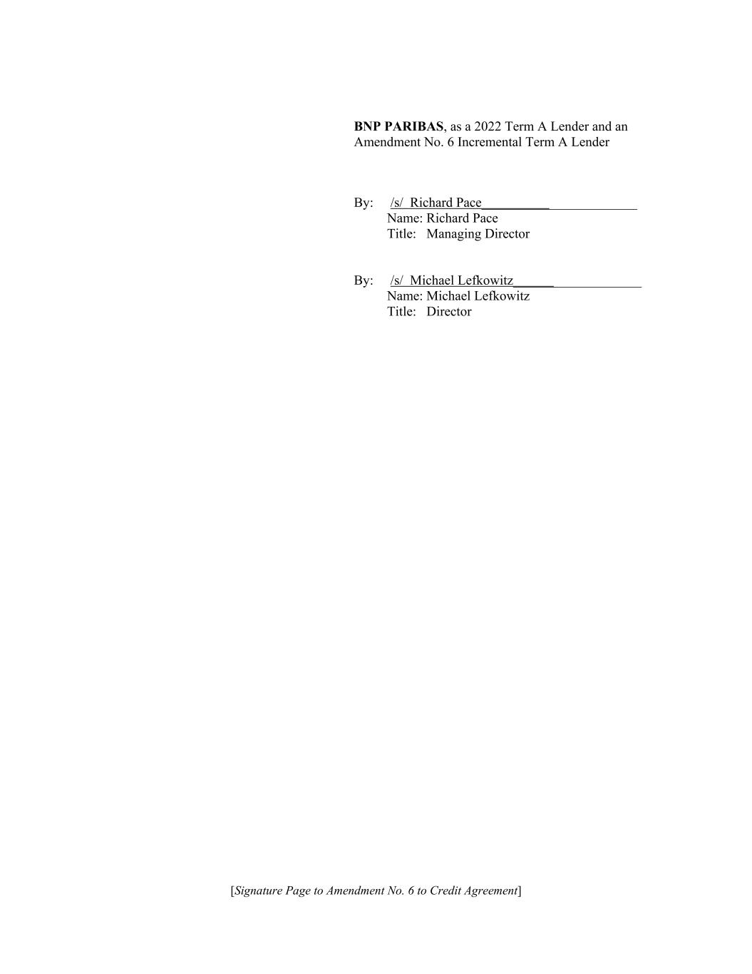 [Signature Page to Amendment No. 6 to Credit Agreement] BNP PARIBAS, as a 2022 Term A Lender and an Amendment No. 6 Incremental Term A Lender By: /s/ Richard Pace_______________________ Name: Richard Pace Title: Managing Director By: /s/ Michael Lefkowitz___________________ Name: Michael Lefkowitz Title: Director