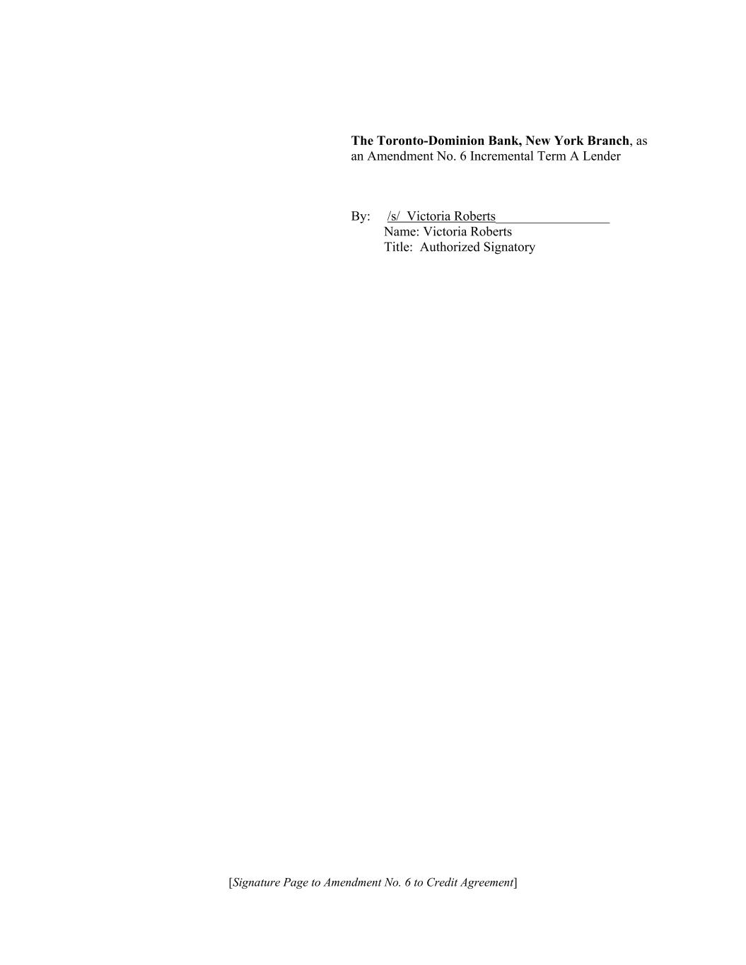 [Signature Page to Amendment No. 6 to Credit Agreement] The Toronto-Dominion Bank, New York Branch, as an Amendment No. 6 Incremental Term A Lender By: /s/ Victoria Roberts_________________ Name: Victoria Roberts Title: Authorized Signatory