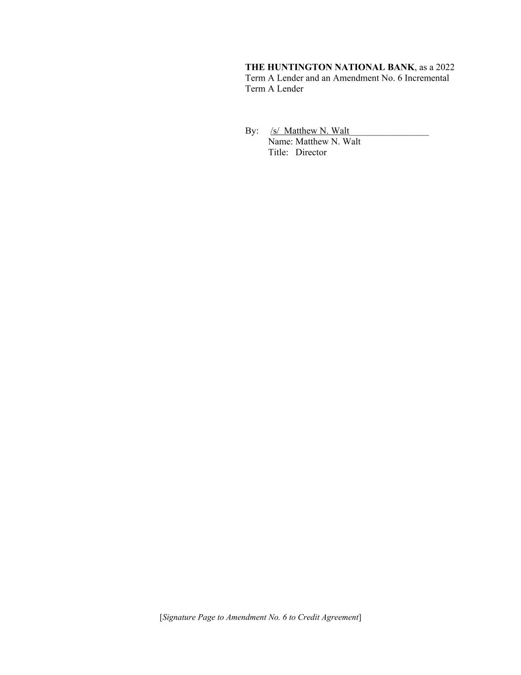 [Signature Page to Amendment No. 6 to Credit Agreement] THE HUNTINGTON NATIONAL BANK, as a 2022 Term A Lender and an Amendment No. 6 Incremental Term A Lender By: /s/ Matthew N. Walt_________________ Name: Matthew N. Walt Title: Director