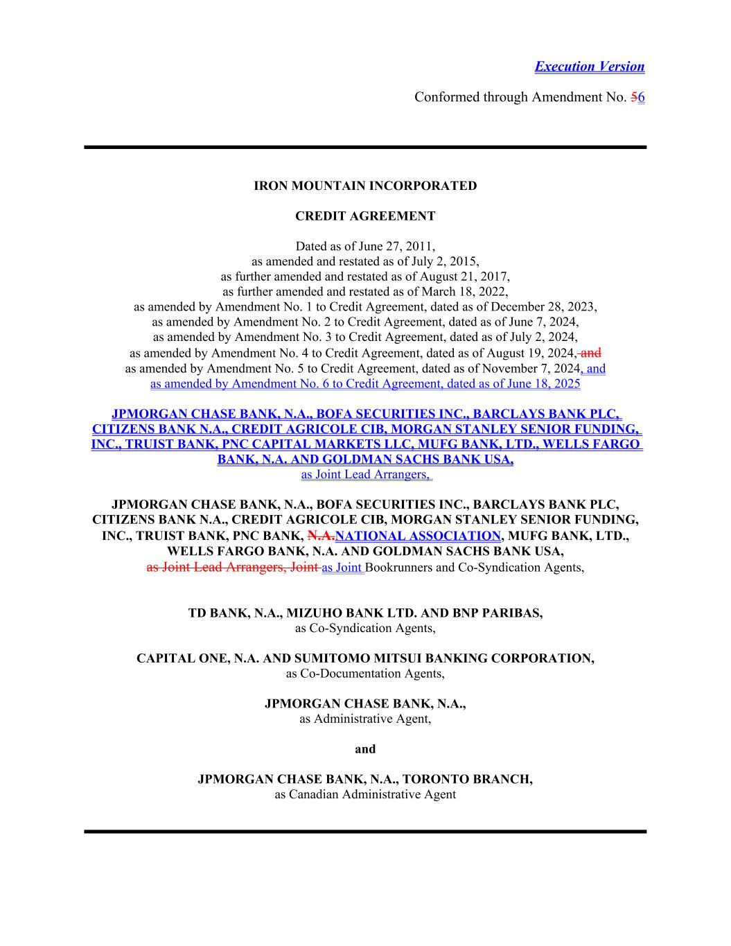 CREDIT AGREEMENT dated as of June 27, 2011, as amended and restated as of July 2, 2015, and as further amended and restated as of August 21, 2017, and as further amended and restated as of March 18, 2022, and as further amended by that certain Amendment No. 1 to Credit Agreement, dated as of December 28, 2023, and as further amended by that certain Amendment No. 2 to Credit Agreement, dated as of June 7, 2024, and as further amended by that certain Amendment No. 3 to Credit Agreement, dated as of July 2, 2024, and as further amended by that certain Amendment No. 4 to Credit Agreement, dated as of August 19, 2024, and as further amended by that certain Amendment No. 5 to Credit Agreement, dated as of November 7, 2024, and as further amended by that certain Amendment No. 6 to Credit Agreement, dated as of June 18, 2025 (as may be further amended, restated, amended and restated, supplemented or otherwise modified, this “Agreement”), among: IRON MOUNTAIN INCORPORATED, a corporation duly organized and validly existing under the laws of the State of Delaware (together with its successors permitted under this Agreement, the “Parent”); IRON MOUNTAIN INFORMATION MANAGEMENT, LLC, a limited liability company duly organized and validly existing under the laws of the State of Delaware (together with its successors permitted under this Agreement, the “Company”); the other Subsidiaries of the Company party hereto from time to time as Borrowers; each of the banks, financial institutions and other entities party hereto from time to time as Lenders and Issuing Banks; JPMORGAN CHASE BANK, N.A., BOFA SECURITIES INC., BARCLAYS BANK PLC, CITIZENS BANK N.A., CREDIT AGRICOLE CIB, MORGAN STANLEY SENIOR FUNDING, INC., TRUIST BANK, PNC BANK, N.A.CAPITAL MARKETS LLC, MUFG BANK, LTD., WELLS FARGO BANK, N.A. AND GOLDMAN SACHS BANK USA, as Joint Lead Arrangers, JPMORGAN CHASE BANK, N.A., BOFA SECURITIES INC., BARCLAYS BANK PLC, CITIZENS BANK N.A., CREDIT AGRICOLE CIB, MORGAN STANLEY SENIOR FUNDING, INC., TRUIST BANK, PNC BANK, NATIONAL ASSOCIATION, MUFG BANK, LTD., WELLS FARGO BANK, N.A. AND GOLDMAN SACHS BANK USA, as Joint Bookrunners and Co-Syndication Agents, TD BANK, N.A., MIZUHO BANK LTD. AND BNP PARIBAS, as Co-Syndication Agents, CAPITAL ONE, N.A. AND SUMITOMO MITSUI BANKING CORPORATION, as Co-Documentation Agents, JPMORGAN CHASE BANK, N.A., TORONTO BRANCH, as Canadian Administrative Agent (in such capacity, together with its successors in such capacity, the “Canadian Administrative Agent”), and JPMORGAN CHASE BANK, N.A. as agent for the Lenders (in such capacity, together with its successors in such capacity and any of its designated branch offices or affiliates, the “Administrative Agent”). RECITALS WHEREAS, the Parent and the Company are party to the Credit Agreement, dated as of June 27, 2011 (as amended and restated as of July 2, 2015, and as further amended and restated as of August 21, 2017 and as further amended and in effect prior to the A&R Closing Date, the “Existing Credit Agreement”), among the Parent, the Company, the Administrative Agent and certain other agents and parties party thereto. WHEREAS, the Parent and the Company wish to (i) refinance the existing revolving credit facility and the existing term loan A facility pursuant to Section 2.13 of the Existing Credit Agreement and (ii) amend and restate the Existing Credit Agreement on the terms set forth herein.
