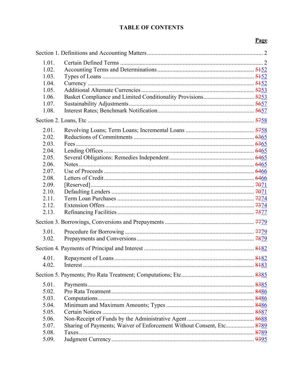 TABLE OF CONTENTS Page Section 1. Definitions and Accounting Matters .............................................................................. 2 1.01. Certain Defined Terms ................................................................................................ 2 1.02. Accounting Terms and Determinations ................................................................. 5152 1.03. Types of Loans ...................................................................................................... 5152 1.04. Currency ................................................................................................................ 5152 1.05. Additional Alternate Currencies ............................................................................ 5253 1.06. Basket Compliance and Limited Conditionality Provisions .................................. 5253 1.07. Sustainability Adjustments .................................................................................... 5657 1.08. Interest Rates; Benchmark Notification ................................................................. 5657 Section 2. Loans, Etc ................................................................................................................ 5758 2.01. Revolving Loans; Term Loans; Incremental Loans .............................................. 5758 2.02. Reductions of Commitments ................................................................................. 6365 2.03. Fees ........................................................................................................................ 6365 2.04. Lending Offices ..................................................................................................... 6465 2.05. Several Obligations: Remedies Independent ......................................................... 6465 2.06. Notes ...................................................................................................................... 6465 2.07. Use of Proceeds ..................................................................................................... 6466 2.08. Letters of Credit ..................................................................................................... 6466 2.09. [Reserved] .............................................................................................................. 7071 2.10. Defaulting Lenders ................................................................................................ 7071 2.11. Term Loan Purchases ............................................................................................ 7274 2.12. Extension Offers .................................................................................................... 7374 2.13. Refinancing Facilities ............................................................................................ 7577 Section 3. Borrowings, Conversions and Prepayments ............................................................ 7779 3.01. Procedure for Borrowing ....................................................................................... 7779 3.02. Prepayments and Conversions ............................................................................... 7879 Section 4. Payments of Principal and Interest .......................................................................... 8182 4.01. Repayment of Loans .............................................................................................. 8182 4.02. Interest ................................................................................................................... 8183 Section 5. Payments; Pro Rata Treatment; Computations; Etc ................................................. 8385 5.01. Payments ................................................................................................................ 8385 5.02. Pro Rata Treatment ................................................................................................ 8486 5.03. Computations ......................................................................................................... 8486 5.04. Minimum and Maximum Amounts; Types ........................................................... 8486 5.05. Certain Notices ...................................................................................................... 8587 5.06. Non-Receipt of Funds by the Administrative Agent ............................................. 8688 5.07. Sharing of Payments; Waiver of Enforcement Without Consent, Etc ................... 8789 5.08. Taxes ...................................................................................................................... 8789 5.09. Judgment Currency ................................................................................................ 9395