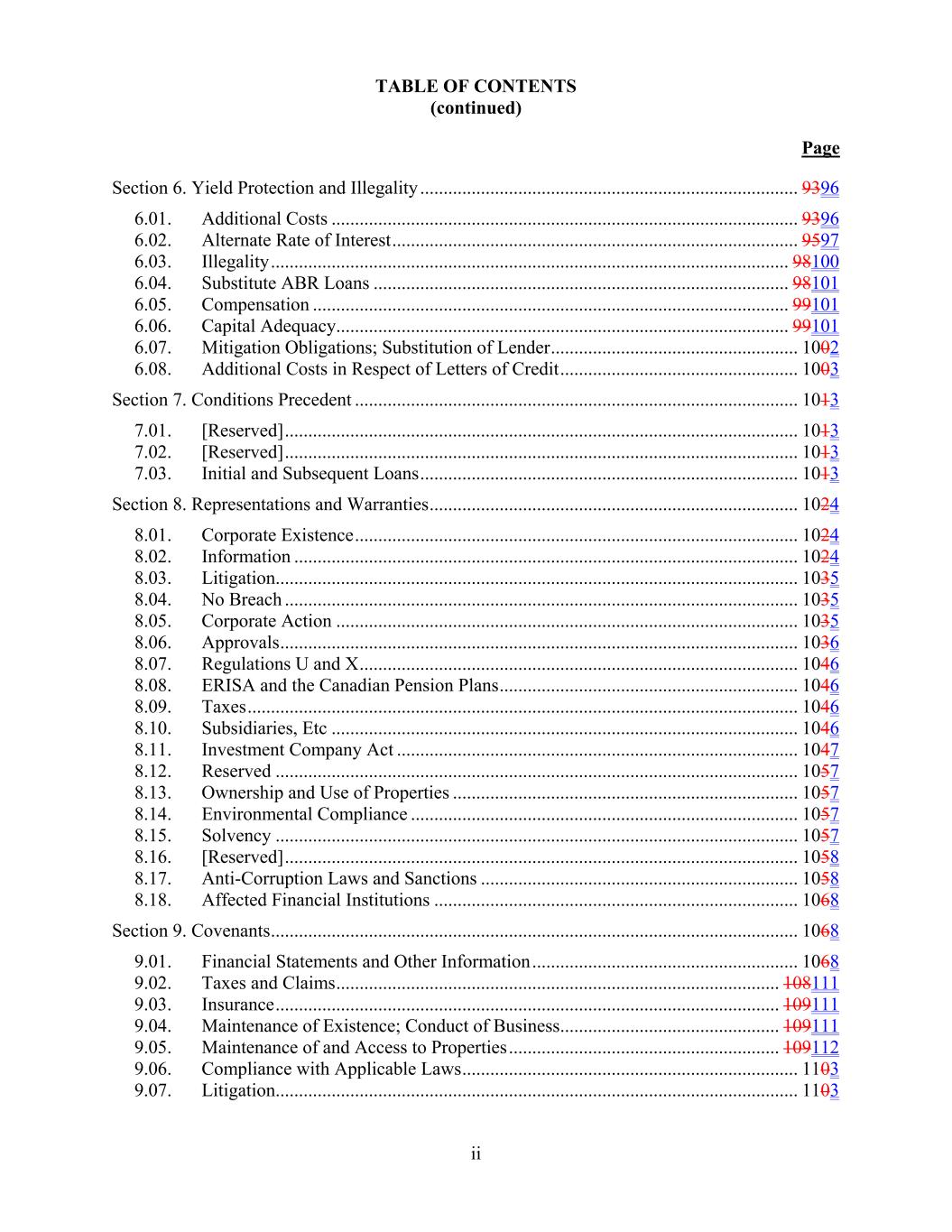 TABLE OF CONTENTS (continued) Page ii Section 6. Yield Protection and Illegality ................................................................................. 9396 6.01. Additional Costs .................................................................................................... 9396 6.02. Alternate Rate of Interest ....................................................................................... 9597 6.03. Illegality ............................................................................................................... 98100 6.04. Substitute ABR Loans ......................................................................................... 98101 6.05. Compensation ...................................................................................................... 99101 6.06. Capital Adequacy ................................................................................................. 99101 6.07. Mitigation Obligations; Substitution of Lender ..................................................... 1002 6.08. Additional Costs in Respect of Letters of Credit ................................................... 1003 Section 7. Conditions Precedent ............................................................................................... 1013 7.01. [Reserved] .............................................................................................................. 1013 7.02. [Reserved] .............................................................................................................. 1013 7.03. Initial and Subsequent Loans ................................................................................. 1013 Section 8. Representations and Warranties ............................................................................... 1024 8.01. Corporate Existence ............................................................................................... 1024 8.02. Information ............................................................................................................ 1024 8.03. Litigation ................................................................................................................ 1035 8.04. No Breach .............................................................................................................. 1035 8.05. Corporate Action ................................................................................................... 1035 8.06. Approvals ............................................................................................................... 1036 8.07. Regulations U and X .............................................................................................. 1046 8.08. ERISA and the Canadian Pension Plans ................................................................ 1046 8.09. Taxes ...................................................................................................................... 1046 8.10. Subsidiaries, Etc .................................................................................................... 1046 8.11. Investment Company Act ...................................................................................... 1047 8.12. Reserved ................................................................................................................ 1057 8.13. Ownership and Use of Properties .......................................................................... 1057 8.14. Environmental Compliance ................................................................................... 1057 8.15. Solvency ................................................................................................................ 1057 8.16. [Reserved] .............................................................................................................. 1058 8.17. Anti-Corruption Laws and Sanctions .................................................................... 1058 8.18. Affected Financial Institutions .............................................................................. 1068 Section 9. Covenants ................................................................................................................. 1068 9.01. Financial Statements and Other Information ......................................................... 1068 9.02. Taxes and Claims ............................................................................................... 108111 9.03. Insurance ............................................................................................................ 109111 9.04. Maintenance of Existence; Conduct of Business ............................................... 109111 9.05. Maintenance of and Access to Properties .......................................................... 109112 9.06. Compliance with Applicable Laws ........................................................................ 1103 9.07. Litigation ................................................................................................................ 1103