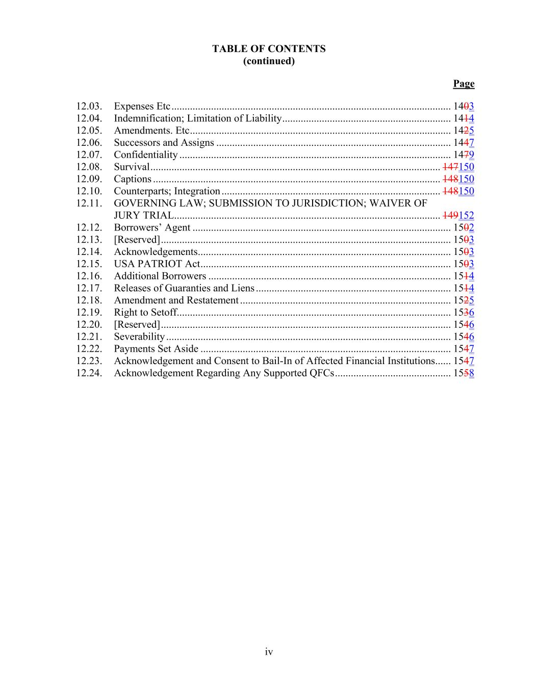 TABLE OF CONTENTS (continued) Page iv 12.03. Expenses Etc .......................................................................................................... 1403 12.04. Indemnification; Limitation of Liability ................................................................ 1414 12.05. Amendments. Etc ................................................................................................... 1425 12.06. Successors and Assigns ......................................................................................... 1447 12.07. Confidentiality ....................................................................................................... 1479 12.08. Survival .............................................................................................................. 147150 12.09. Captions ............................................................................................................. 148150 12.10. Counterparts; Integration ................................................................................... 148150 12.11. GOVERNING LAW; SUBMISSION TO JURISDICTION; WAIVER OF JURY TRIAL ..................................................................................................... 149152 12.12. Borrowers’ Agent .................................................................................................. 1502 12.13. [Reserved] .............................................................................................................. 1503 12.14. Acknowledgements ................................................................................................ 1503 12.15. USA PATRIOT Act ............................................................................................... 1503 12.16. Additional Borrowers ............................................................................................ 1514 12.17. Releases of Guaranties and Liens .......................................................................... 1514 12.18. Amendment and Restatement ................................................................................ 1525 12.19. Right to Setoff ........................................................................................................ 1536 12.20. [Reserved] .............................................................................................................. 1546 12.21. Severability ............................................................................................................ 1546 12.22. Payments Set Aside ............................................................................................... 1547 12.23. Acknowledgement and Consent to Bail-In of Affected Financial Institutions ...... 1547 12.24. Acknowledgement Regarding Any Supported QFCs ............................................ 1558