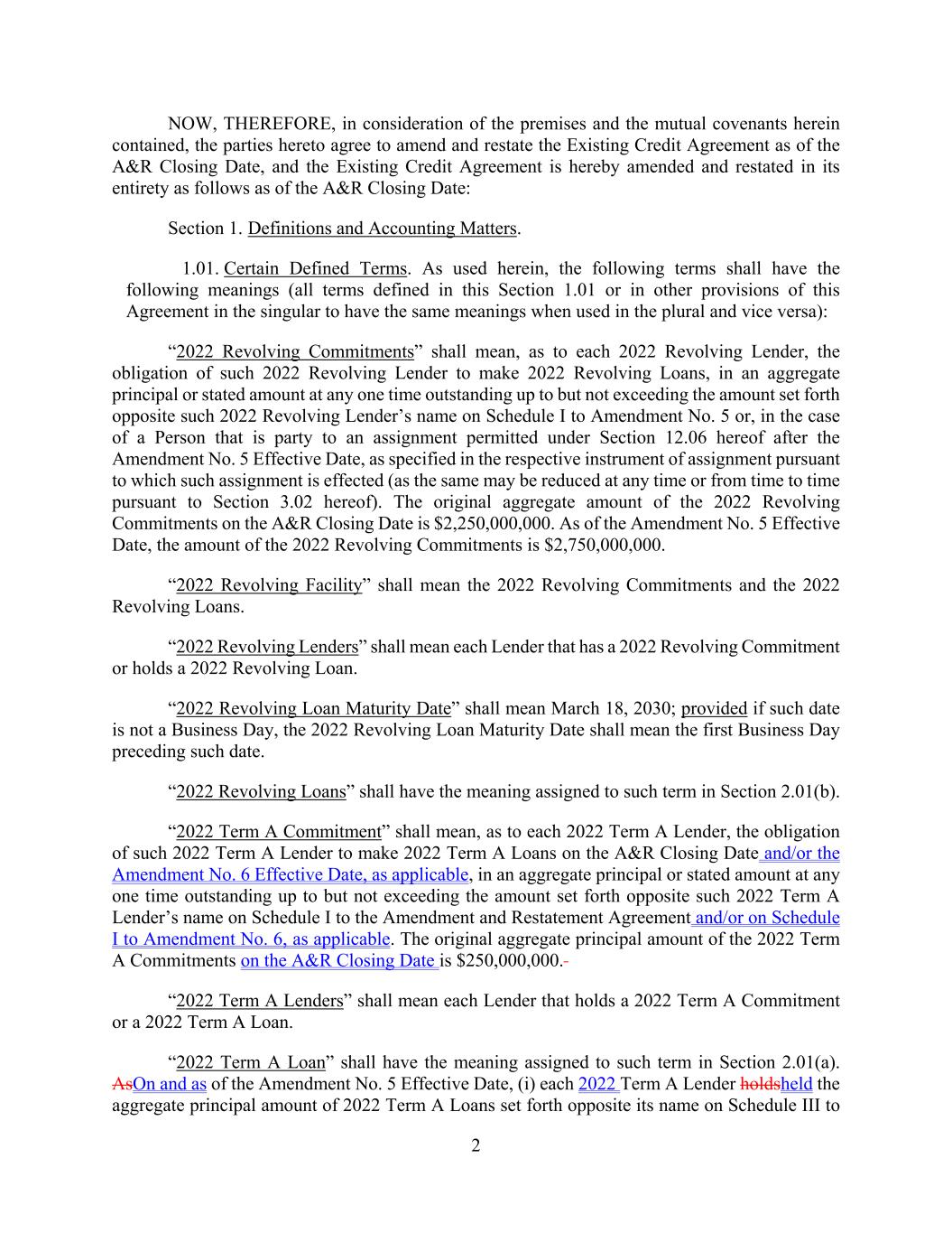2 NOW, THEREFORE, in consideration of the premises and the mutual covenants herein contained, the parties hereto agree to amend and restate the Existing Credit Agreement as of the A&R Closing Date, and the Existing Credit Agreement is hereby amended and restated in its entirety as follows as of the A&R Closing Date: Section 1. Definitions and Accounting Matters. 1.01. Certain Defined Terms. As used herein, the following terms shall have the following meanings (all terms defined in this Section 1.01 or in other provisions of this Agreement in the singular to have the same meanings when used in the plural and vice versa): “2022 Revolving Commitments” shall mean, as to each 2022 Revolving Lender, the obligation of such 2022 Revolving Lender to make 2022 Revolving Loans, in an aggregate principal or stated amount at any one time outstanding up to but not exceeding the amount set forth opposite such 2022 Revolving Lender’s name on Schedule I to Amendment No. 5 or, in the case of a Person that is party to an assignment permitted under Section 12.06 hereof after the Amendment No. 5 Effective Date, as specified in the respective instrument of assignment pursuant to which such assignment is effected (as the same may be reduced at any time or from time to time pursuant to Section 3.02 hereof). The original aggregate amount of the 2022 Revolving Commitments on the A&R Closing Date is $2,250,000,000. As of the Amendment No. 5 Effective Date, the amount of the 2022 Revolving Commitments is $2,750,000,000. “2022 Revolving Facility” shall mean the 2022 Revolving Commitments and the 2022 Revolving Loans. “2022 Revolving Lenders” shall mean each Lender that has a 2022 Revolving Commitment or holds a 2022 Revolving Loan. “2022 Revolving Loan Maturity Date” shall mean March 18, 2030; provided if such date is not a Business Day, the 2022 Revolving Loan Maturity Date shall mean the first Business Day preceding such date. “2022 Revolving Loans” shall have the meaning assigned to such term in Section 2.01(b). “2022 Term A Commitment” shall mean, as to each 2022 Term A Lender, the obligation of such 2022 Term A Lender to make 2022 Term A Loans on the A&R Closing Date and/or the Amendment No. 6 Effective Date, as applicable, in an aggregate principal or stated amount at any one time outstanding up to but not exceeding the amount set forth opposite such 2022 Term A Lender’s name on Schedule I to the Amendment and Restatement Agreement and/or on Schedule I to Amendment No. 6, as applicable. The original aggregate principal amount of the 2022 Term A Commitments on the A&R Closing Date is $250,000,000. “2022 Term A Lenders” shall mean each Lender that holds a 2022 Term A Commitment or a 2022 Term A Loan. “2022 Term A Loan” shall have the meaning assigned to such term in Section 2.01(a). AsOn and as of the Amendment No. 5 Effective Date, (i) each 2022 Term A Lender holdsheld the aggregate principal amount of 2022 Term A Loans set forth opposite its name on Schedule III to