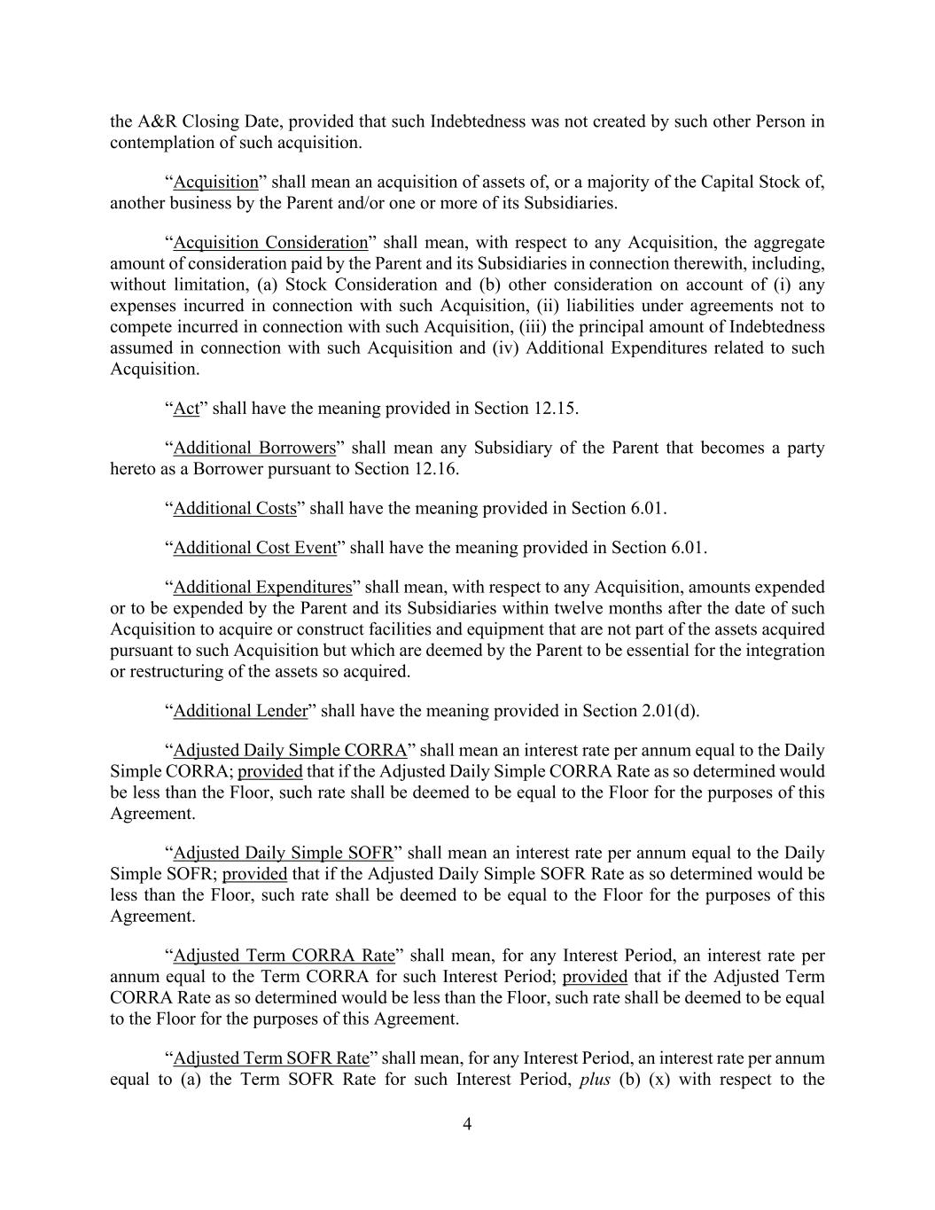 4 the A&R Closing Date, provided that such Indebtedness was not created by such other Person in contemplation of such acquisition. “Acquisition” shall mean an acquisition of assets of, or a majority of the Capital Stock of, another business by the Parent and/or one or more of its Subsidiaries. “Acquisition Consideration” shall mean, with respect to any Acquisition, the aggregate amount of consideration paid by the Parent and its Subsidiaries in connection therewith, including, without limitation, (a) Stock Consideration and (b) other consideration on account of (i) any expenses incurred in connection with such Acquisition, (ii) liabilities under agreements not to compete incurred in connection with such Acquisition, (iii) the principal amount of Indebtedness assumed in connection with such Acquisition and (iv) Additional Expenditures related to such Acquisition. “Act” shall have the meaning provided in Section 12.15. “Additional Borrowers” shall mean any Subsidiary of the Parent that becomes a party hereto as a Borrower pursuant to Section 12.16. “Additional Costs” shall have the meaning provided in Section 6.01. “Additional Cost Event” shall have the meaning provided in Section 6.01. “Additional Expenditures” shall mean, with respect to any Acquisition, amounts expended or to be expended by the Parent and its Subsidiaries within twelve months after the date of such Acquisition to acquire or construct facilities and equipment that are not part of the assets acquired pursuant to such Acquisition but which are deemed by the Parent to be essential for the integration or restructuring of the assets so acquired. “Additional Lender” shall have the meaning provided in Section 2.01(d). “Adjusted Daily Simple CORRA” shall mean an interest rate per annum equal to the Daily Simple CORRA; provided that if the Adjusted Daily Simple CORRA Rate as so determined would be less than the Floor, such rate shall be deemed to be equal to the Floor for the purposes of this Agreement. “Adjusted Daily Simple SOFR” shall mean an interest rate per annum equal to the Daily Simple SOFR; provided that if the Adjusted Daily Simple SOFR Rate as so determined would be less than the Floor, such rate shall be deemed to be equal to the Floor for the purposes of this Agreement. “Adjusted Term CORRA Rate” shall mean, for any Interest Period, an interest rate per annum equal to the Term CORRA for such Interest Period; provided that if the Adjusted Term CORRA Rate as so determined would be less than the Floor, such rate shall be deemed to be equal to the Floor for the purposes of this Agreement. “Adjusted Term SOFR Rate” shall mean, for any Interest Period, an interest rate per annum equal to (a) the Term SOFR Rate for such Interest Period, plus (b) (x) with respect to the