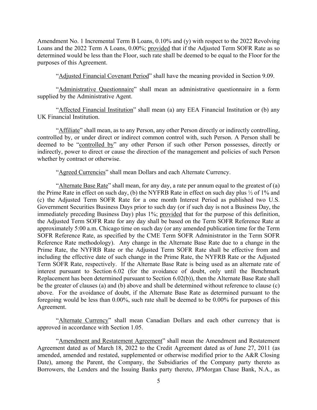 5 Amendment No. 1 Incremental Term B Loans, 0.10% and (y) with respect to the 2022 Revolving Loans and the 2022 Term A Loans, 0.00%; provided that if the Adjusted Term SOFR Rate as so determined would be less than the Floor, such rate shall be deemed to be equal to the Floor for the purposes of this Agreement. “Adjusted Financial Covenant Period” shall have the meaning provided in Section 9.09. “Administrative Questionnaire” shall mean an administrative questionnaire in a form supplied by the Administrative Agent. “Affected Financial Institution” shall mean (a) any EEA Financial Institution or (b) any UK Financial Institution. “Affiliate” shall mean, as to any Person, any other Person directly or indirectly controlling, controlled by, or under direct or indirect common control with, such Person. A Person shall be deemed to be “controlled by” any other Person if such other Person possesses, directly or indirectly, power to direct or cause the direction of the management and policies of such Person whether by contract or otherwise. “Agreed Currencies” shall mean Dollars and each Alternate Currency. “Alternate Base Rate” shall mean, for any day, a rate per annum equal to the greatest of (a) the Prime Rate in effect on such day, (b) the NYFRB Rate in effect on such day plus ½ of 1% and (c) the Adjusted Term SOFR Rate for a one month Interest Period as published two U.S. Government Securities Business Days prior to such day (or if such day is not a Business Day, the immediately preceding Business Day) plus 1%; provided that for the purpose of this definition, the Adjusted Term SOFR Rate for any day shall be based on the Term SOFR Reference Rate at approximately 5:00 a.m. Chicago time on such day (or any amended publication time for the Term SOFR Reference Rate, as specified by the CME Term SOFR Administrator in the Term SOFR Reference Rate methodology). Any change in the Alternate Base Rate due to a change in the Prime Rate, the NYFRB Rate or the Adjusted Term SOFR Rate shall be effective from and including the effective date of such change in the Prime Rate, the NYFRB Rate or the Adjusted Term SOFR Rate, respectively. If the Alternate Base Rate is being used as an alternate rate of interest pursuant to Section 6.02 (for the avoidance of doubt, only until the Benchmark Replacement has been determined pursuant to Section 6.02(b)), then the Alternate Base Rate shall be the greater of clauses (a) and (b) above and shall be determined without reference to clause (c) above. For the avoidance of doubt, if the Alternate Base Rate as determined pursuant to the foregoing would be less than 0.00%, such rate shall be deemed to be 0.00% for purposes of this Agreement. “Alternate Currency” shall mean Canadian Dollars and each other currency that is approved in accordance with Section 1.05. “Amendment and Restatement Agreement” shall mean the Amendment and Restatement Agreement dated as of March 18, 2022 to the Credit Agreement dated as of June 27, 2011 (as amended, amended and restated, supplemented or otherwise modified prior to the A&R Closing Date), among the Parent, the Company, the Subsidiaries of the Company party thereto as Borrowers, the Lenders and the Issuing Banks party thereto, JPMorgan Chase Bank, N.A., as