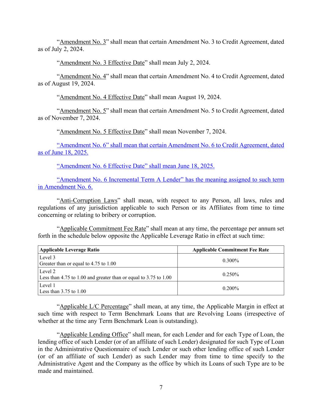 7 “Amendment No. 3” shall mean that certain Amendment No. 3 to Credit Agreement, dated as of July 2, 2024. “Amendment No. 3 Effective Date” shall mean July 2, 2024. “Amendment No. 4” shall mean that certain Amendment No. 4 to Credit Agreement, dated as of August 19, 2024. “Amendment No. 4 Effective Date” shall mean August 19, 2024. “Amendment No. 5” shall mean that certain Amendment No. 5 to Credit Agreement, dated as of November 7, 2024. “Amendment No. 5 Effective Date” shall mean November 7, 2024. “Amendment No. 6” shall mean that certain Amendment No. 6 to Credit Agreement, dated as of June 18, 2025. “Amendment No. 6 Effective Date” shall mean June 18, 2025. “Amendment No. 6 Incremental Term A Lender” has the meaning assigned to such term in Amendment No. 6. “Anti-Corruption Laws” shall mean, with respect to any Person, all laws, rules and regulations of any jurisdiction applicable to such Person or its Affiliates from time to time concerning or relating to bribery or corruption. “Applicable Commitment Fee Rate” shall mean at any time, the percentage per annum set forth in the schedule below opposite the Applicable Leverage Ratio in effect at such time: Applicable Leverage Ratio Applicable Commitment Fee Rate Level 3 Greater than or equal to 4.75 to 1.00 0.300% Level 2 Less than 4.75 to 1.00 and greater than or equal to 3.75 to 1.00 0.250% Level 1 Less than 3.75 to 1.00 0.200% “Applicable L/C Percentage” shall mean, at any time, the Applicable Margin in effect at such time with respect to Term Benchmark Loans that are Revolving Loans (irrespective of whether at the time any Term Benchmark Loan is outstanding). “Applicable Lending Office” shall mean, for each Lender and for each Type of Loan, the lending office of such Lender (or of an affiliate of such Lender) designated for such Type of Loan in the Administrative Questionnaire of such Lender or such other lending office of such Lender (or of an affiliate of such Lender) as such Lender may from time to time specify to the Administrative Agent and the Company as the office by which its Loans of such Type are to be made and maintained.