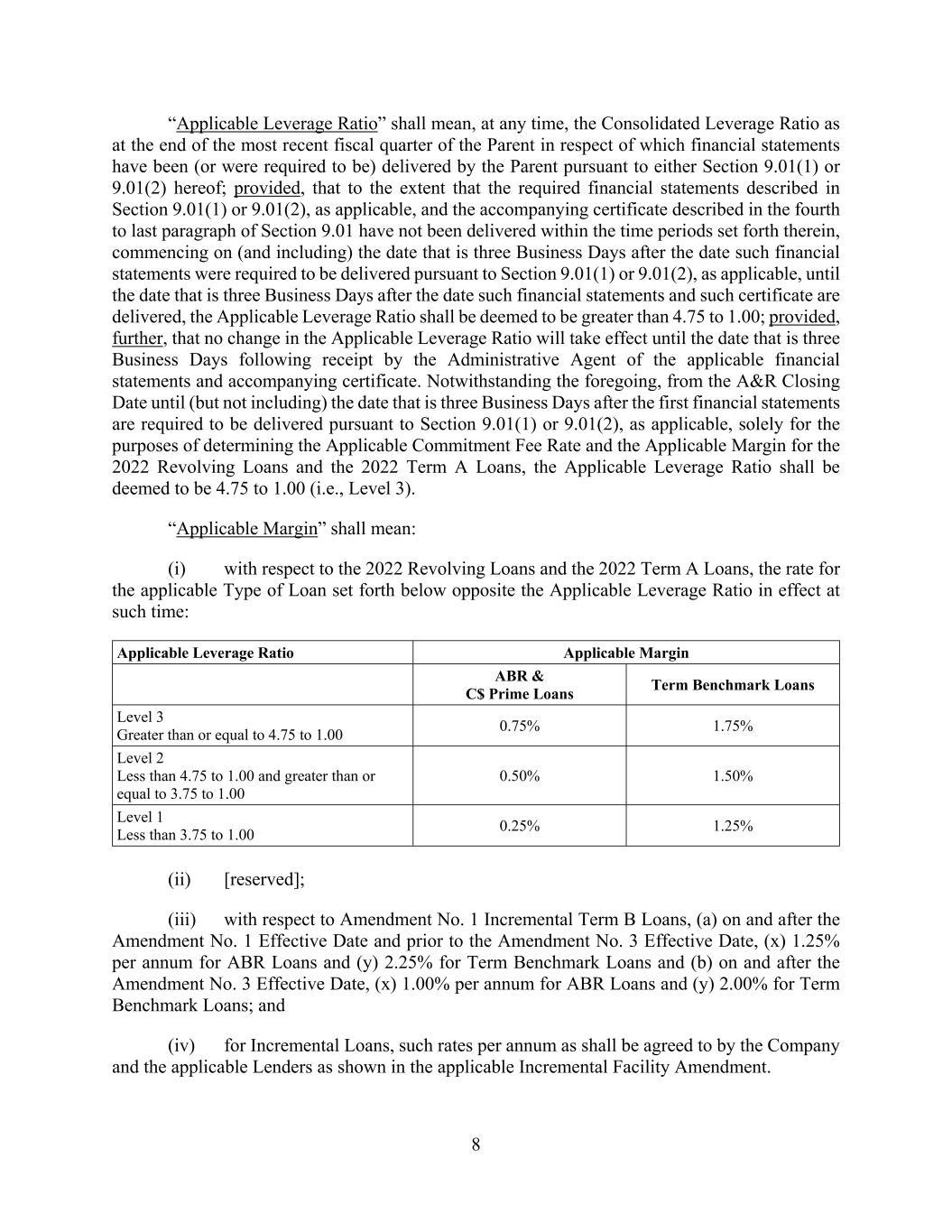 8 “Applicable Leverage Ratio” shall mean, at any time, the Consolidated Leverage Ratio as at the end of the most recent fiscal quarter of the Parent in respect of which financial statements have been (or were required to be) delivered by the Parent pursuant to either Section 9.01(1) or 9.01(2) hereof; provided, that to the extent that the required financial statements described in Section 9.01(1) or 9.01(2), as applicable, and the accompanying certificate described in the fourth to last paragraph of Section 9.01 have not been delivered within the time periods set forth therein, commencing on (and including) the date that is three Business Days after the date such financial statements were required to be delivered pursuant to Section 9.01(1) or 9.01(2), as applicable, until the date that is three Business Days after the date such financial statements and such certificate are delivered, the Applicable Leverage Ratio shall be deemed to be greater than 4.75 to 1.00; provided, further, that no change in the Applicable Leverage Ratio will take effect until the date that is three Business Days following receipt by the Administrative Agent of the applicable financial statements and accompanying certificate. Notwithstanding the foregoing, from the A&R Closing Date until (but not including) the date that is three Business Days after the first financial statements are required to be delivered pursuant to Section 9.01(1) or 9.01(2), as applicable, solely for the purposes of determining the Applicable Commitment Fee Rate and the Applicable Margin for the 2022 Revolving Loans and the 2022 Term A Loans, the Applicable Leverage Ratio shall be deemed to be 4.75 to 1.00 (i.e., Level 3). “Applicable Margin” shall mean: (i) with respect to the 2022 Revolving Loans and the 2022 Term A Loans, the rate for the applicable Type of Loan set forth below opposite the Applicable Leverage Ratio in effect at such time: Applicable Leverage Ratio Applicable Margin ABR & C$ Prime Loans Term Benchmark Loans Level 3 Greater than or equal to 4.75 to 1.00 0.75% 1.75% Level 2 Less than 4.75 to 1.00 and greater than or equal to 3.75 to 1.00 0.50% 1.50% Level 1 Less than 3.75 to 1.00 0.25% 1.25% (ii) [reserved]; (iii) with respect to Amendment No. 1 Incremental Term B Loans, (a) on and after the Amendment No. 1 Effective Date and prior to the Amendment No. 3 Effective Date, (x) 1.25% per annum for ABR Loans and (y) 2.25% for Term Benchmark Loans and (b) on and after the Amendment No. 3 Effective Date, (x) 1.00% per annum for ABR Loans and (y) 2.00% for Term Benchmark Loans; and (iv) for Incremental Loans, such rates per annum as shall be agreed to by the Company and the applicable Lenders as shown in the applicable Incremental Facility Amendment.