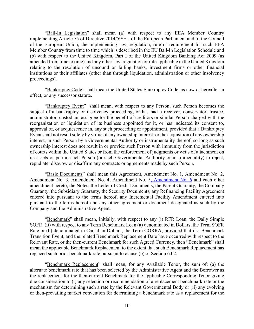 10 “Bail-In Legislation” shall mean (a) with respect to any EEA Member Country implementing Article 55 of Directive 2014/59/EU of the European Parliament and of the Council of the European Union, the implementing law, regulation, rule or requirement for such EEA Member Country from time to time which is described in the EU Bail-In Legislation Schedule and (b) with respect to the United Kingdom, Part I of the United Kingdom Banking Act 2009 (as amended from time to time) and any other law, regulation or rule applicable in the United Kingdom relating to the resolution of unsound or failing banks, investment firms or other financial institutions or their affiliates (other than through liquidation, administration or other insolvency proceedings). “Bankruptcy Code” shall mean the United States Bankruptcy Code, as now or hereafter in effect, or any successor statute. “Bankruptcy Event” shall mean, with respect to any Person, such Person becomes the subject of a bankruptcy or insolvency proceeding, or has had a receiver, conservator, trustee, administrator, custodian, assignee for the benefit of creditors or similar Person charged with the reorganization or liquidation of its business appointed for it, or has indicated its consent to, approval of, or acquiescence in, any such proceeding or appointment, provided that a Bankruptcy Event shall not result solely by virtue of any ownership interest, or the acquisition of any ownership interest, in such Person by a Governmental Authority or instrumentality thereof, so long as such ownership interest does not result in or provide such Person with immunity from the jurisdiction of courts within the United States or from the enforcement of judgments or writs of attachment on its assets or permit such Person (or such Governmental Authority or instrumentality) to reject, repudiate, disavow or disaffirm any contracts or agreements made by such Person. “Basic Documents” shall mean this Agreement, Amendment No. 1, Amendment No. 2, Amendment No. 3, Amendment No. 4, Amendment No. 5, Amendment No. 6 and each other amendment hereto, the Notes, the Letter of Credit Documents, the Parent Guaranty, the Company Guaranty, the Subsidiary Guaranty, the Security Documents, any Refinancing Facility Agreement entered into pursuant to the terms hereof, any Incremental Facility Amendment entered into pursuant to the terms hereof and any other agreement or document designated as such by the Company and the Administrative Agent. “Benchmark” shall mean, initially, with respect to any (i) RFR Loan, the Daily Simple SOFR, (ii) with respect to any Term Benchmark Loan (a) denominated in Dollars, the Term SOFR Rate or (b) denominated in Canadian Dollars, the Term CORRA; provided that if a Benchmark Transition Event, and the related Benchmark Replacement Date have occurred with respect to the Relevant Rate, or the then-current Benchmark for such Agreed Currency, then “Benchmark” shall mean the applicable Benchmark Replacement to the extent that such Benchmark Replacement has replaced such prior benchmark rate pursuant to clause (b) of Section 6.02. “Benchmark Replacement” shall mean, for any Available Tenor, the sum of: (a) the alternate benchmark rate that has been selected by the Administrative Agent and the Borrower as the replacement for the then-current Benchmark for the applicable Corresponding Tenor giving due consideration to (i) any selection or recommendation of a replacement benchmark rate or the mechanism for determining such a rate by the Relevant Governmental Body or (ii) any evolving or then-prevailing market convention for determining a benchmark rate as a replacement for the