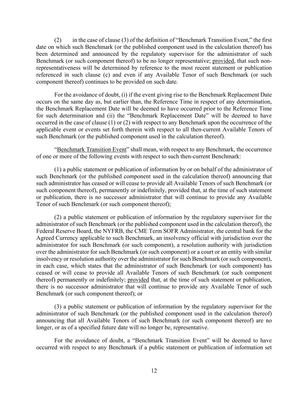 12 (2) in the case of clause (3) of the definition of “Benchmark Transition Event,” the first date on which such Benchmark (or the published component used in the calculation thereof) has been determined and announced by the regulatory supervisor for the administrator of such Benchmark (or such component thereof) to be no longer representative; provided, that such non- representativeness will be determined by reference to the most recent statement or publication referenced in such clause (c) and even if any Available Tenor of such Benchmark (or such component thereof) continues to be provided on such date. For the avoidance of doubt, (i) if the event giving rise to the Benchmark Replacement Date occurs on the same day as, but earlier than, the Reference Time in respect of any determination, the Benchmark Replacement Date will be deemed to have occurred prior to the Reference Time for such determination and (ii) the “Benchmark Replacement Date” will be deemed to have occurred in the case of clause (1) or (2) with respect to any Benchmark upon the occurrence of the applicable event or events set forth therein with respect to all then-current Available Tenors of such Benchmark (or the published component used in the calculation thereof). “Benchmark Transition Event” shall mean, with respect to any Benchmark, the occurrence of one or more of the following events with respect to such then-current Benchmark: (1) a public statement or publication of information by or on behalf of the administrator of such Benchmark (or the published component used in the calculation thereof) announcing that such administrator has ceased or will cease to provide all Available Tenors of such Benchmark (or such component thereof), permanently or indefinitely, provided that, at the time of such statement or publication, there is no successor administrator that will continue to provide any Available Tenor of such Benchmark (or such component thereof); (2) a public statement or publication of information by the regulatory supervisor for the administrator of such Benchmark (or the published component used in the calculation thereof), the Federal Reserve Board, the NYFRB, the CME Term SOFR Administrator, the central bank for the Agreed Currency applicable to such Benchmark, an insolvency official with jurisdiction over the administrator for such Benchmark (or such component), a resolution authority with jurisdiction over the administrator for such Benchmark (or such component) or a court or an entity with similar insolvency or resolution authority over the administrator for such Benchmark (or such component), in each case, which states that the administrator of such Benchmark (or such component) has ceased or will cease to provide all Available Tenors of such Benchmark (or such component thereof) permanently or indefinitely; provided that, at the time of such statement or publication, there is no successor administrator that will continue to provide any Available Tenor of such Benchmark (or such component thereof); or (3) a public statement or publication of information by the regulatory supervisor for the administrator of such Benchmark (or the published component used in the calculation thereof) announcing that all Available Tenors of such Benchmark (or such component thereof) are no longer, or as of a specified future date will no longer be, representative. For the avoidance of doubt, a “Benchmark Transition Event” will be deemed to have occurred with respect to any Benchmark if a public statement or publication of information set