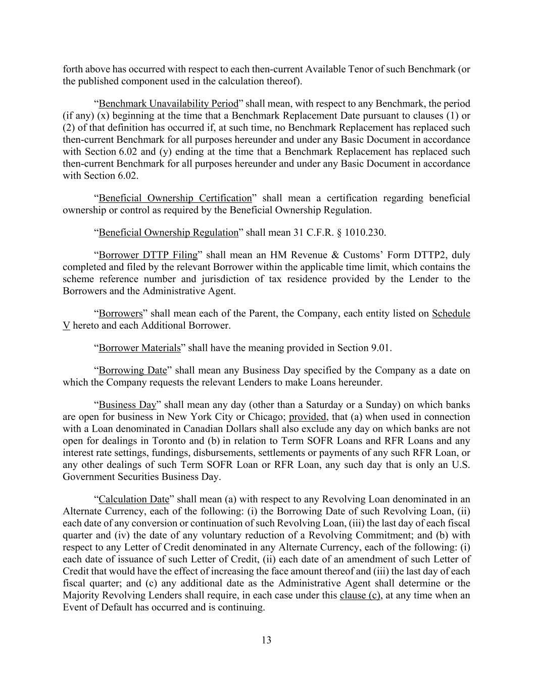 13 forth above has occurred with respect to each then-current Available Tenor of such Benchmark (or the published component used in the calculation thereof). “Benchmark Unavailability Period” shall mean, with respect to any Benchmark, the period (if any) (x) beginning at the time that a Benchmark Replacement Date pursuant to clauses (1) or (2) of that definition has occurred if, at such time, no Benchmark Replacement has replaced such then-current Benchmark for all purposes hereunder and under any Basic Document in accordance with Section 6.02 and (y) ending at the time that a Benchmark Replacement has replaced such then-current Benchmark for all purposes hereunder and under any Basic Document in accordance with Section 6.02. “Beneficial Ownership Certification” shall mean a certification regarding beneficial ownership or control as required by the Beneficial Ownership Regulation. “Beneficial Ownership Regulation” shall mean 31 C.F.R. § 1010.230. “Borrower DTTP Filing” shall mean an HM Revenue & Customs’ Form DTTP2, duly completed and filed by the relevant Borrower within the applicable time limit, which contains the scheme reference number and jurisdiction of tax residence provided by the Lender to the Borrowers and the Administrative Agent. “Borrowers” shall mean each of the Parent, the Company, each entity listed on Schedule V hereto and each Additional Borrower. “Borrower Materials” shall have the meaning provided in Section 9.01. “Borrowing Date” shall mean any Business Day specified by the Company as a date on which the Company requests the relevant Lenders to make Loans hereunder. “Business Day” shall mean any day (other than a Saturday or a Sunday) on which banks are open for business in New York City or Chicago; provided, that (a) when used in connection with a Loan denominated in Canadian Dollars shall also exclude any day on which banks are not open for dealings in Toronto and (b) in relation to Term SOFR Loans and RFR Loans and any interest rate settings, fundings, disbursements, settlements or payments of any such RFR Loan, or any other dealings of such Term SOFR Loan or RFR Loan, any such day that is only an U.S. Government Securities Business Day. “Calculation Date” shall mean (a) with respect to any Revolving Loan denominated in an Alternate Currency, each of the following: (i) the Borrowing Date of such Revolving Loan, (ii) each date of any conversion or continuation of such Revolving Loan, (iii) the last day of each fiscal quarter and (iv) the date of any voluntary reduction of a Revolving Commitment; and (b) with respect to any Letter of Credit denominated in any Alternate Currency, each of the following: (i) each date of issuance of such Letter of Credit, (ii) each date of an amendment of such Letter of Credit that would have the effect of increasing the face amount thereof and (iii) the last day of each fiscal quarter; and (c) any additional date as the Administrative Agent shall determine or the Majority Revolving Lenders shall require, in each case under this clause (c), at any time when an Event of Default has occurred and is continuing.