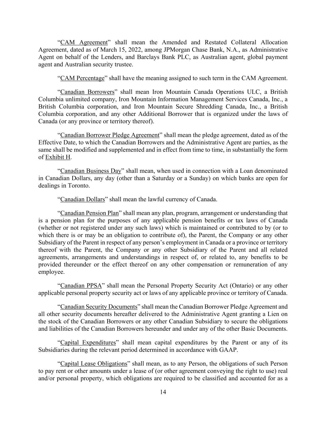 14 “CAM Agreement” shall mean the Amended and Restated Collateral Allocation Agreement, dated as of March 15, 2022, among JPMorgan Chase Bank, N.A., as Administrative Agent on behalf of the Lenders, and Barclays Bank PLC, as Australian agent, global payment agent and Australian security trustee. “CAM Percentage” shall have the meaning assigned to such term in the CAM Agreement. “Canadian Borrowers” shall mean Iron Mountain Canada Operations ULC, a British Columbia unlimited company, Iron Mountain Information Management Services Canada, Inc., a British Columbia corporation, and Iron Mountain Secure Shredding Canada, Inc., a British Columbia corporation, and any other Additional Borrower that is organized under the laws of Canada (or any province or territory thereof). “Canadian Borrower Pledge Agreement” shall mean the pledge agreement, dated as of the Effective Date, to which the Canadian Borrowers and the Administrative Agent are parties, as the same shall be modified and supplemented and in effect from time to time, in substantially the form of Exhibit H. “Canadian Business Day” shall mean, when used in connection with a Loan denominated in Canadian Dollars, any day (other than a Saturday or a Sunday) on which banks are open for dealings in Toronto. “Canadian Dollars” shall mean the lawful currency of Canada. “Canadian Pension Plan” shall mean any plan, program, arrangement or understanding that is a pension plan for the purposes of any applicable pension benefits or tax laws of Canada (whether or not registered under any such laws) which is maintained or contributed to by (or to which there is or may be an obligation to contribute of), the Parent, the Company or any other Subsidiary of the Parent in respect of any person’s employment in Canada or a province or territory thereof with the Parent, the Company or any other Subsidiary of the Parent and all related agreements, arrangements and understandings in respect of, or related to, any benefits to be provided thereunder or the effect thereof on any other compensation or remuneration of any employee. “Canadian PPSA” shall mean the Personal Property Security Act (Ontario) or any other applicable personal property security act or laws of any applicable province or territory of Canada. “Canadian Security Documents” shall mean the Canadian Borrower Pledge Agreement and all other security documents hereafter delivered to the Administrative Agent granting a Lien on the stock of the Canadian Borrowers or any other Canadian Subsidiary to secure the obligations and liabilities of the Canadian Borrowers hereunder and under any of the other Basic Documents. “Capital Expenditures” shall mean capital expenditures by the Parent or any of its Subsidiaries during the relevant period determined in accordance with GAAP. “Capital Lease Obligations” shall mean, as to any Person, the obligations of such Person to pay rent or other amounts under a lease of (or other agreement conveying the right to use) real and/or personal property, which obligations are required to be classified and accounted for as a