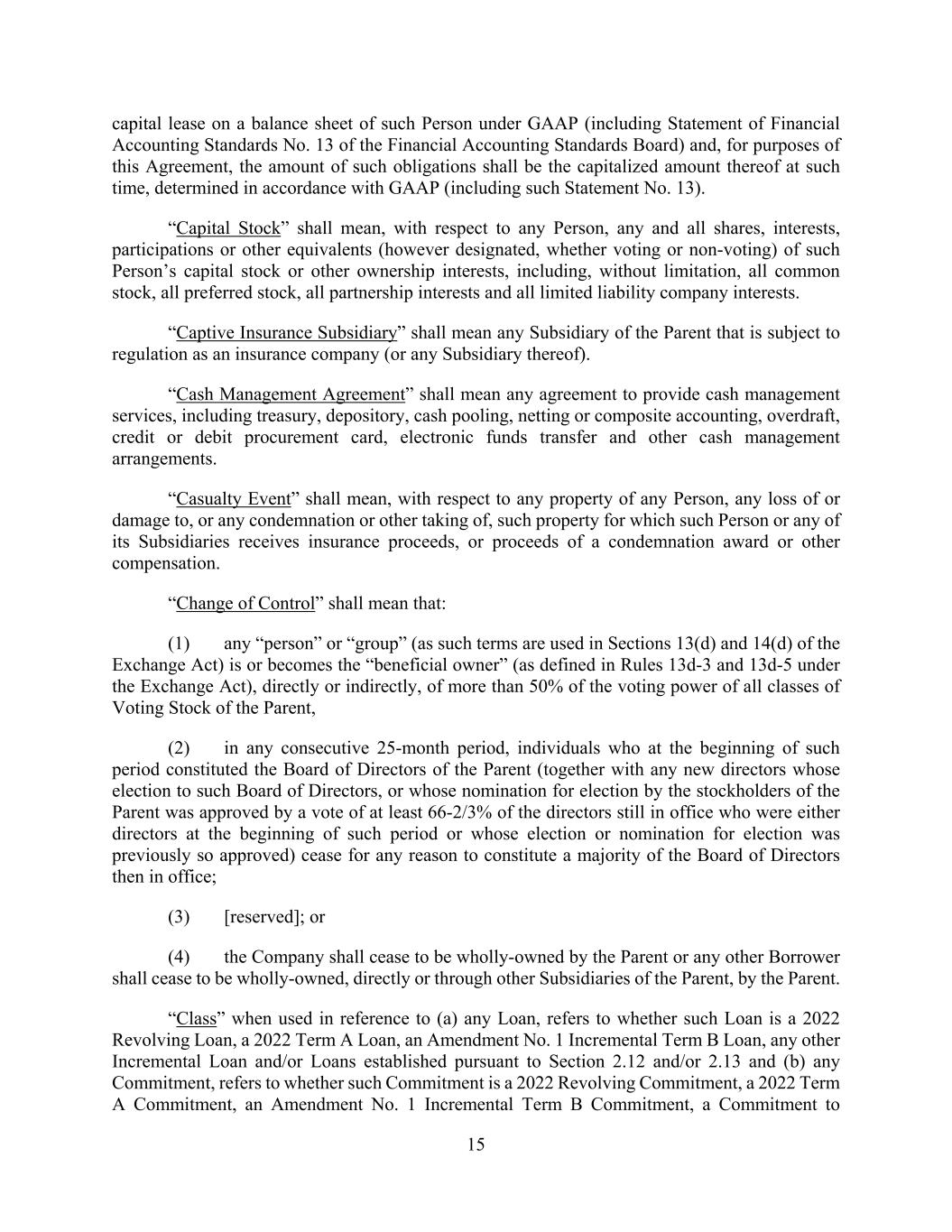 15 capital lease on a balance sheet of such Person under GAAP (including Statement of Financial Accounting Standards No. 13 of the Financial Accounting Standards Board) and, for purposes of this Agreement, the amount of such obligations shall be the capitalized amount thereof at such time, determined in accordance with GAAP (including such Statement No. 13). “Capital Stock” shall mean, with respect to any Person, any and all shares, interests, participations or other equivalents (however designated, whether voting or non-voting) of such Person’s capital stock or other ownership interests, including, without limitation, all common stock, all preferred stock, all partnership interests and all limited liability company interests. “Captive Insurance Subsidiary” shall mean any Subsidiary of the Parent that is subject to regulation as an insurance company (or any Subsidiary thereof). “Cash Management Agreement” shall mean any agreement to provide cash management services, including treasury, depository, cash pooling, netting or composite accounting, overdraft, credit or debit procurement card, electronic funds transfer and other cash management arrangements. “Casualty Event” shall mean, with respect to any property of any Person, any loss of or damage to, or any condemnation or other taking of, such property for which such Person or any of its Subsidiaries receives insurance proceeds, or proceeds of a condemnation award or other compensation. “Change of Control” shall mean that: (1) any “person” or “group” (as such terms are used in Sections 13(d) and 14(d) of the Exchange Act) is or becomes the “beneficial owner” (as defined in Rules 13d-3 and 13d-5 under the Exchange Act), directly or indirectly, of more than 50% of the voting power of all classes of Voting Stock of the Parent, (2) in any consecutive 25-month period, individuals who at the beginning of such period constituted the Board of Directors of the Parent (together with any new directors whose election to such Board of Directors, or whose nomination for election by the stockholders of the Parent was approved by a vote of at least 66-2/3% of the directors still in office who were either directors at the beginning of such period or whose election or nomination for election was previously so approved) cease for any reason to constitute a majority of the Board of Directors then in office; (3) [reserved]; or (4) the Company shall cease to be wholly-owned by the Parent or any other Borrower shall cease to be wholly-owned, directly or through other Subsidiaries of the Parent, by the Parent. “Class” when used in reference to (a) any Loan, refers to whether such Loan is a 2022 Revolving Loan, a 2022 Term A Loan, an Amendment No. 1 Incremental Term B Loan, any other Incremental Loan and/or Loans established pursuant to Section 2.12 and/or 2.13 and (b) any Commitment, refers to whether such Commitment is a 2022 Revolving Commitment, a 2022 Term A Commitment, an Amendment No. 1 Incremental Term B Commitment, a Commitment to